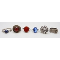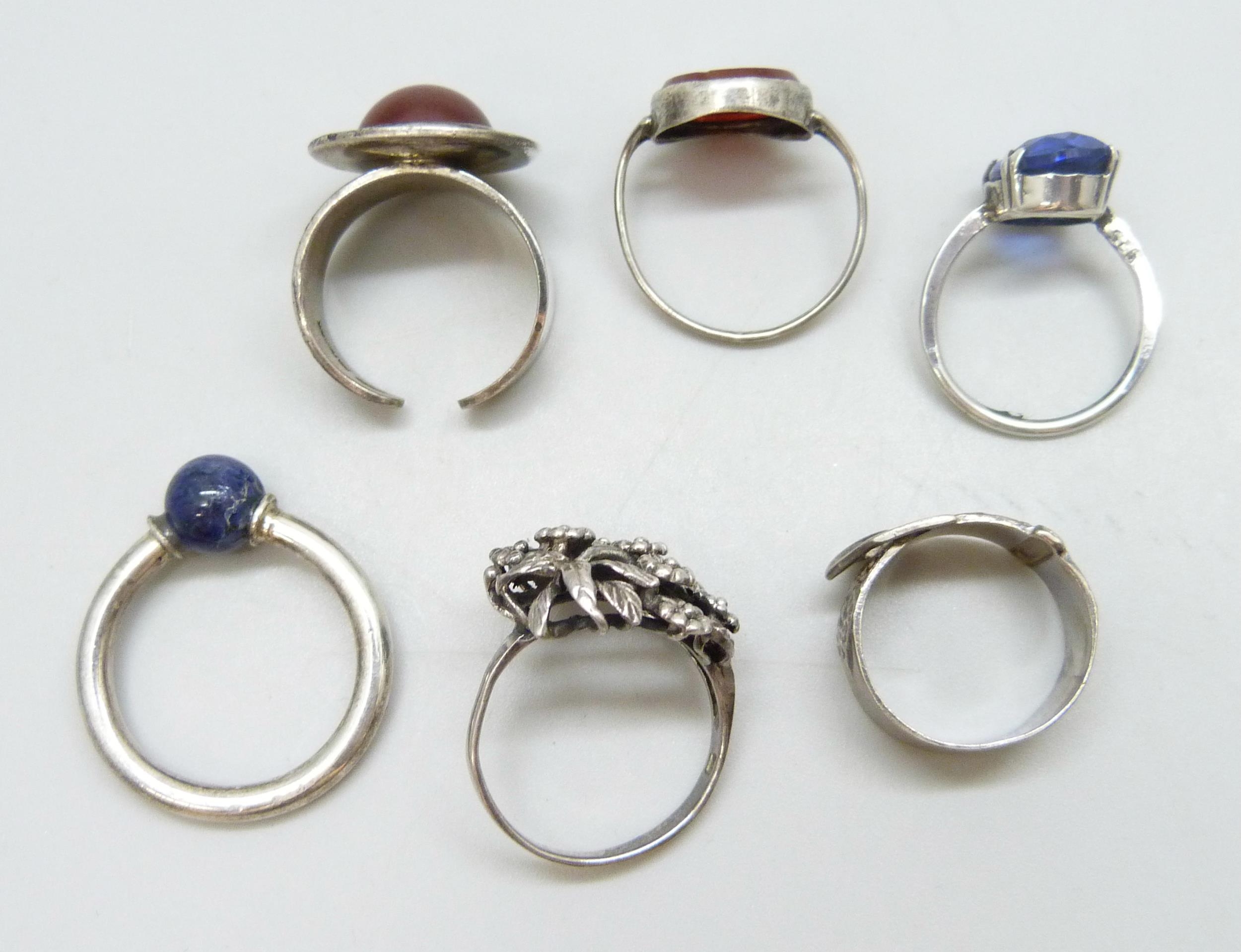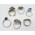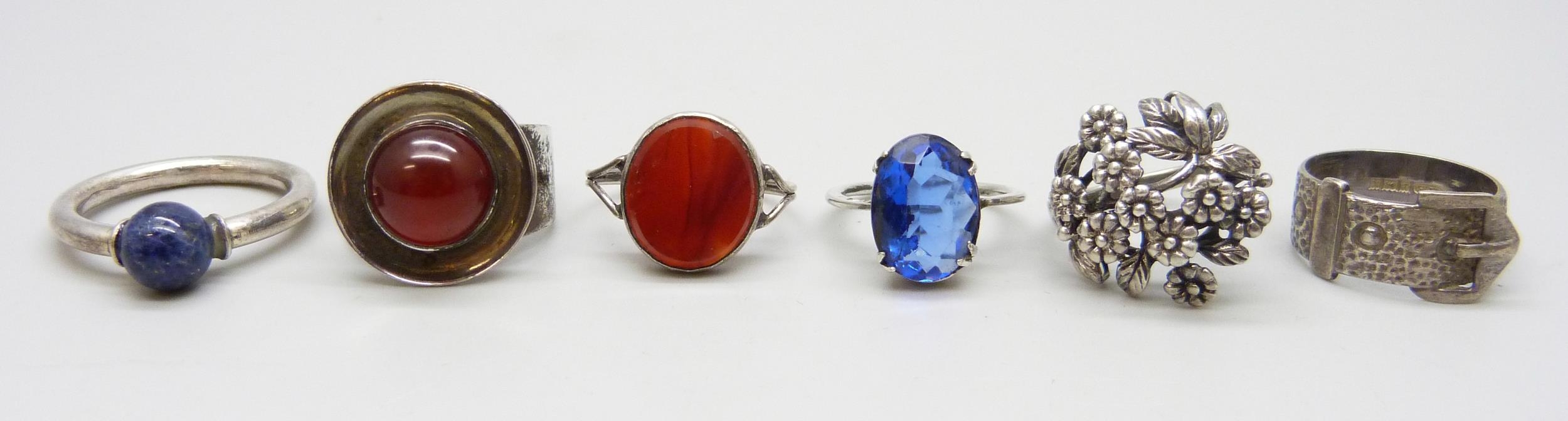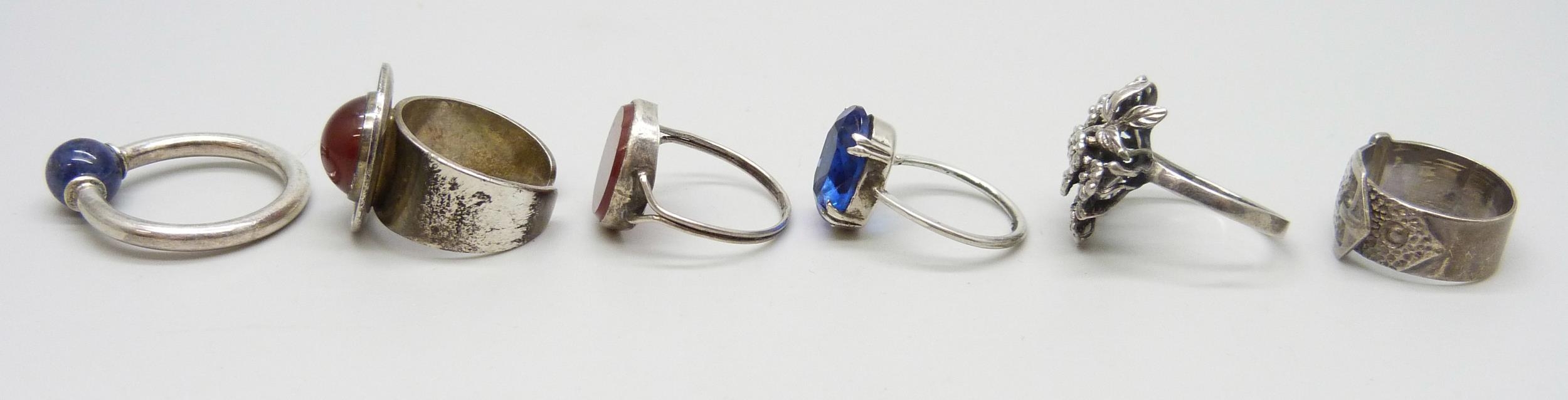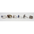 Five silver rings including two examples with full hallmarks, 24g, and one unmarked ring with a blue stone
