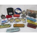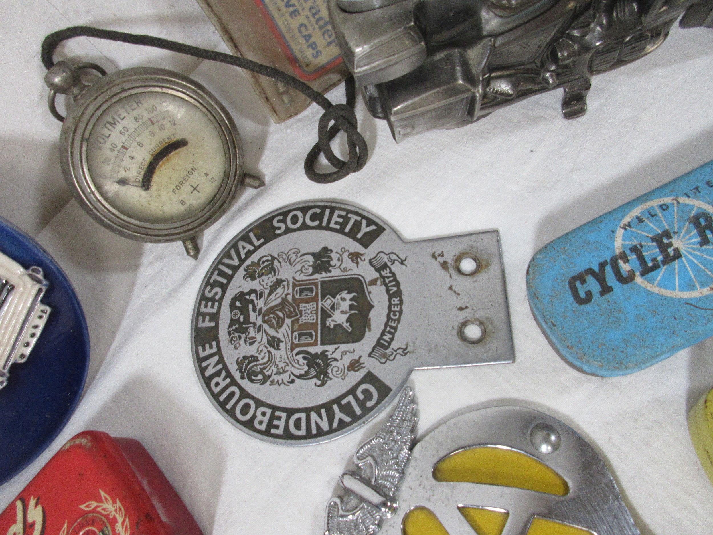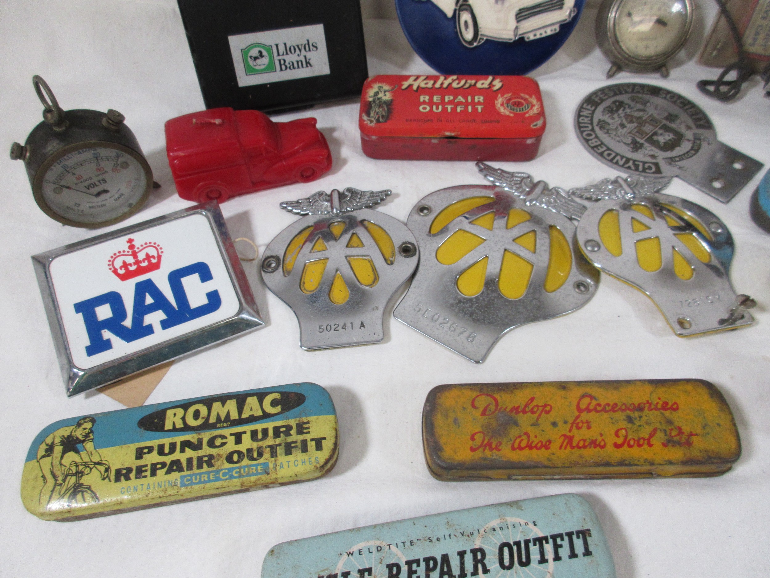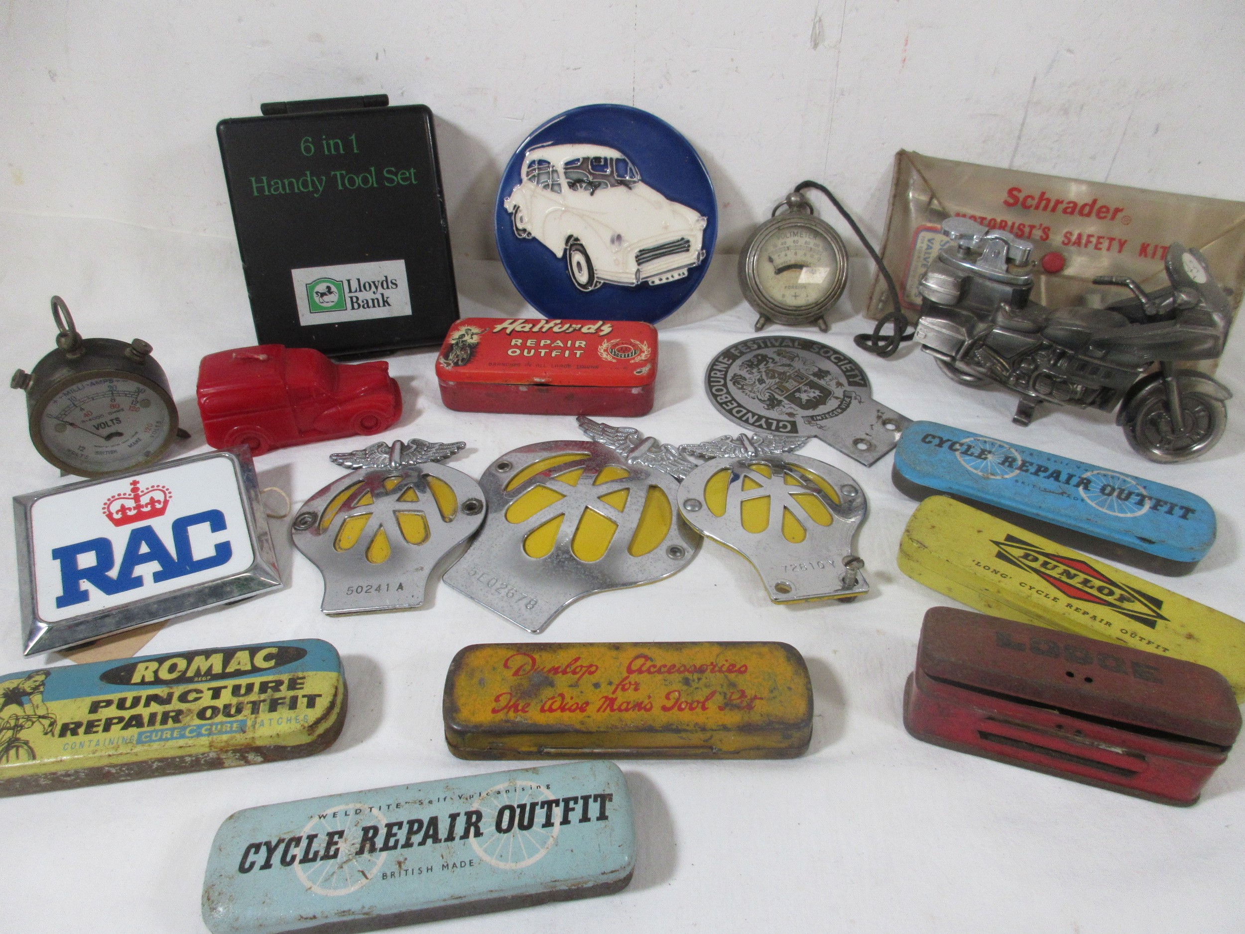 Various AA car Badges , Glyndebourne festival society badge , RAC Badge , Motorist safety kit six empty puncture srepair kits , Morris van candle , Milliamp volt meter , a Voltmeter ,6 in 1 handy toolkit and a Honda Cigarette lighter all as per pictures