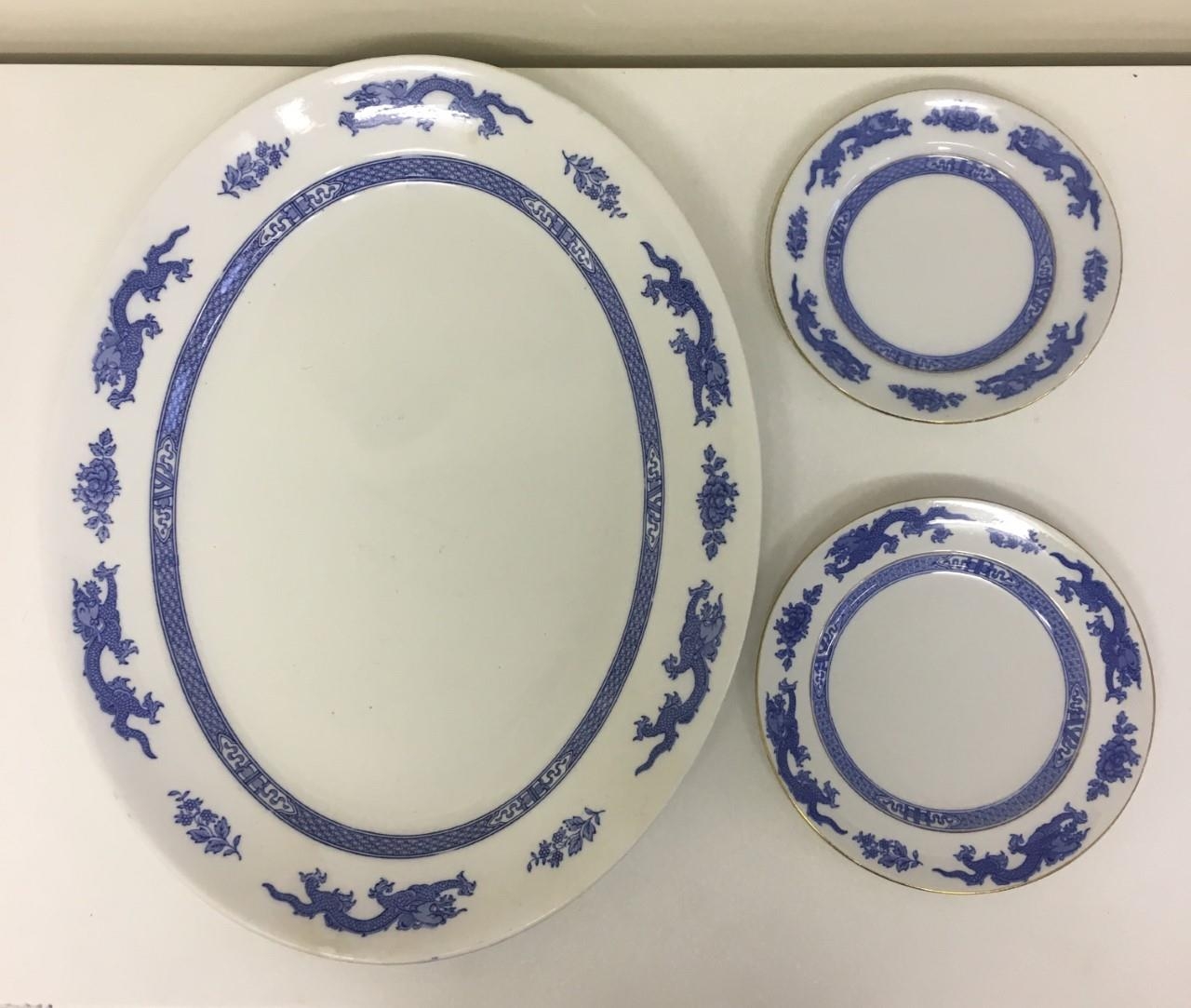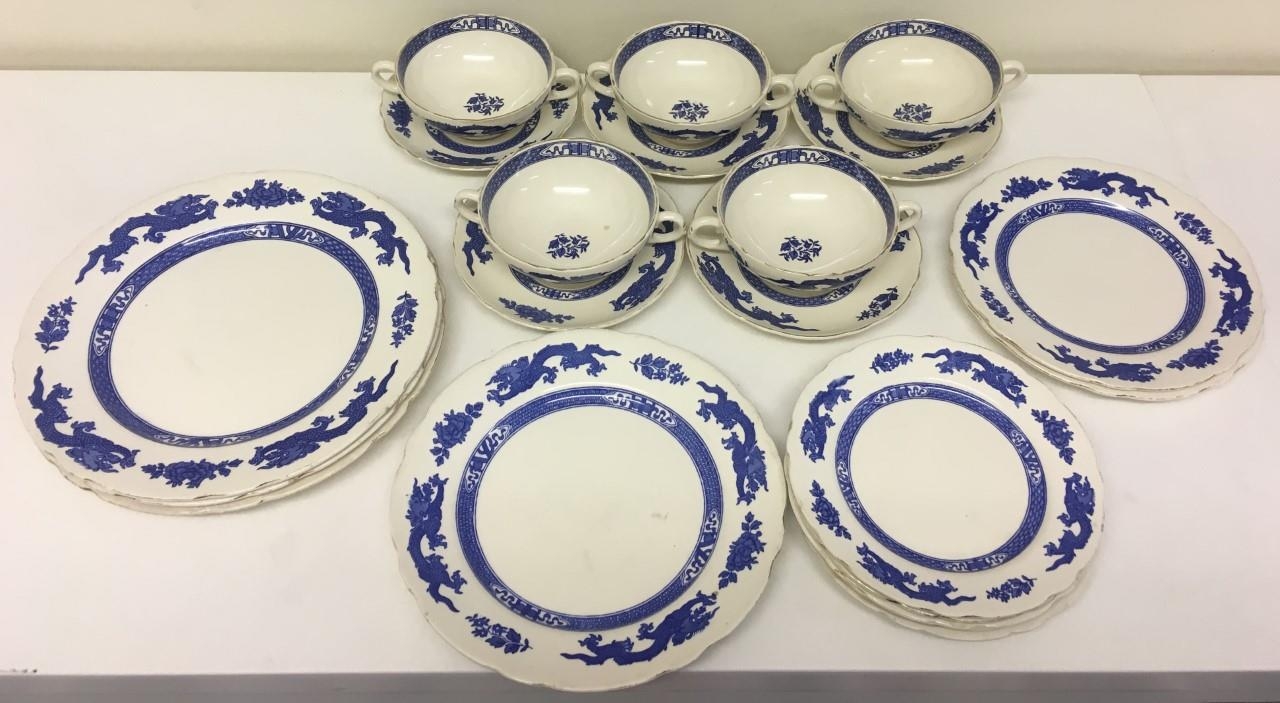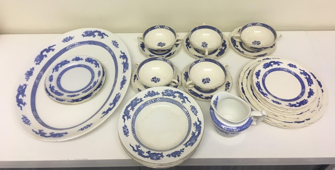 A mixed lot of 31 pieces of blue Dragonware from the early 1900's. 31 pieces in total. Royal Cauldon (x21), Cauldon (x5), Booths (x4), George Jones & Son (x1)