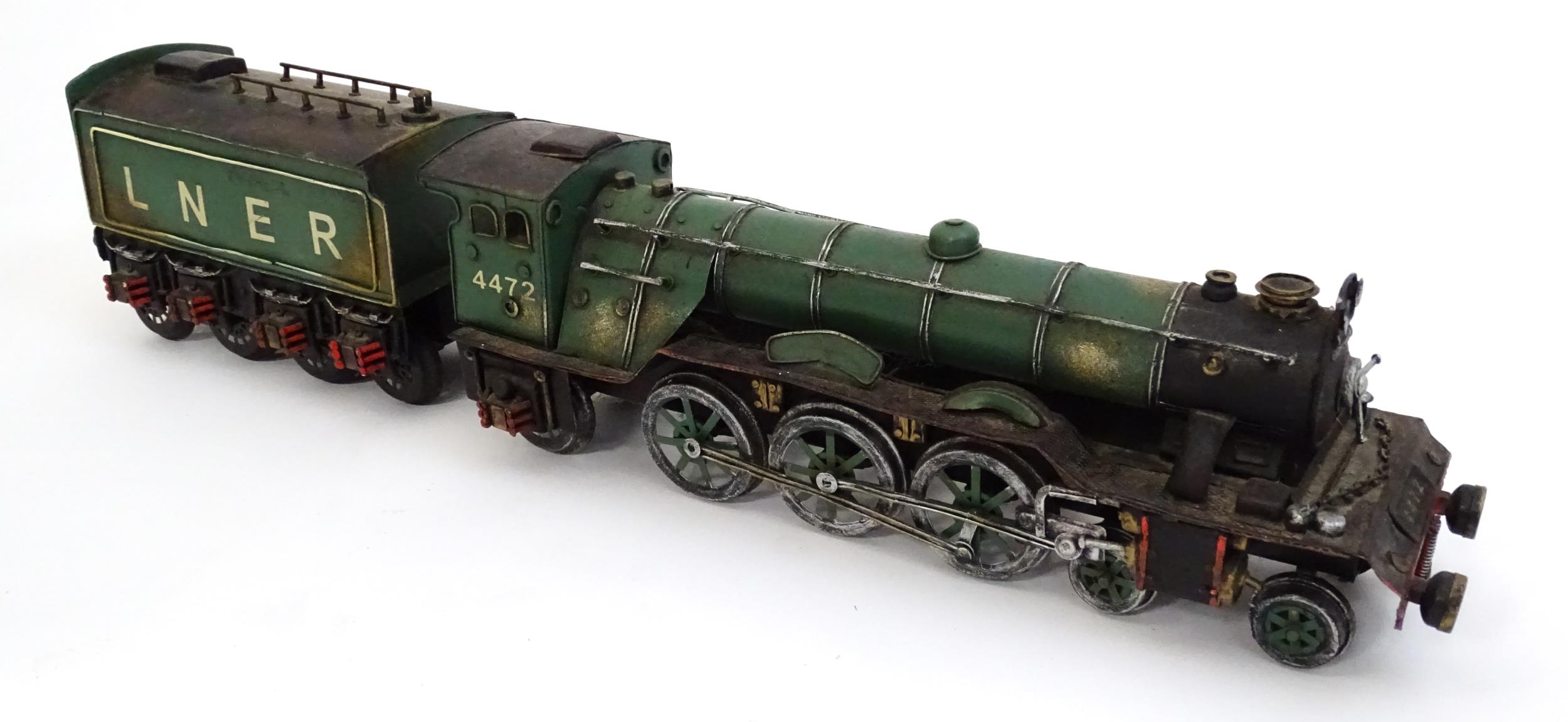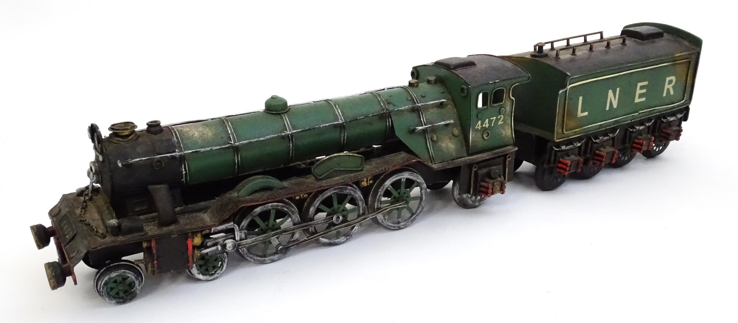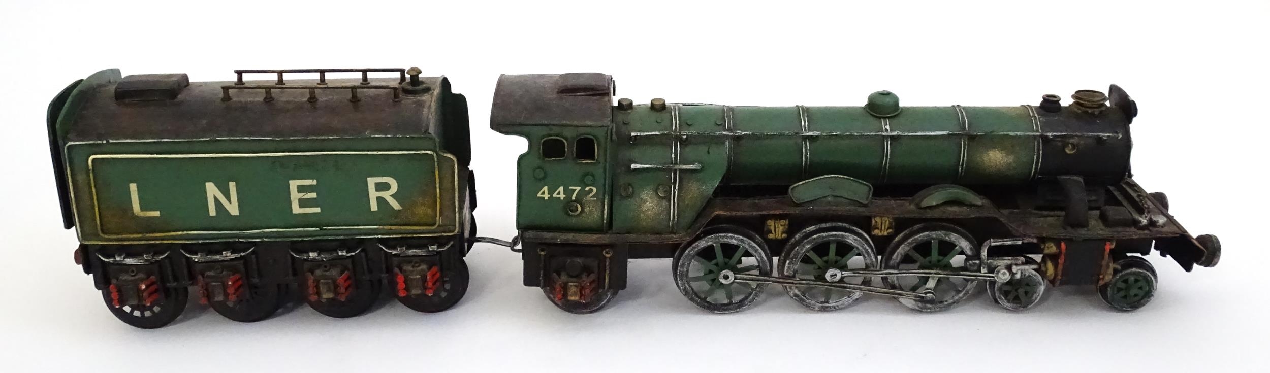Toy: A cast model of the Flying Scotsman train, no. 4472, and LNER tender. Approx. 5 1/2" high x 25 3/4" long (overall)