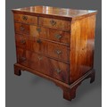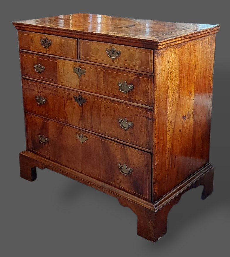 A George III walnut chest, the line inlaid top above two short and three long drawers with brass handles raised upon bracket feet, 96cms wide, 55cms deep and 92cms tall