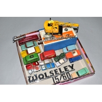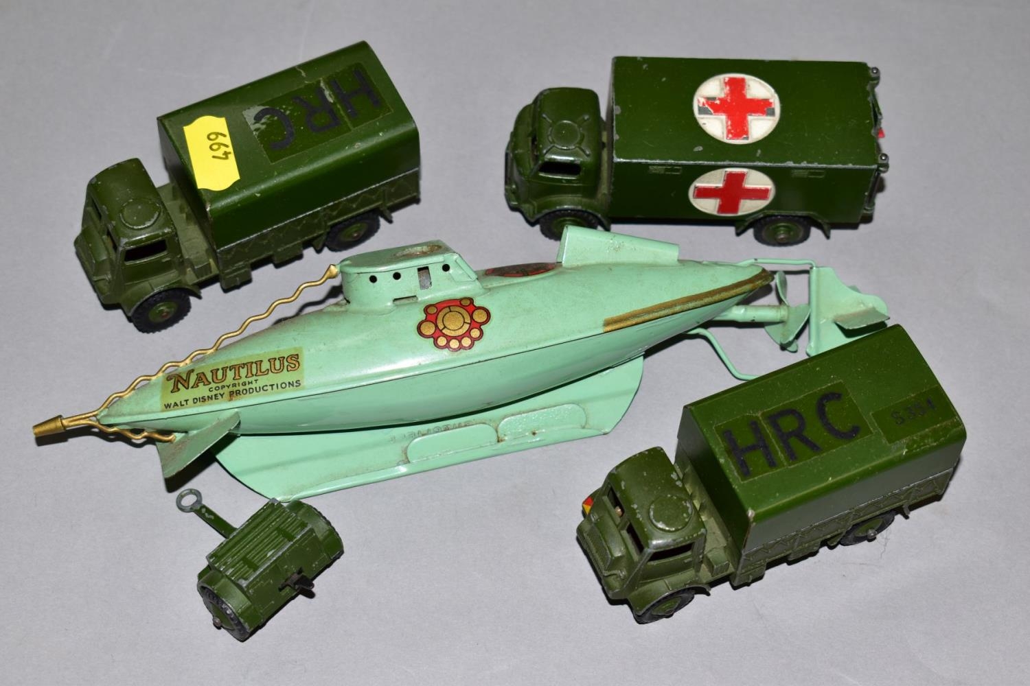 AN UNBOXED SUTCLIFFE NAUTILUS CLOCKWORK DIVING SUBMARINE, missing key and bung, playworn condition, minor paint loss and wear, some bubbling to paintwork, decals in good condition, with a small quantity of unboxed and assorted playworn diecast Dinky Toys military vehicles