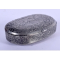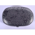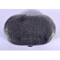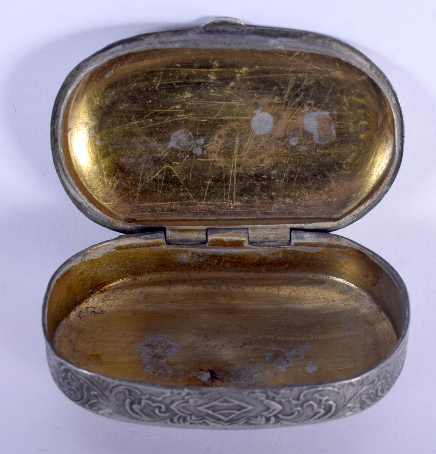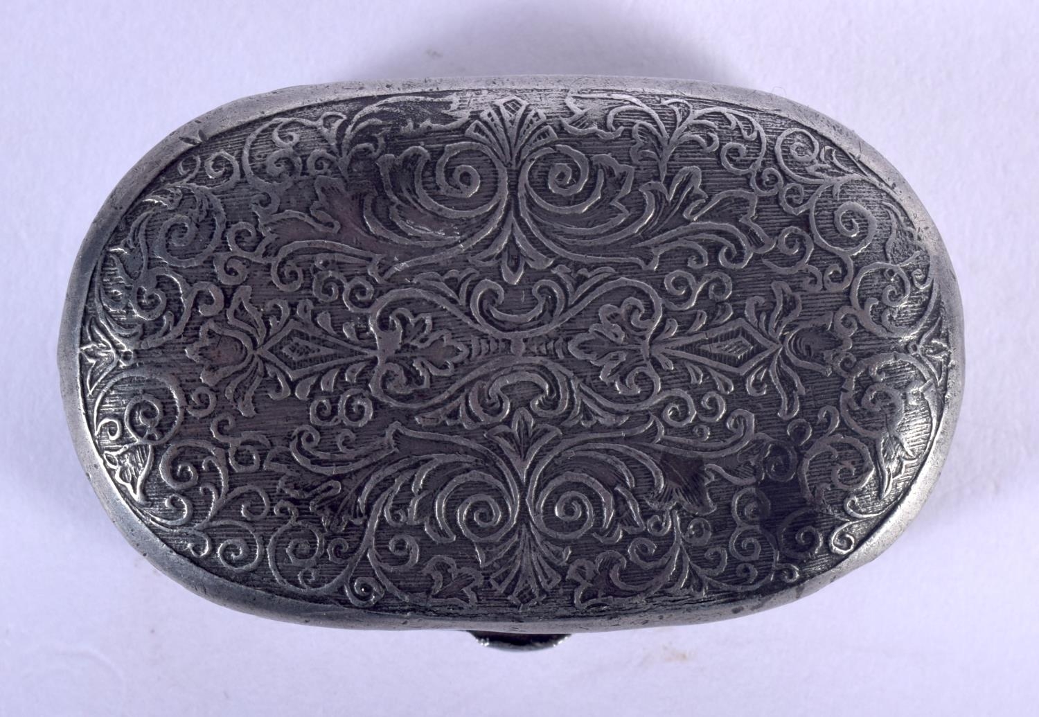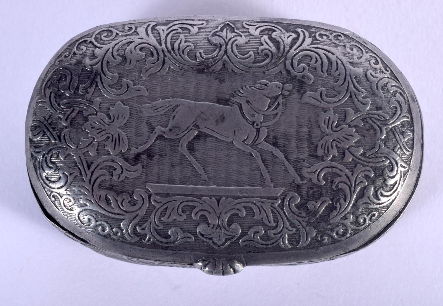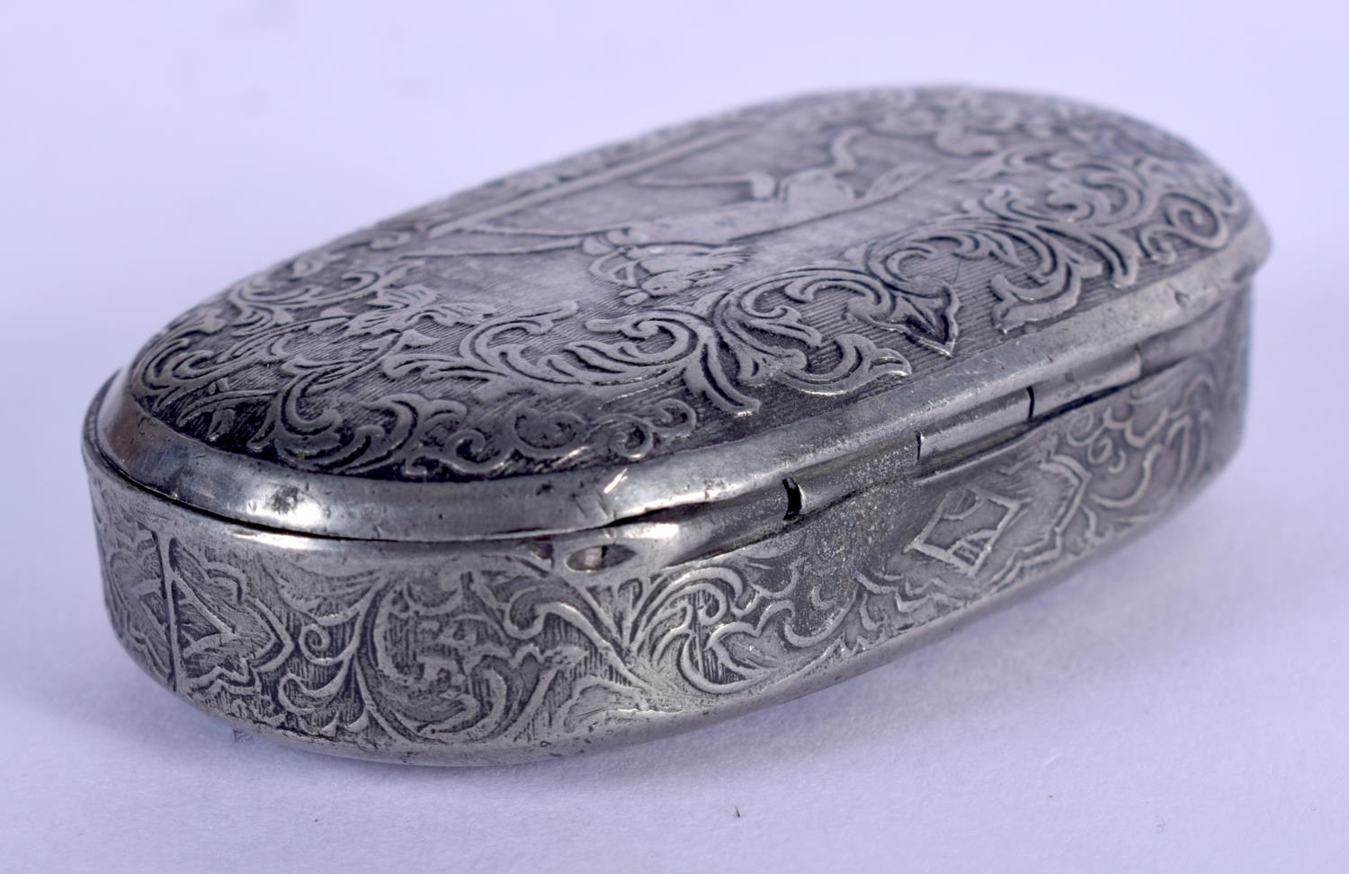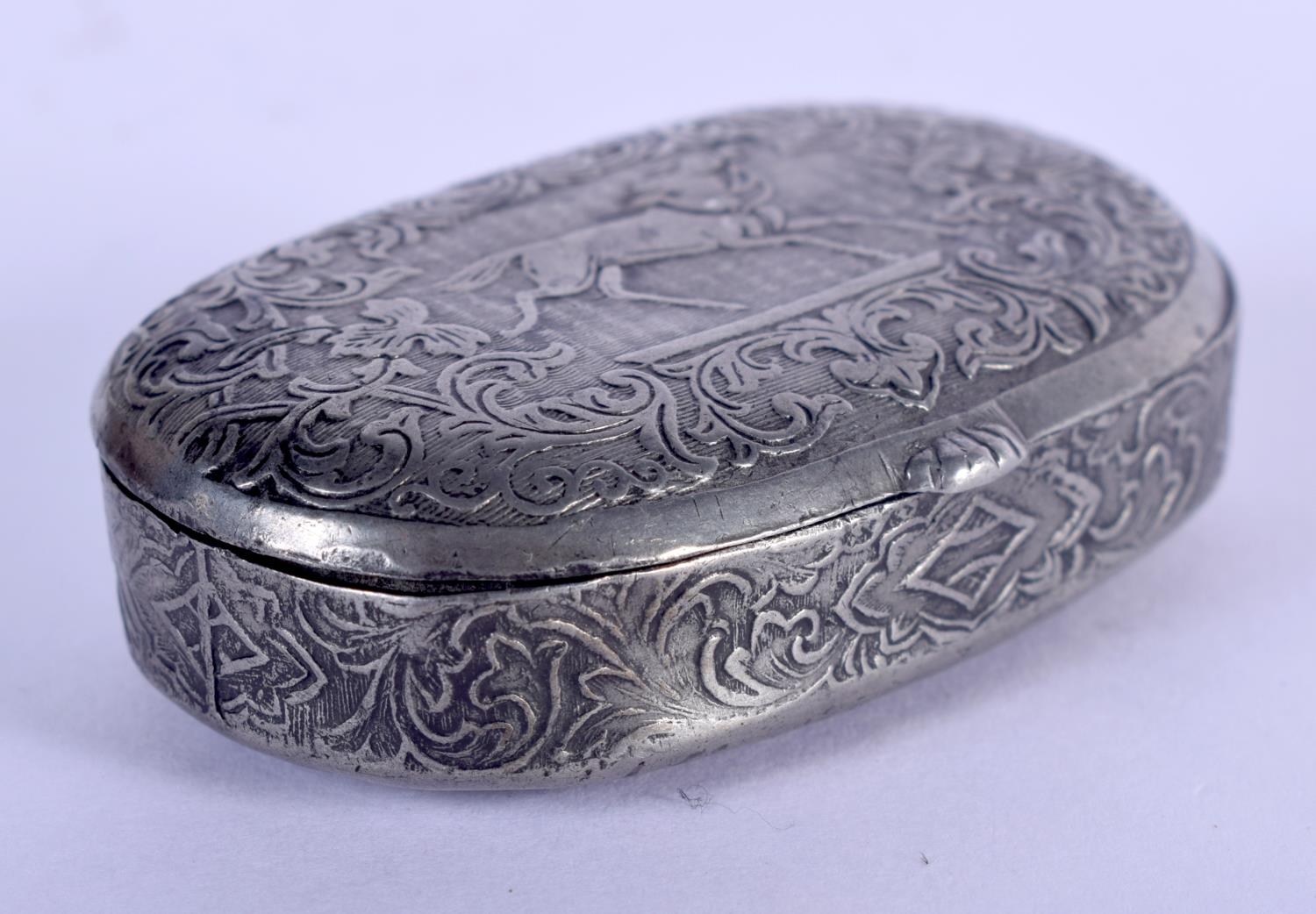 A CHARMING 19TH CENTURY PEWTER EQUESTRIAN SNUFF BOX decorated with foliage. 5.75 cm x 3 cm.