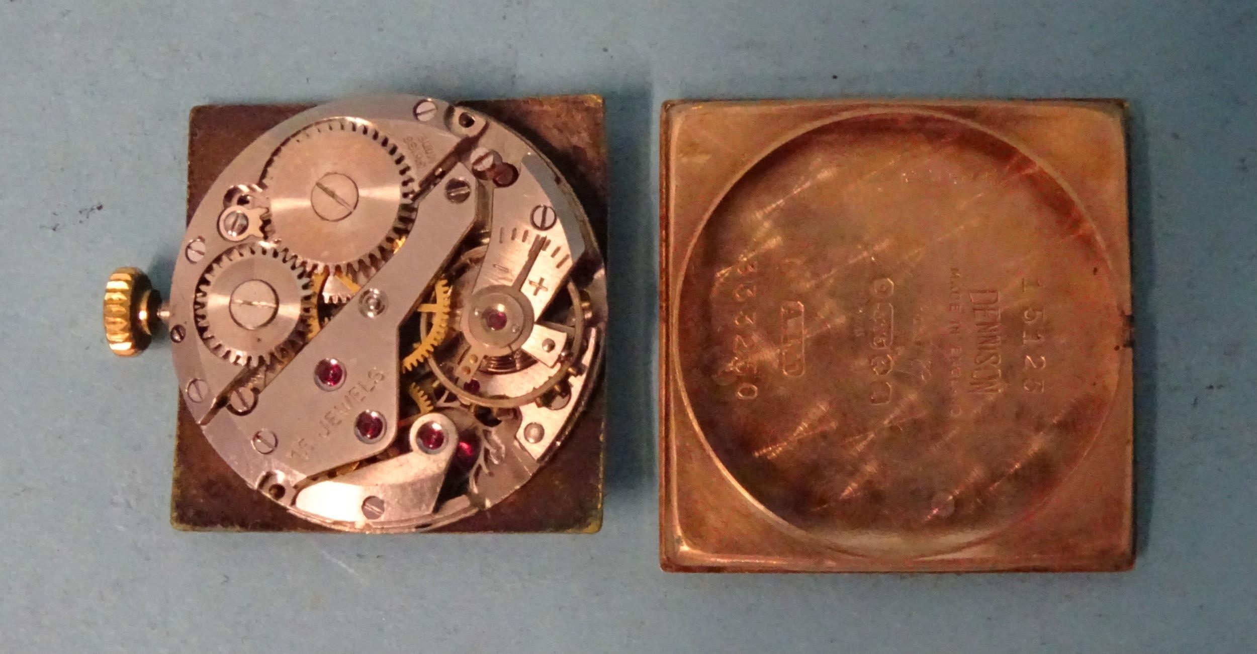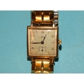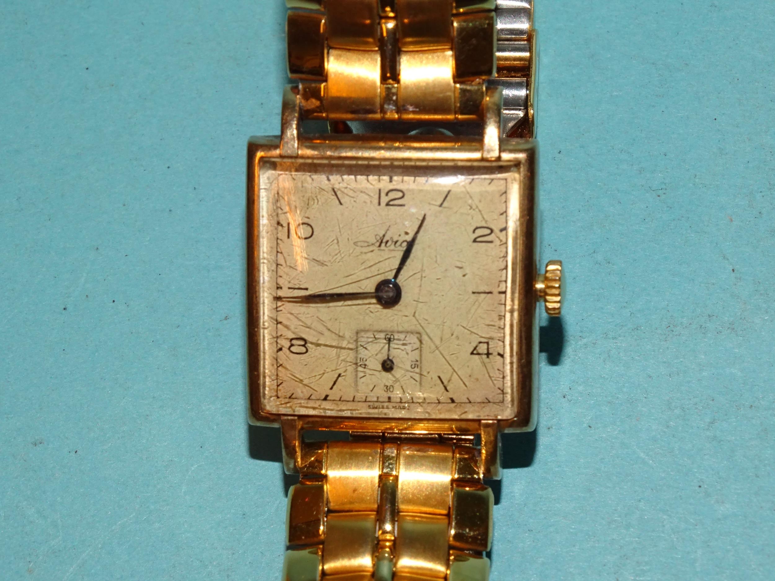 Aria, a 9ct gold-cased square-face wrist watch, with Arabic and baton numerals and seconds subsidiary, 25mm diameter, on modern plated bracelet, (working but can't guarantee time-keeping).