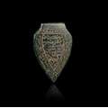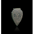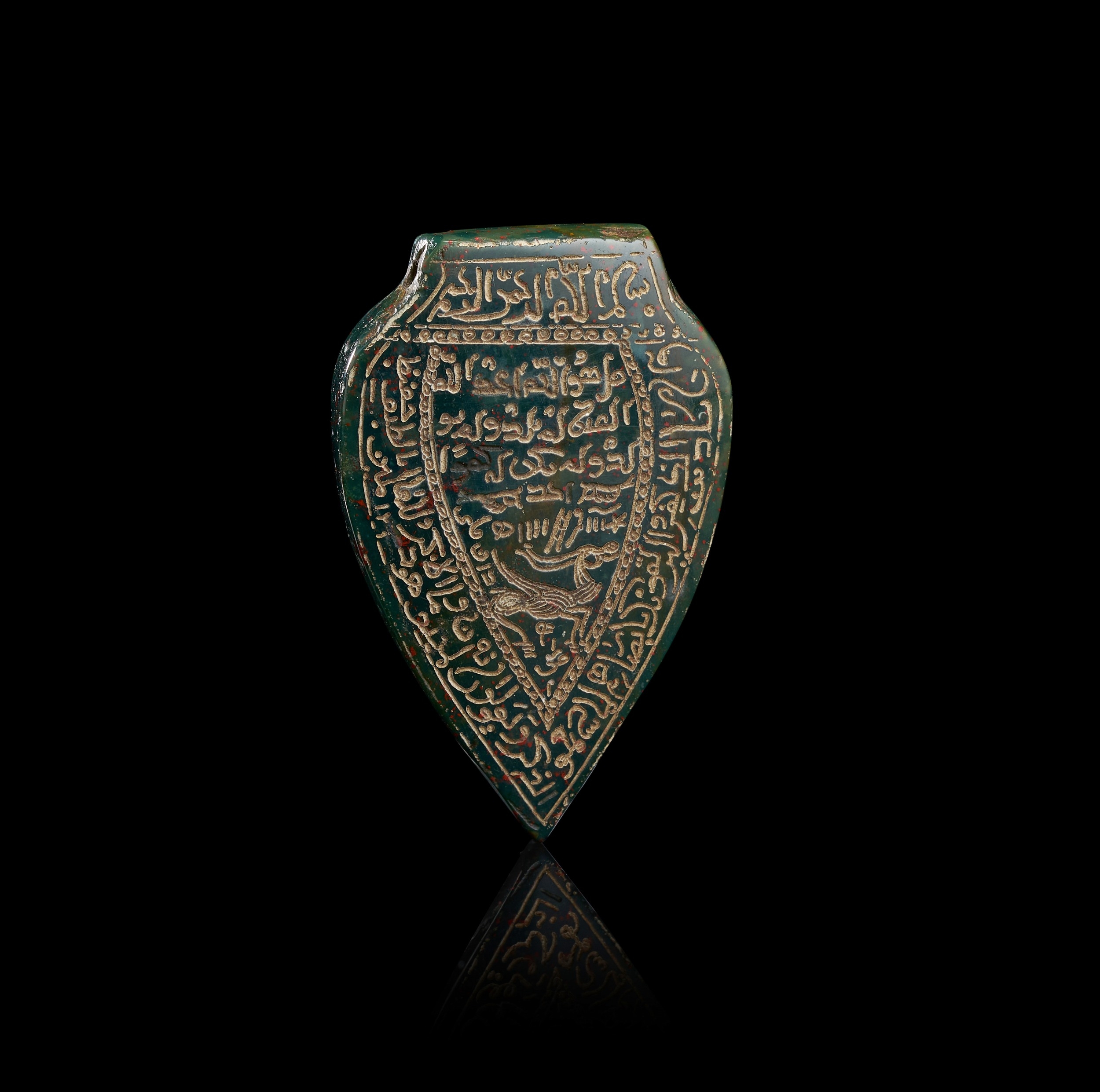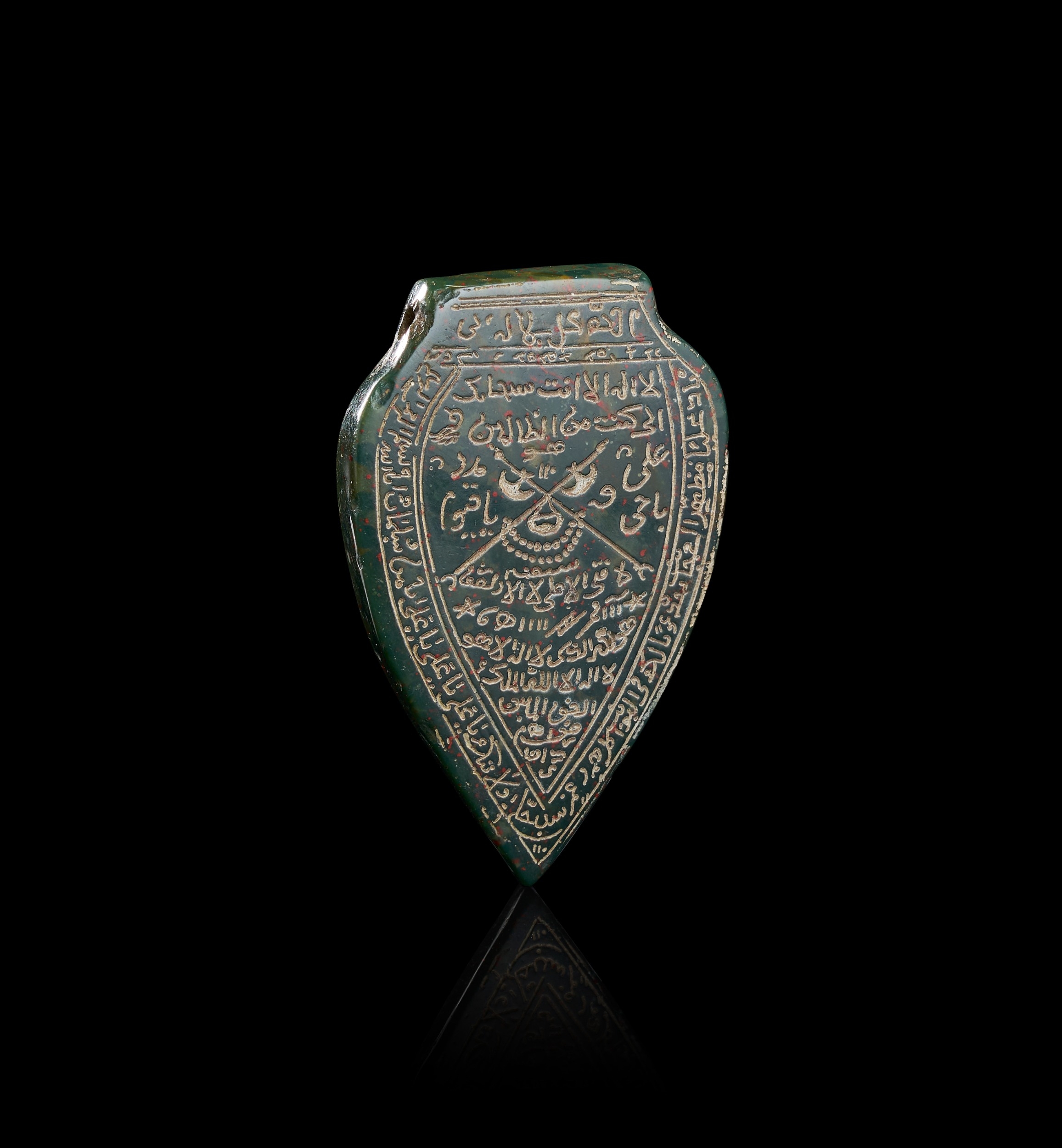 A carved bloodstone talismanic amulet of shield-like form with a flared and pierced top for suspension. The dark green jasper stone features characteristic red hematite inclusions. Both faces are finely incised with calligraphic inscriptions and figurative elements, with the recessed lines containing a white pigment infill to enhance legibility against the dark stone. Side A displays a central field with the Zulfiqar (bifurcated sword of Ali) shown as crossed blades. The inscriptions include the Quranic verse from Surah Al-Anbiya (21:87) and the phrase La fata illa Ali (There is no hero but Ali). The borders and central panel are filled with dense Naskh or Thuluth script containing religious invocations. Side B features a stylized quadruped, likely a horse, in the lower central panel. The top register is inscribed with the Basmala. The surrounding borders contain calligraphic text including the Ayat al-Kursi (Throne Verse).