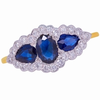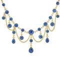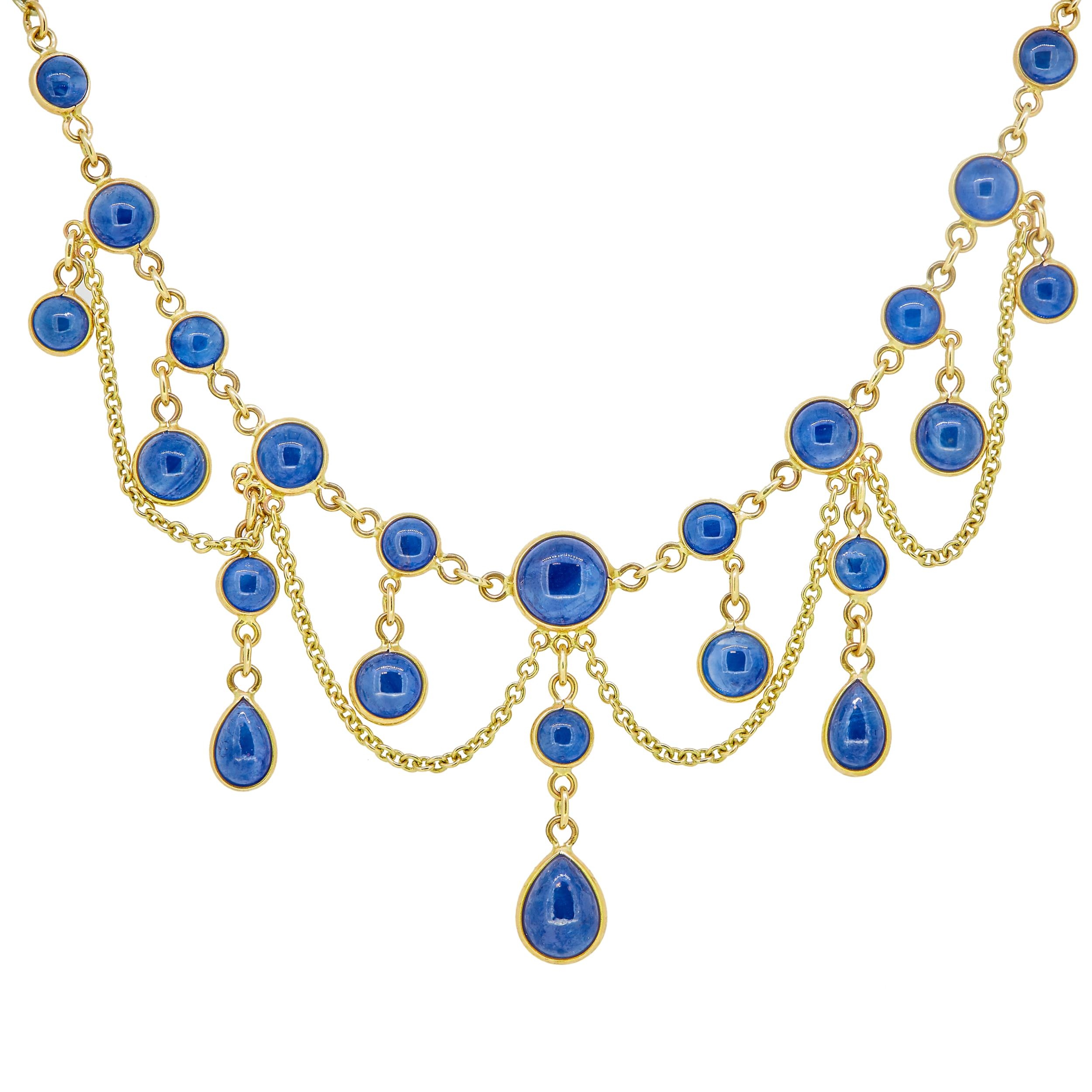 SAPPHIRE DROP NECKLACE, set with 11 cabochon cut blue sapphires, suspending 9 sapphire set drops linked with guirlands. L. 41 cm. 15.4 grams.