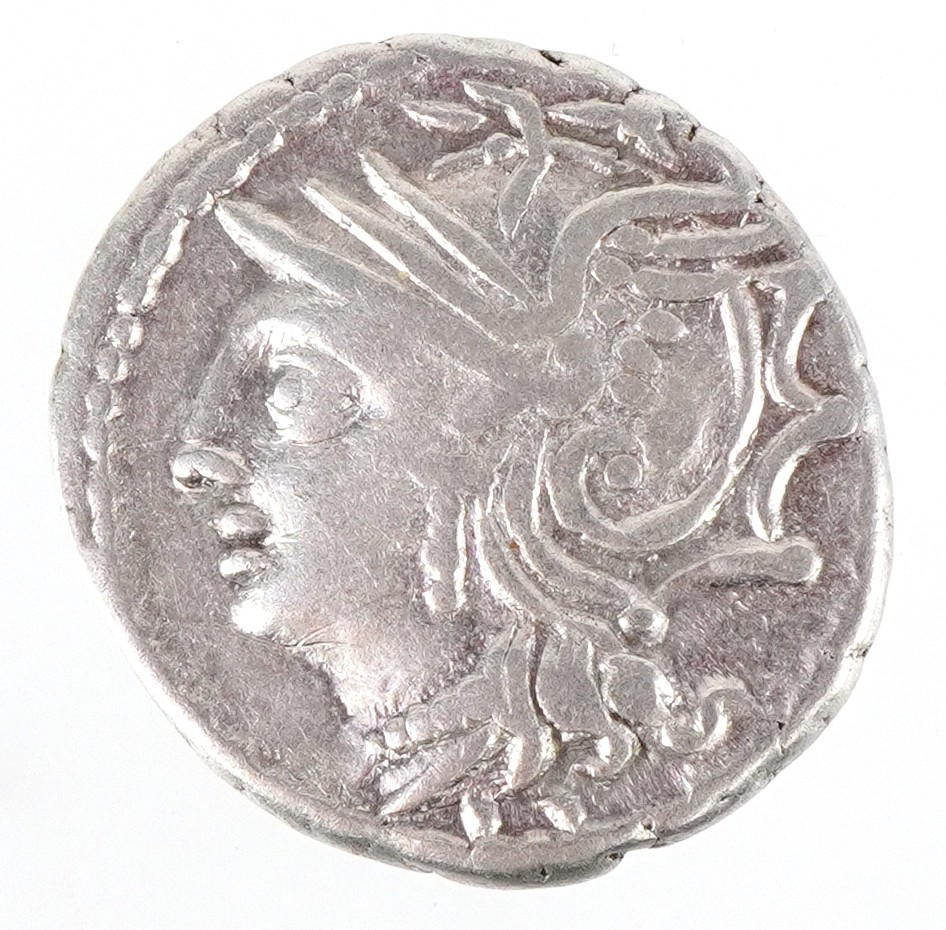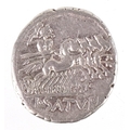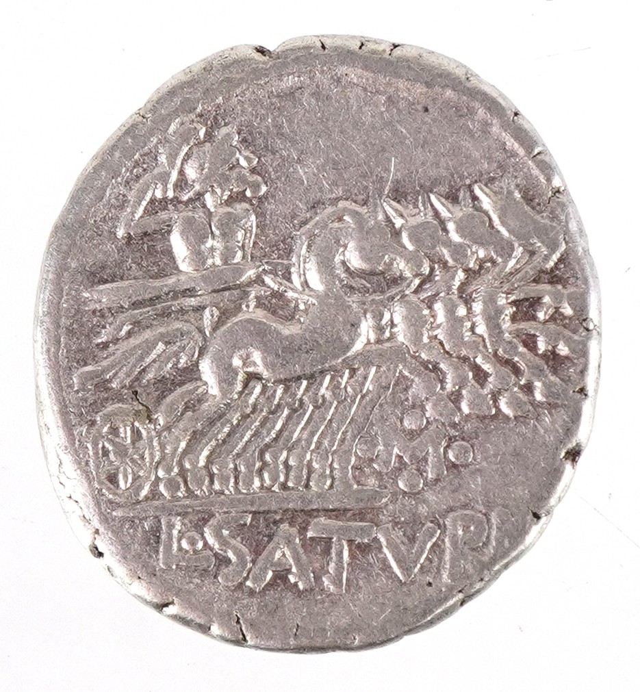 A Roman Republic circa 104 BC Lucius Appuleius Saturninus silver denarius coin, 19mm in diameter, 3.8/3.9g