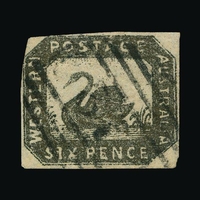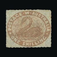 Australia - States - Western Australia : (SG 15) 1857-59 2d brown black and red Swan, apparently unused without gum, clear margins to three sides, just shaving at right, a circular (possibly natural) thin at upper right. Avery rare issue. Cat £9000 (image available)