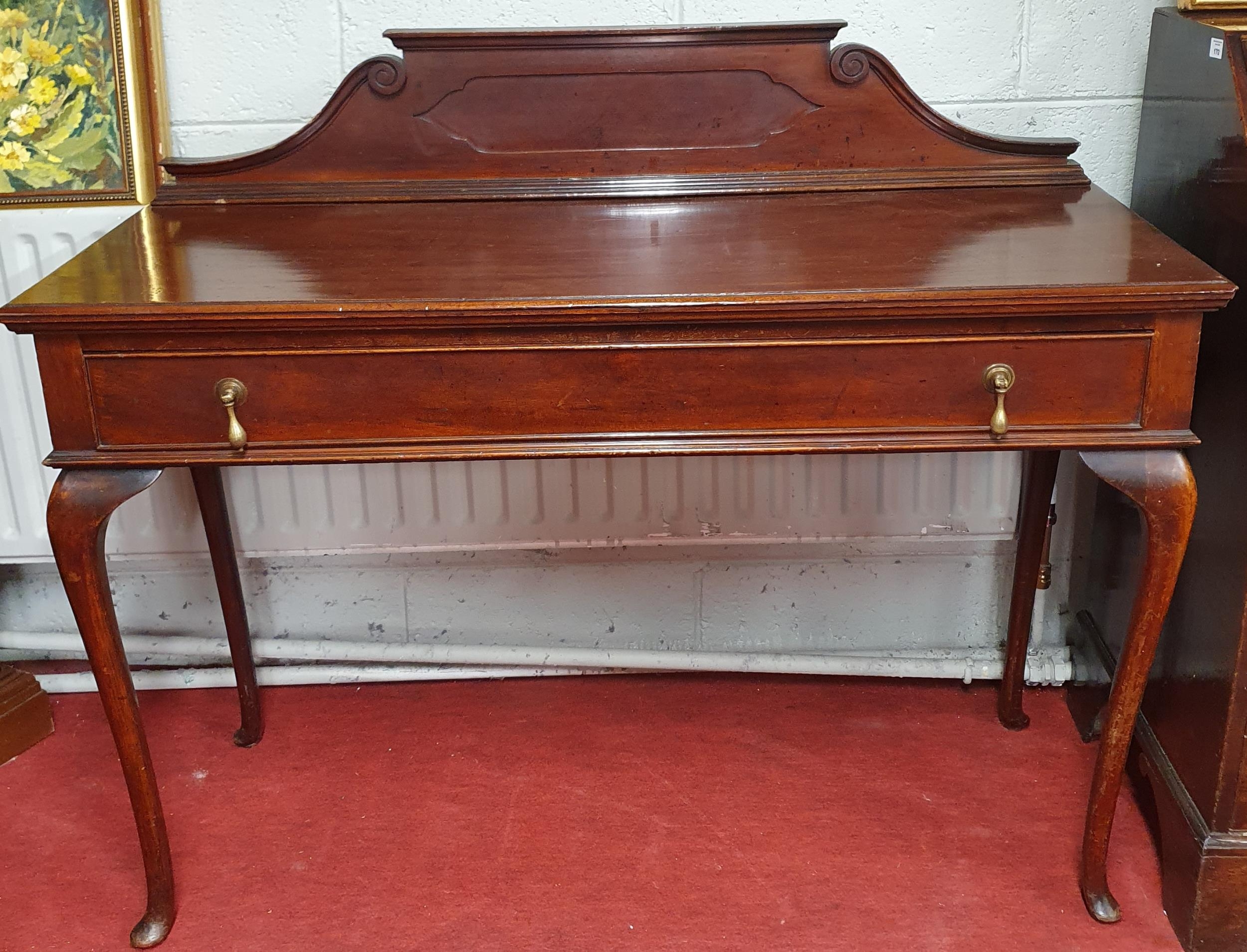 A good late 19th early 20th Century Mahogany single drawer Side Table, the frieze drawer with brass drop handles and gallery back on cabriole supports. 122cm wide 47cm deep 101cm high approx.