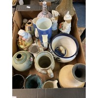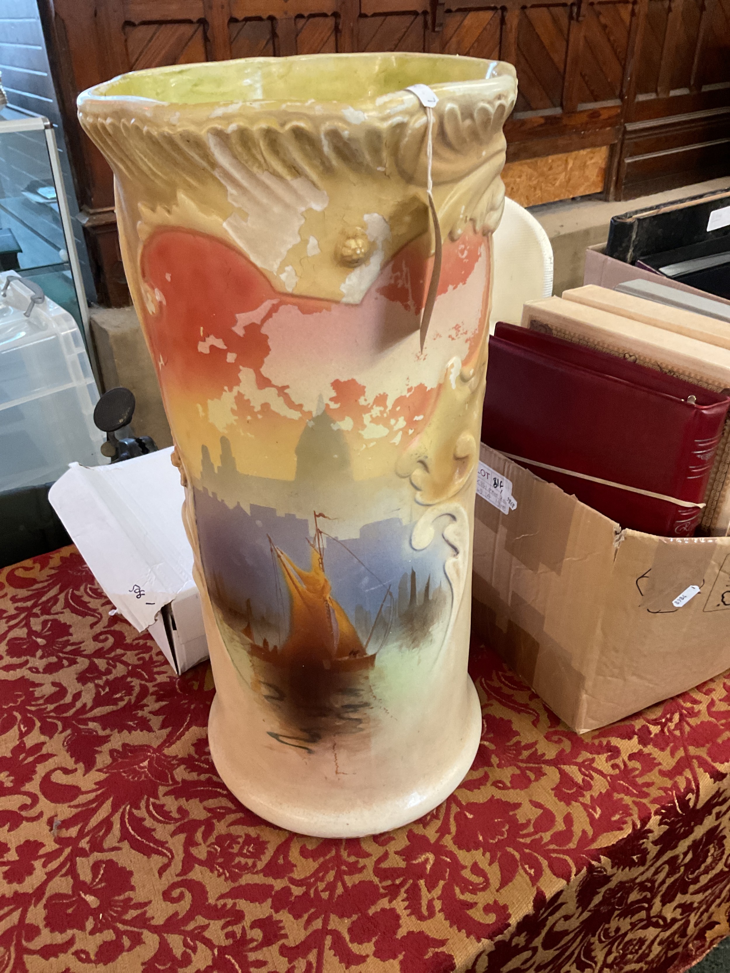 A vintage pottery stick stand made by Bretby decorated with a sailing boat scene