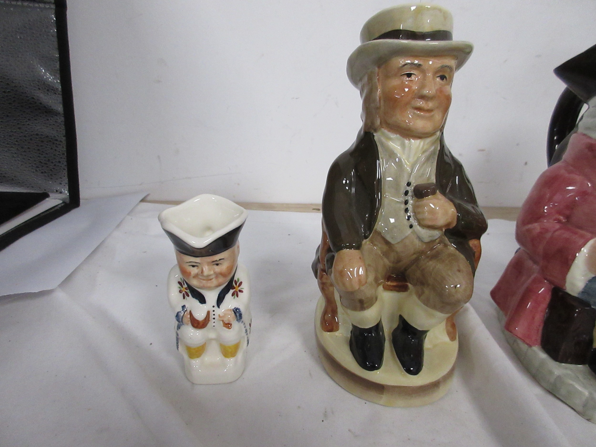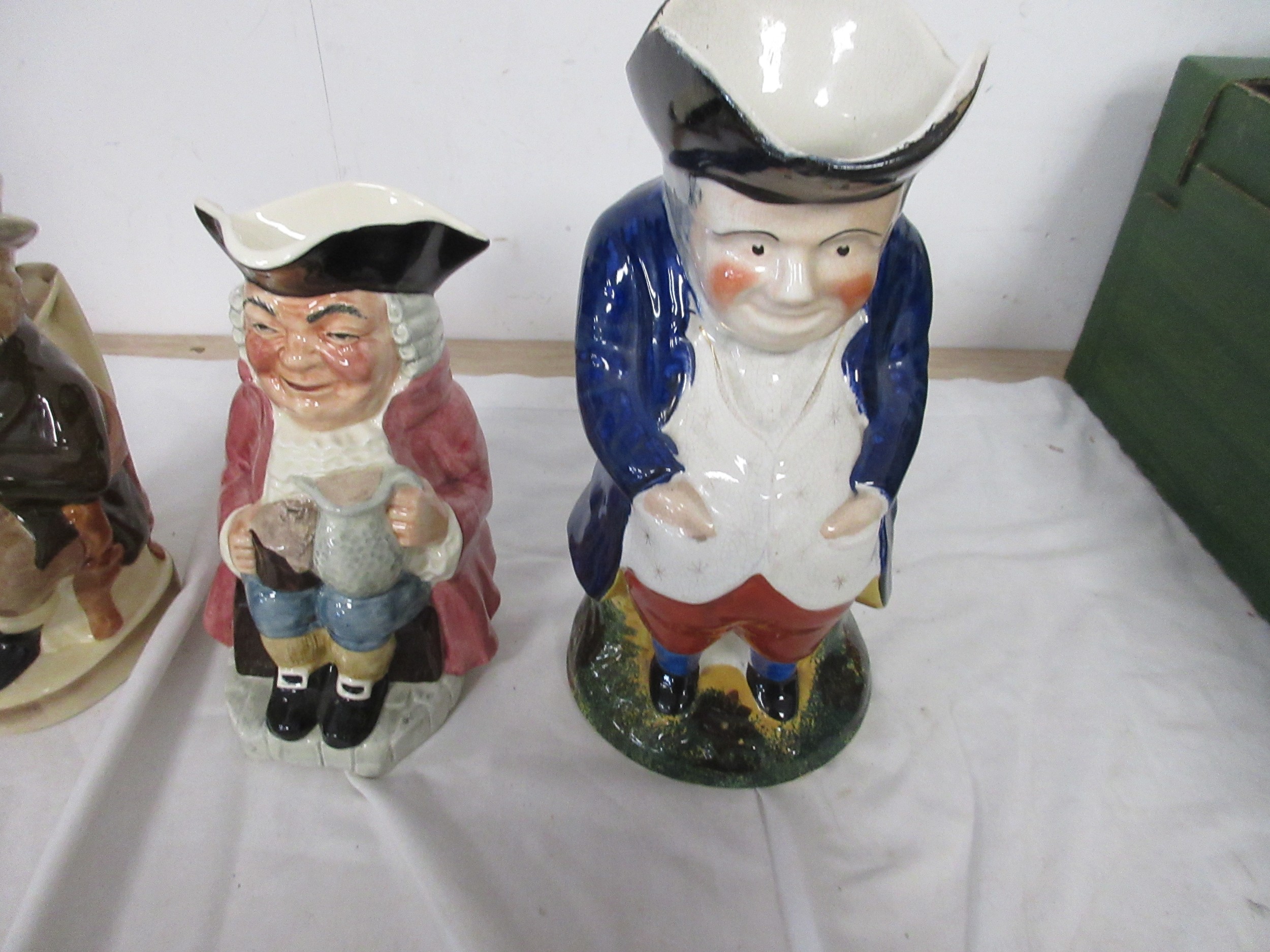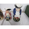 A traditional style large pottery Toby jug (height 24.5cm, a/f at rim), and three others - Sylvac seated man 4401, Tony Wood and Wood Potters of Burslem examples.
