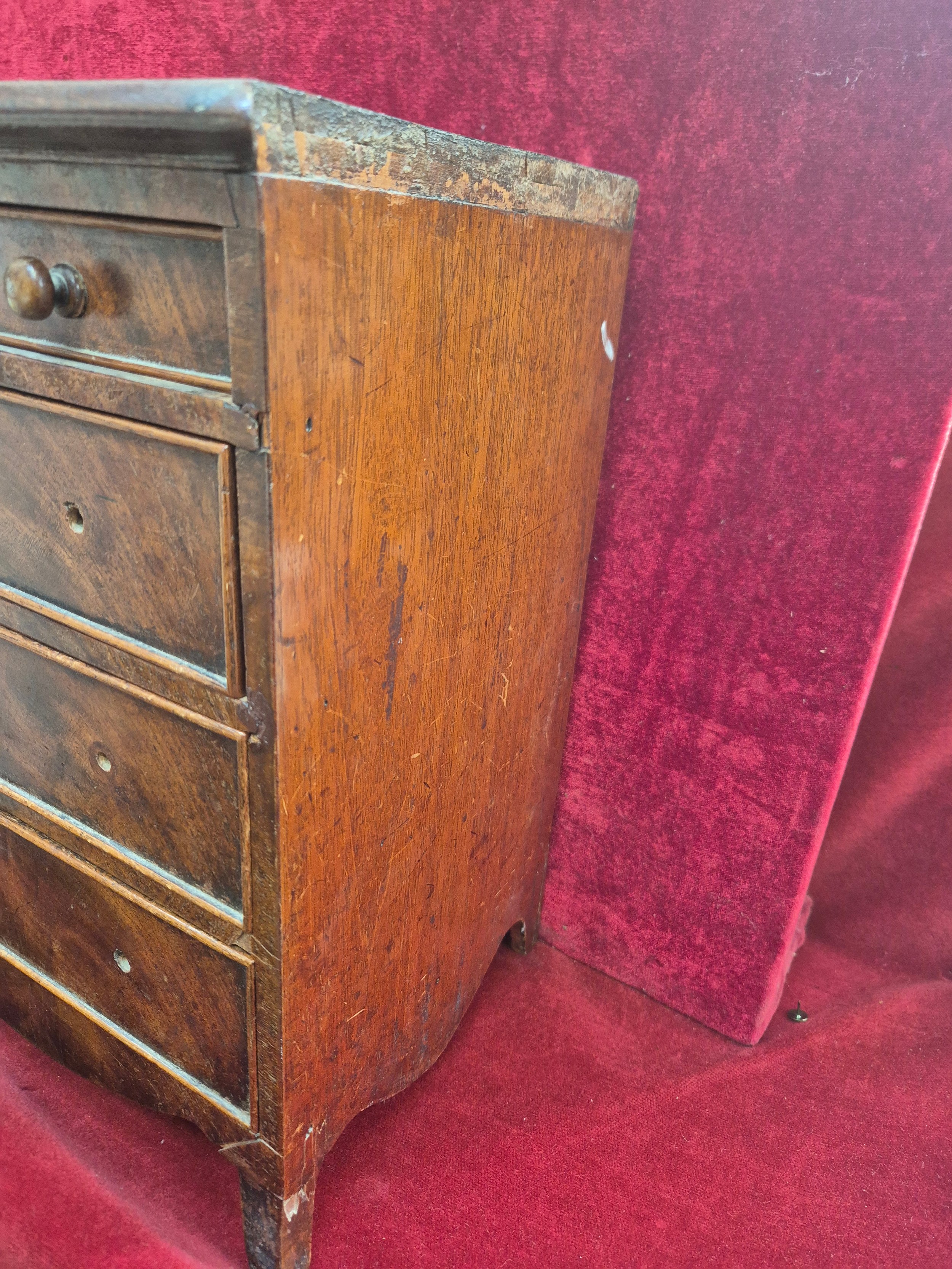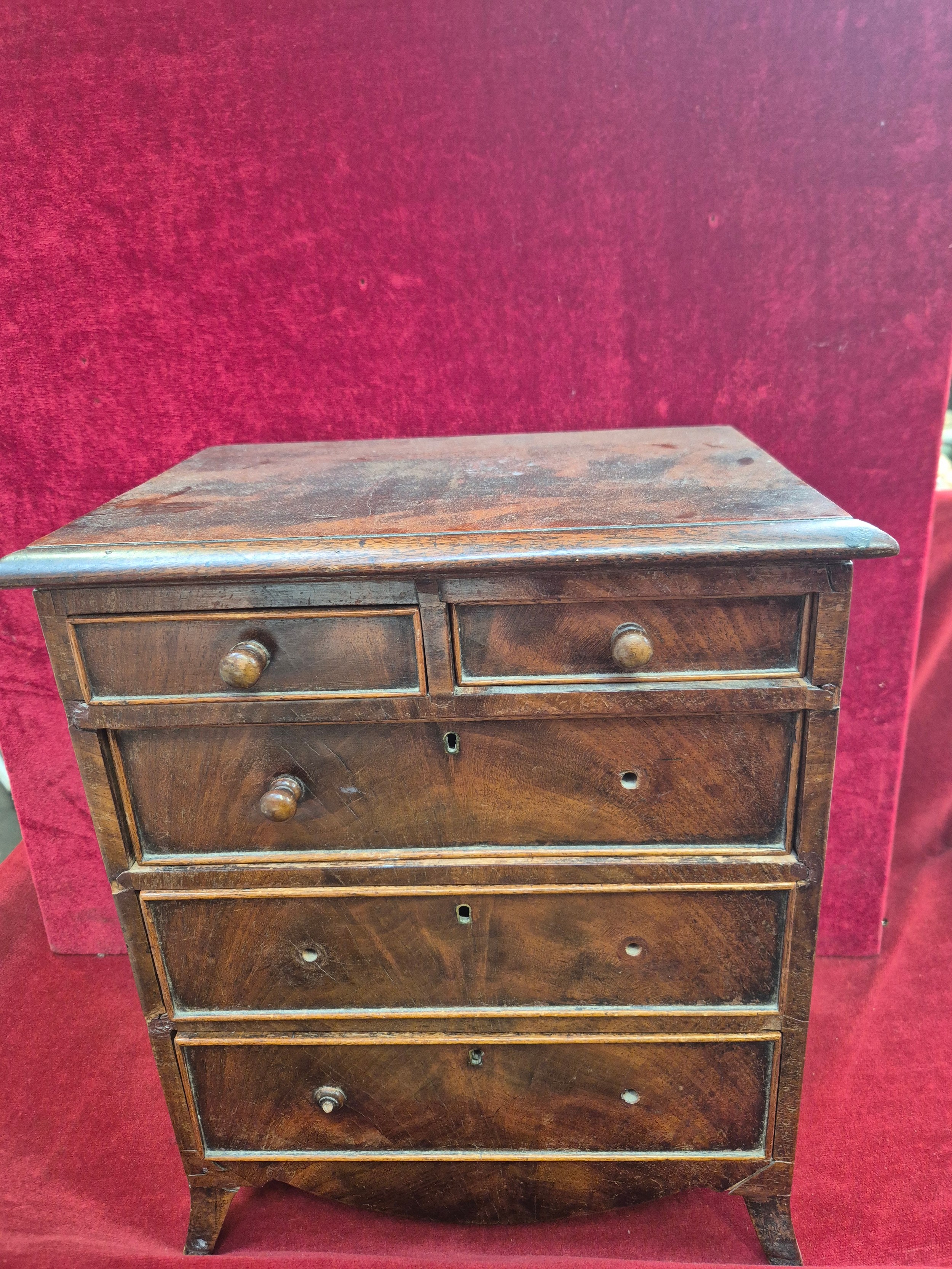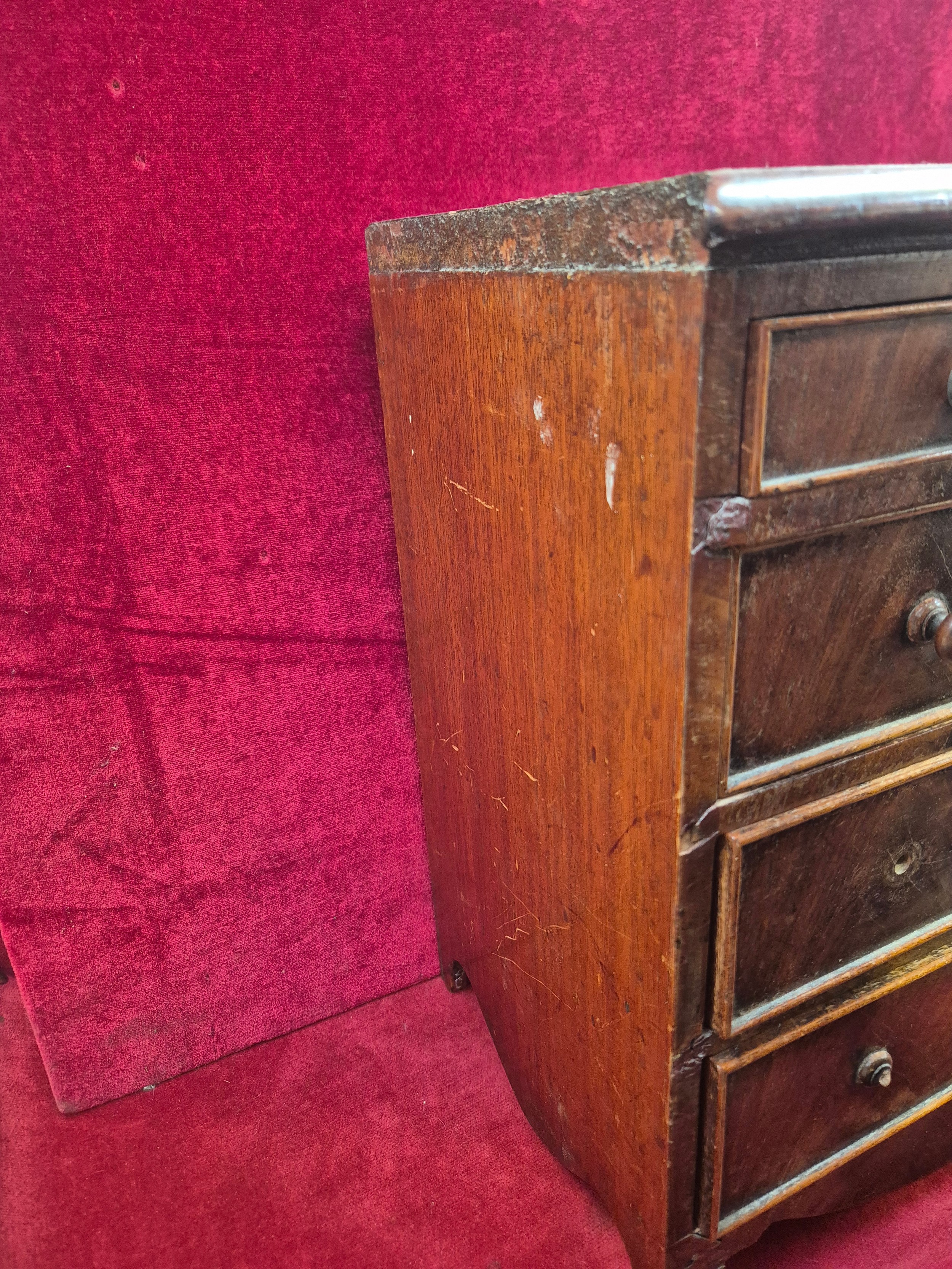 Good quality miniature apprentice piece chest of drawers. Pine & mahogany carcass, with flame mahogany veneer and oak lined drawers - Needs some TLC/Restoration project.