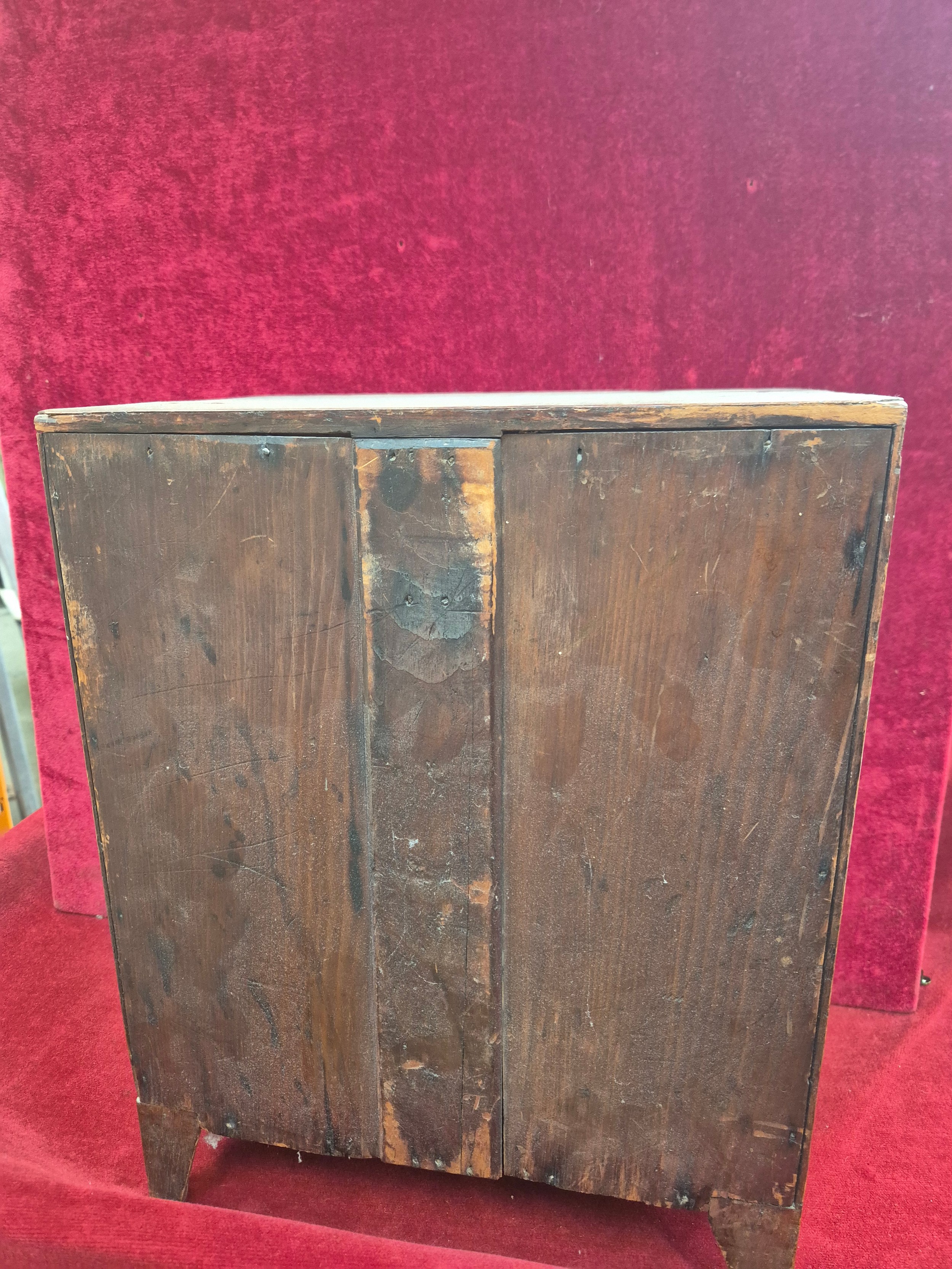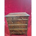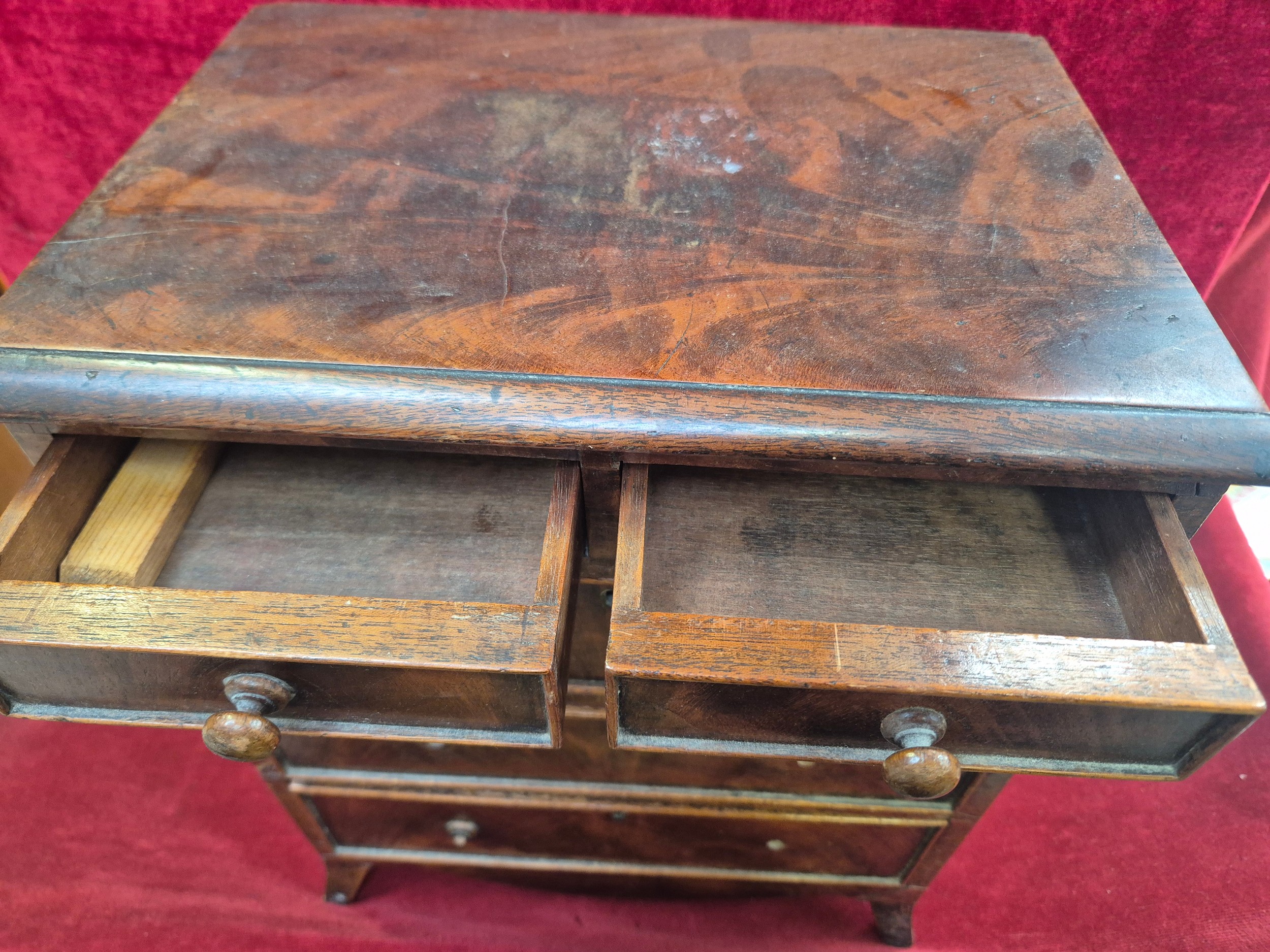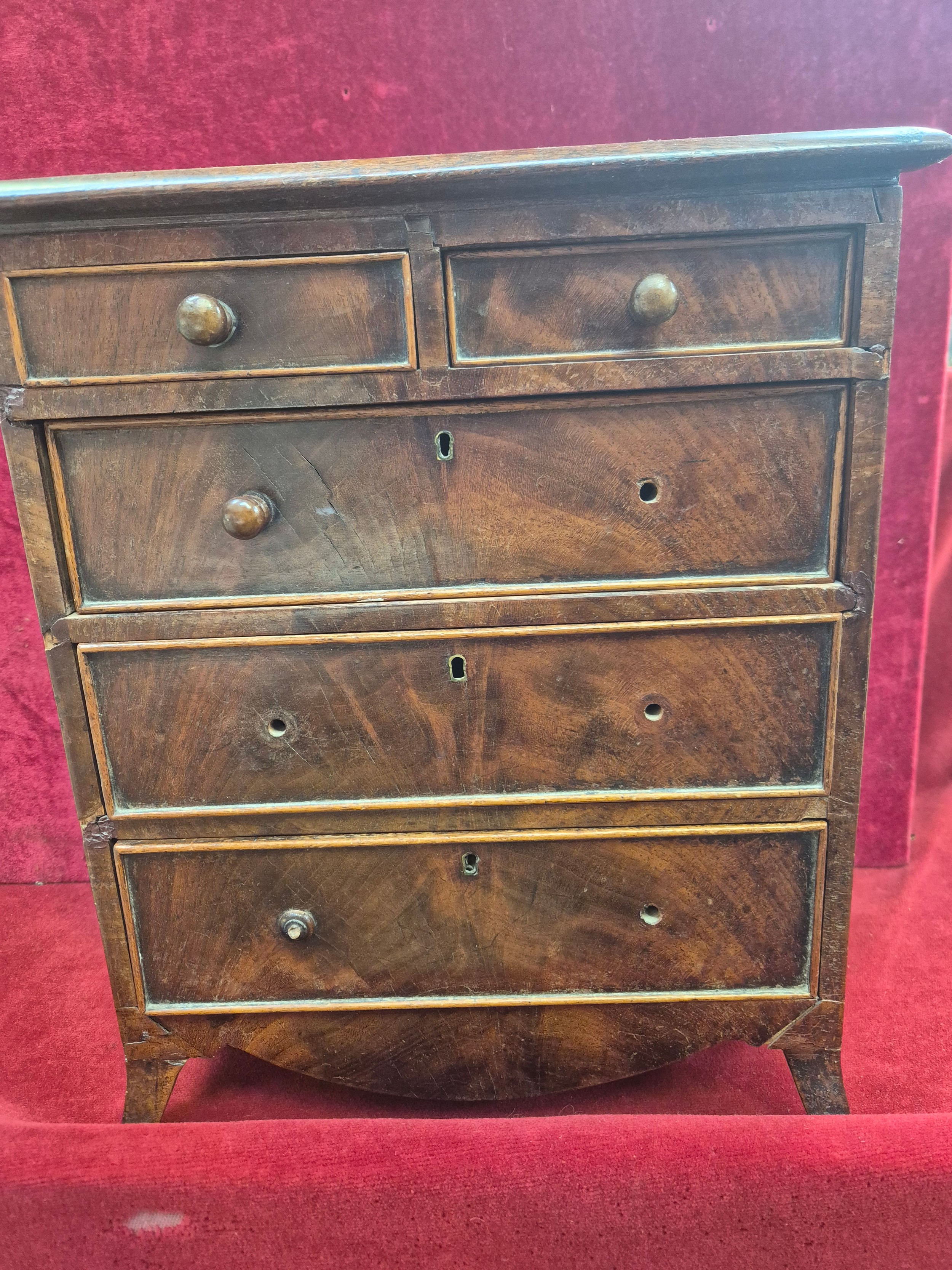 Good quality miniature apprentice piece chest of drawers. Pine & mahogany carcass, with flame mahogany veneer and oak lined drawers - Needs some TLC/Restoration project.