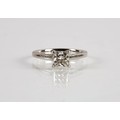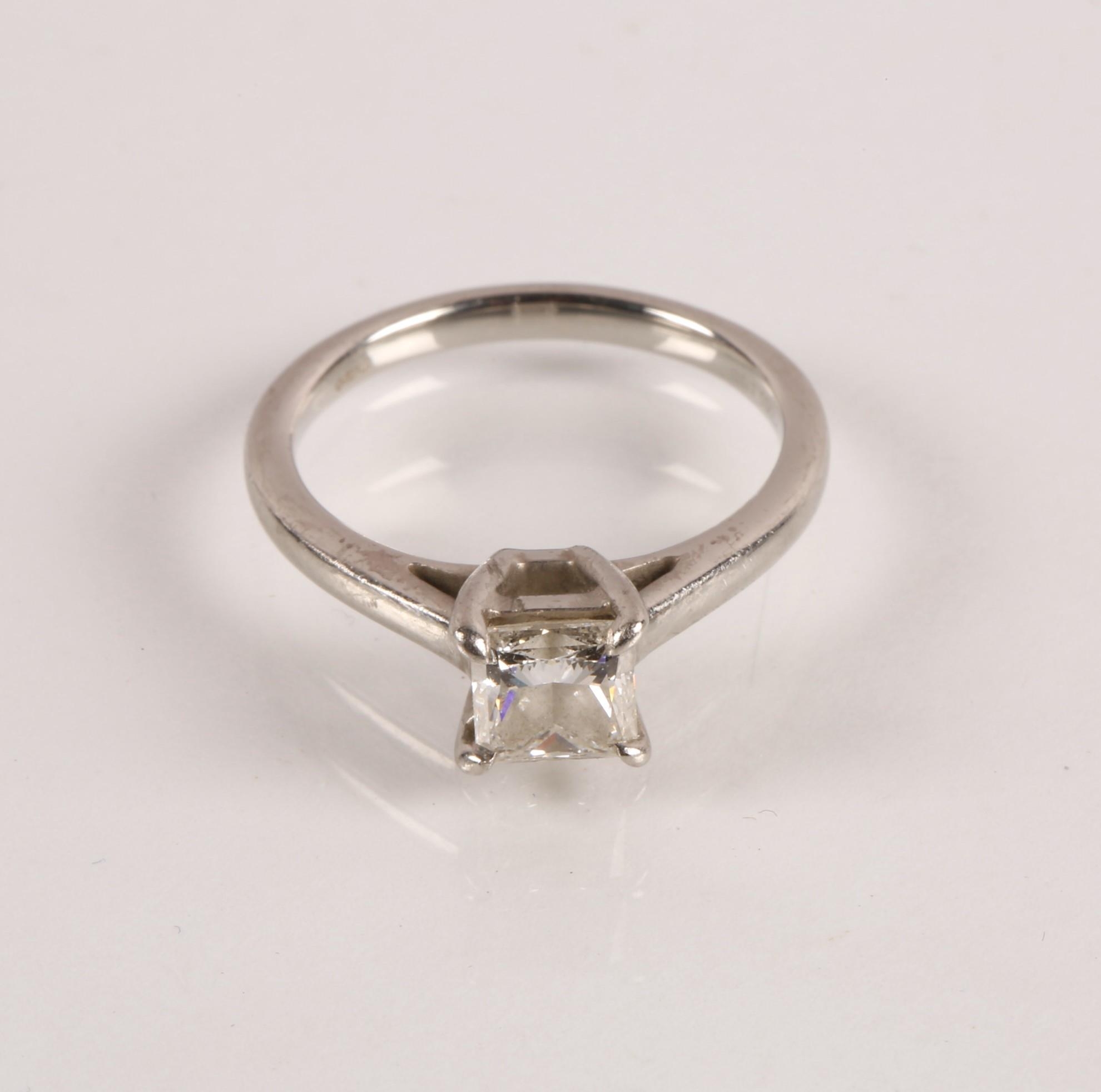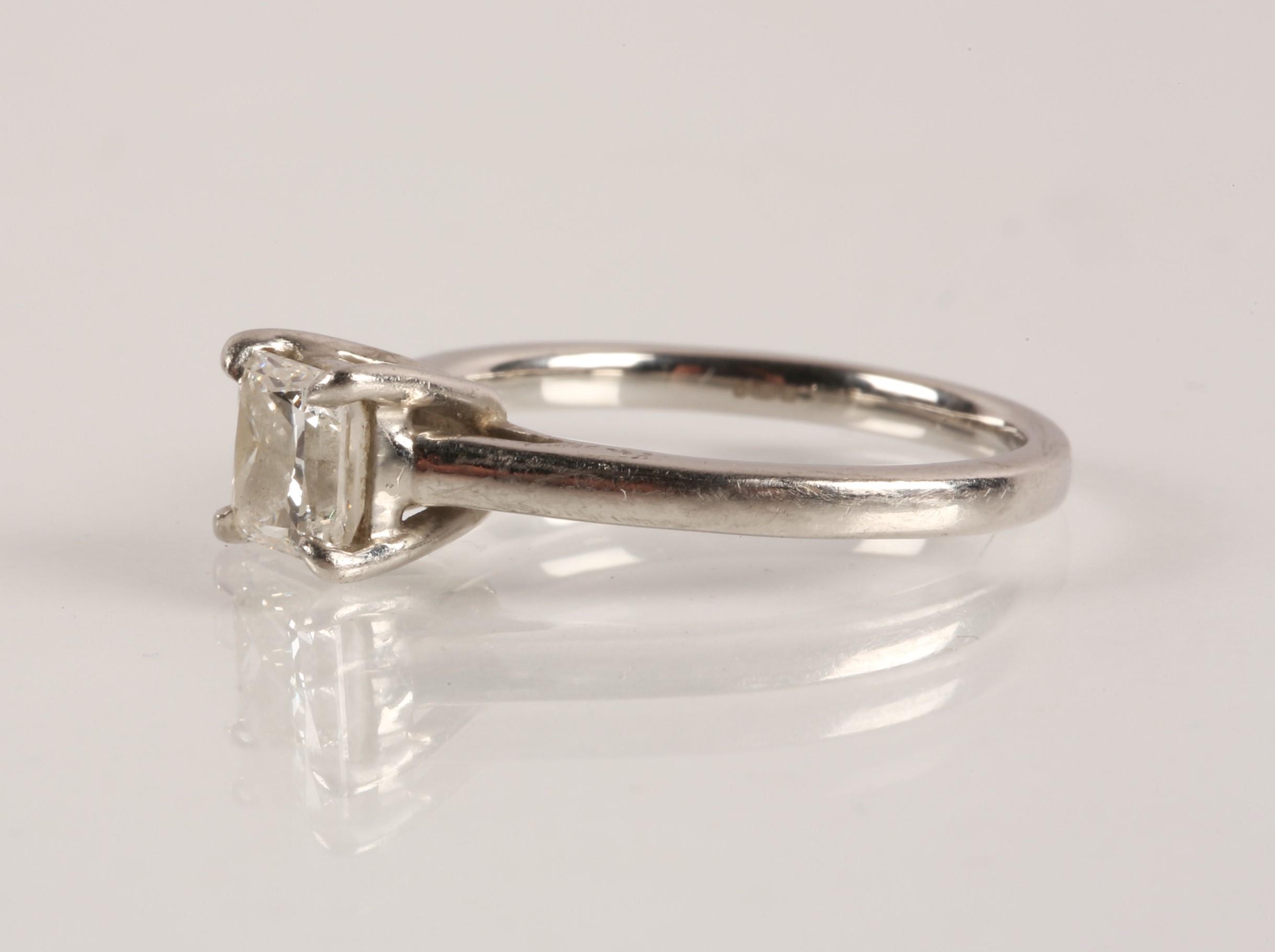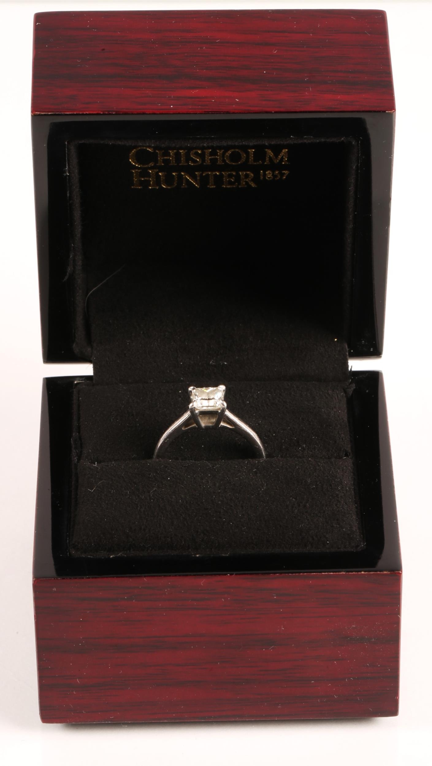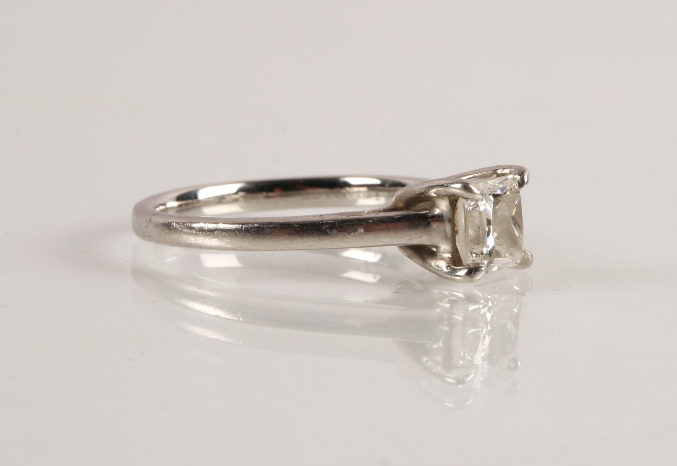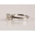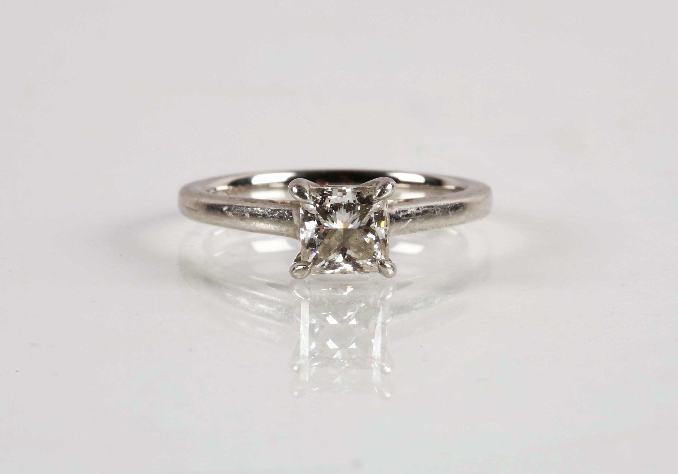 Platinum ring set with square cut diamond solitaire, diamond is lab grown and just under 1ct in weight, ring size M, gross weight 5.2g, with box