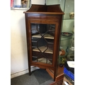 An Edwardian mahogany and inlaid corner display cabinet, with single glazed door enclosing lined shelves, on tapering legs -