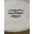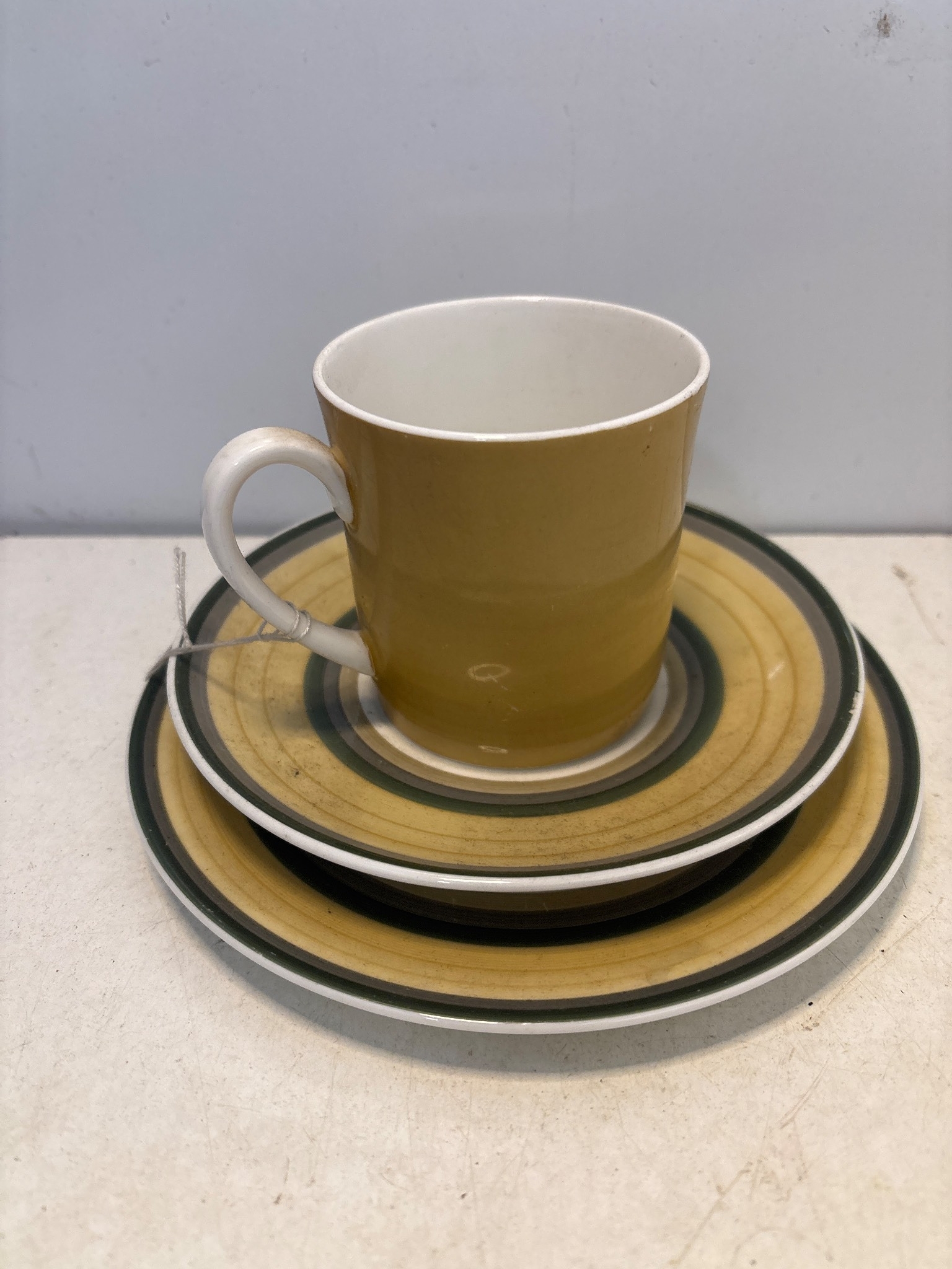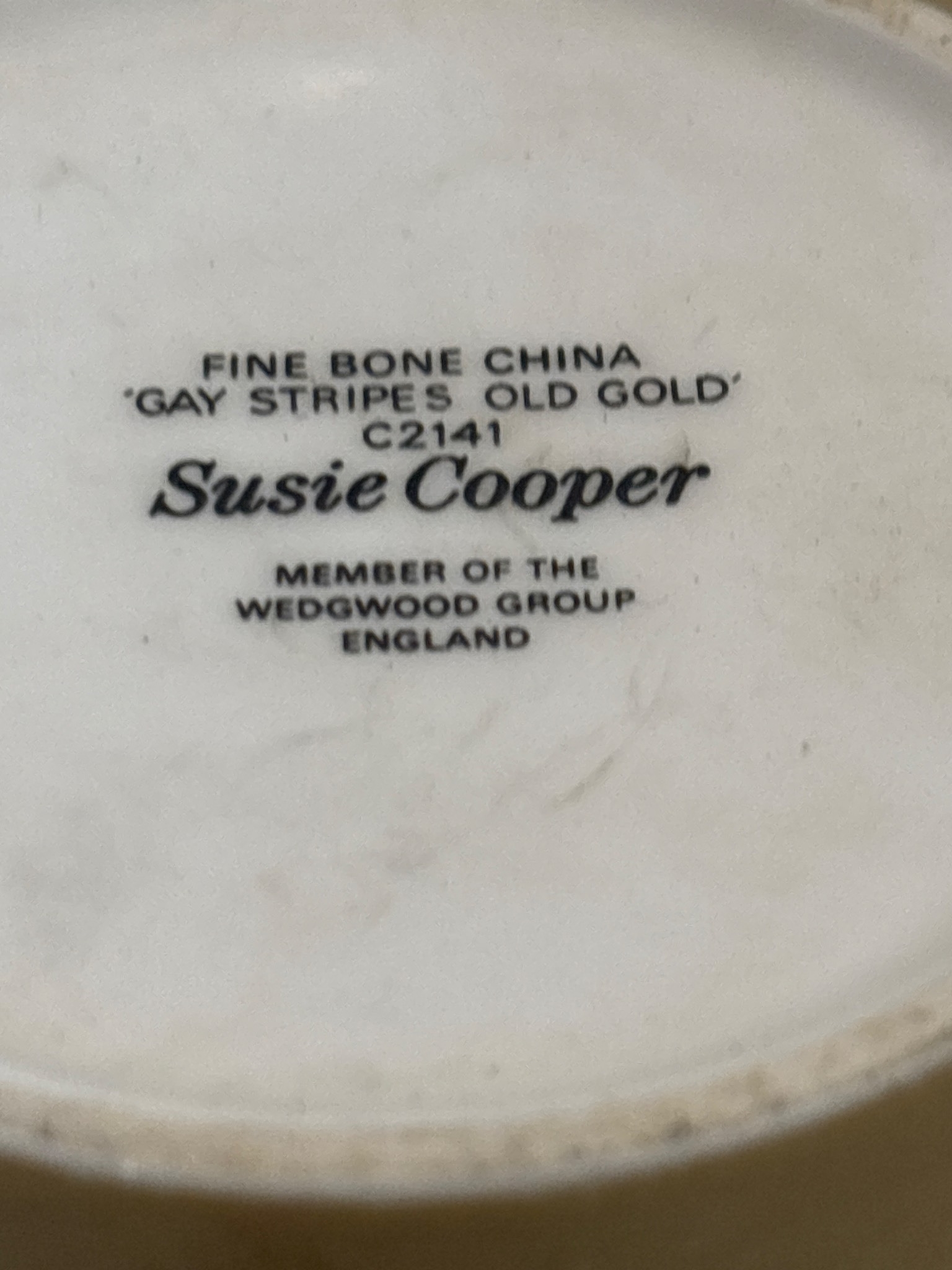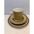 Susie Cooper 'Gay Stripes Old Gold' fine bone china set comprising a cup, saucer, and plate, marked C2141 and produced in England by the Wedgwood Group.