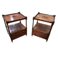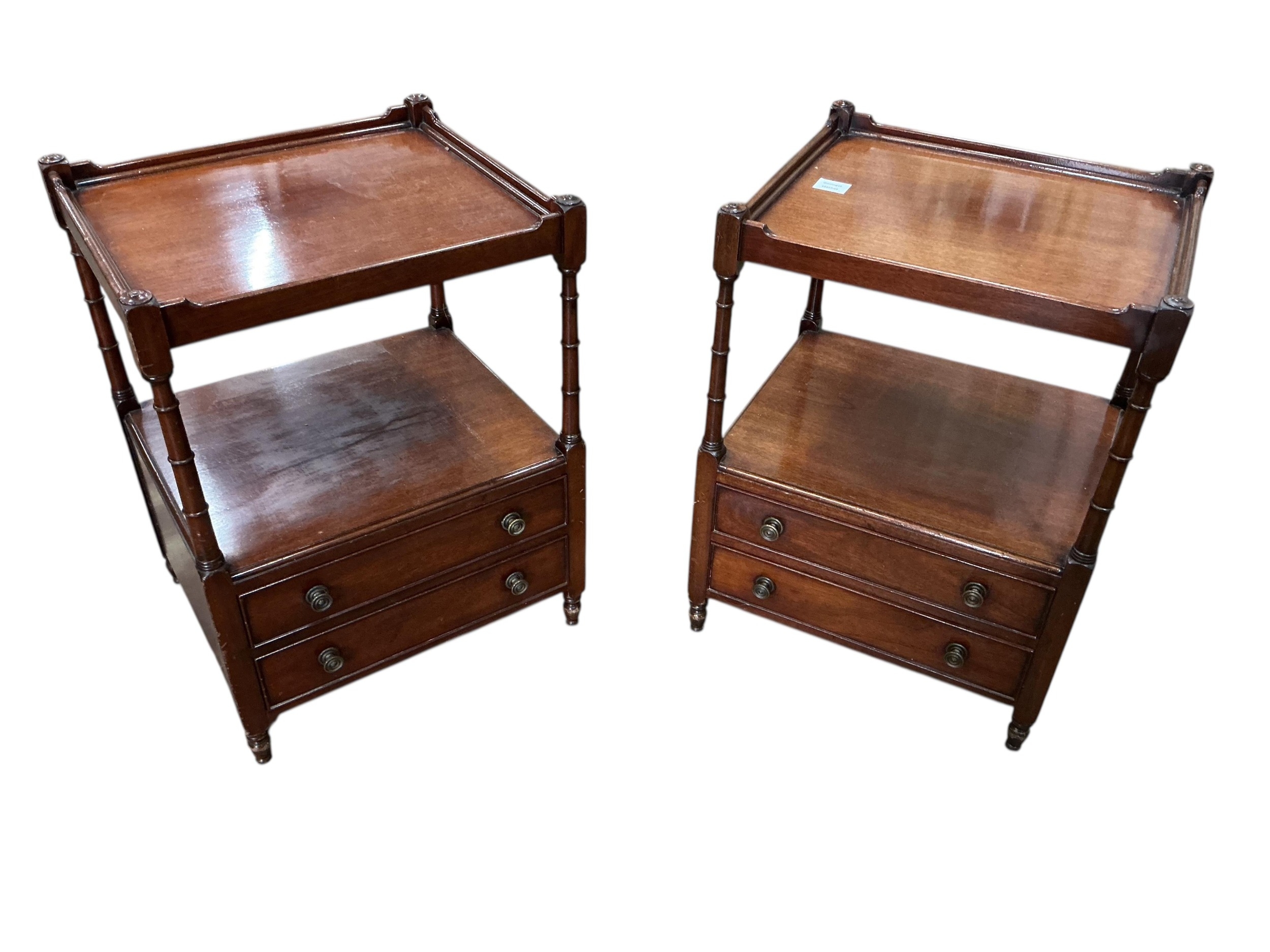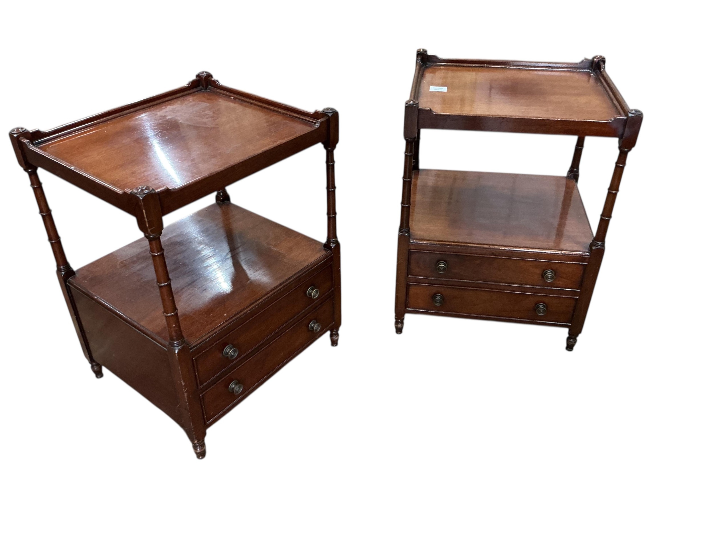 A pair of reproduction George III style mahogany two tier occasional tables, width 48cm, depth 41cm, height 65cm