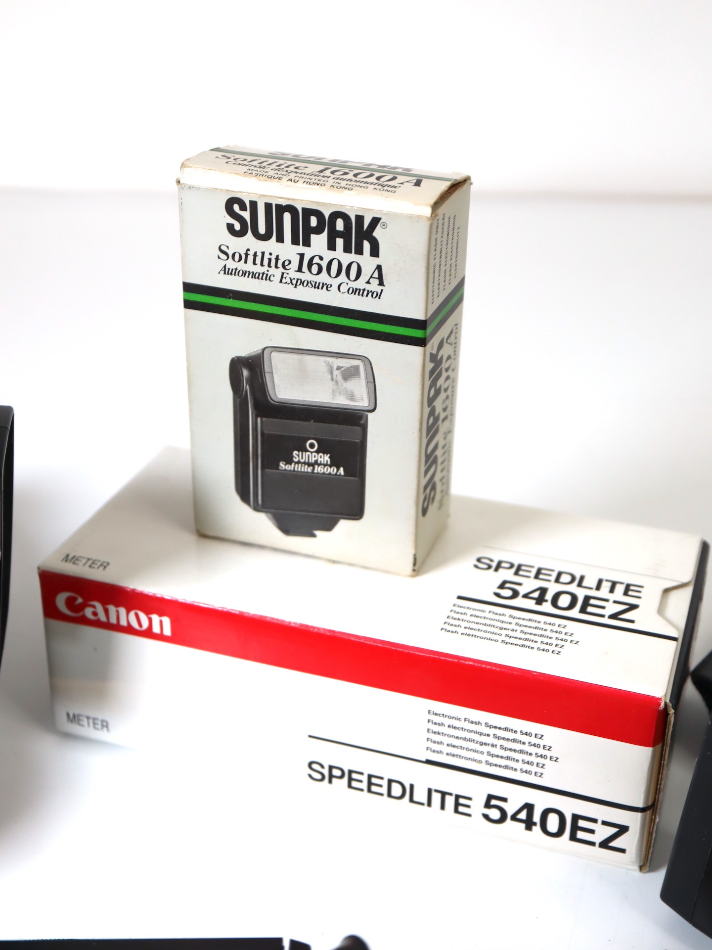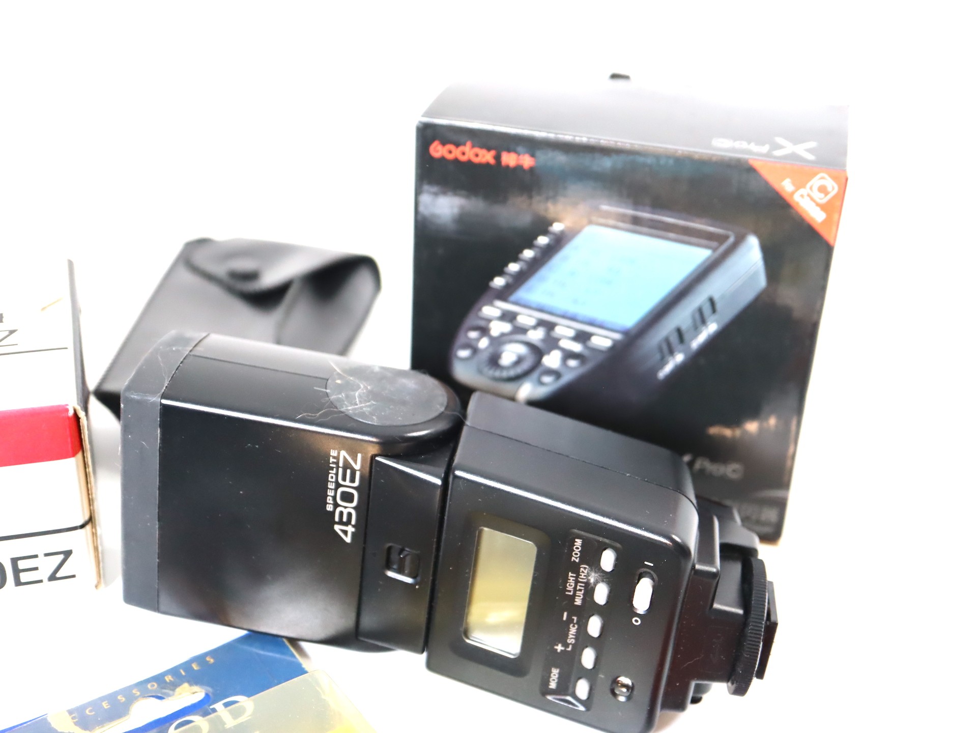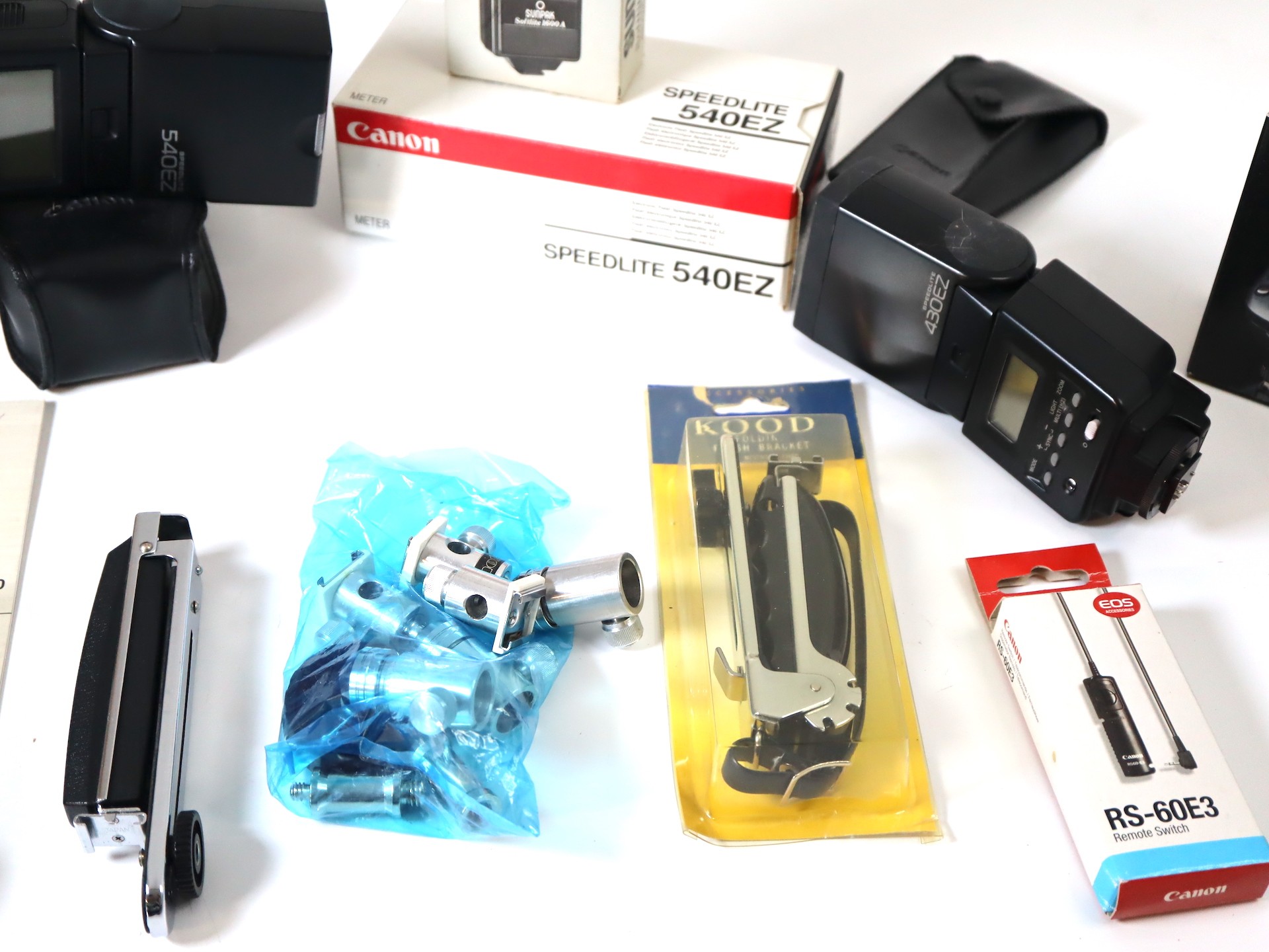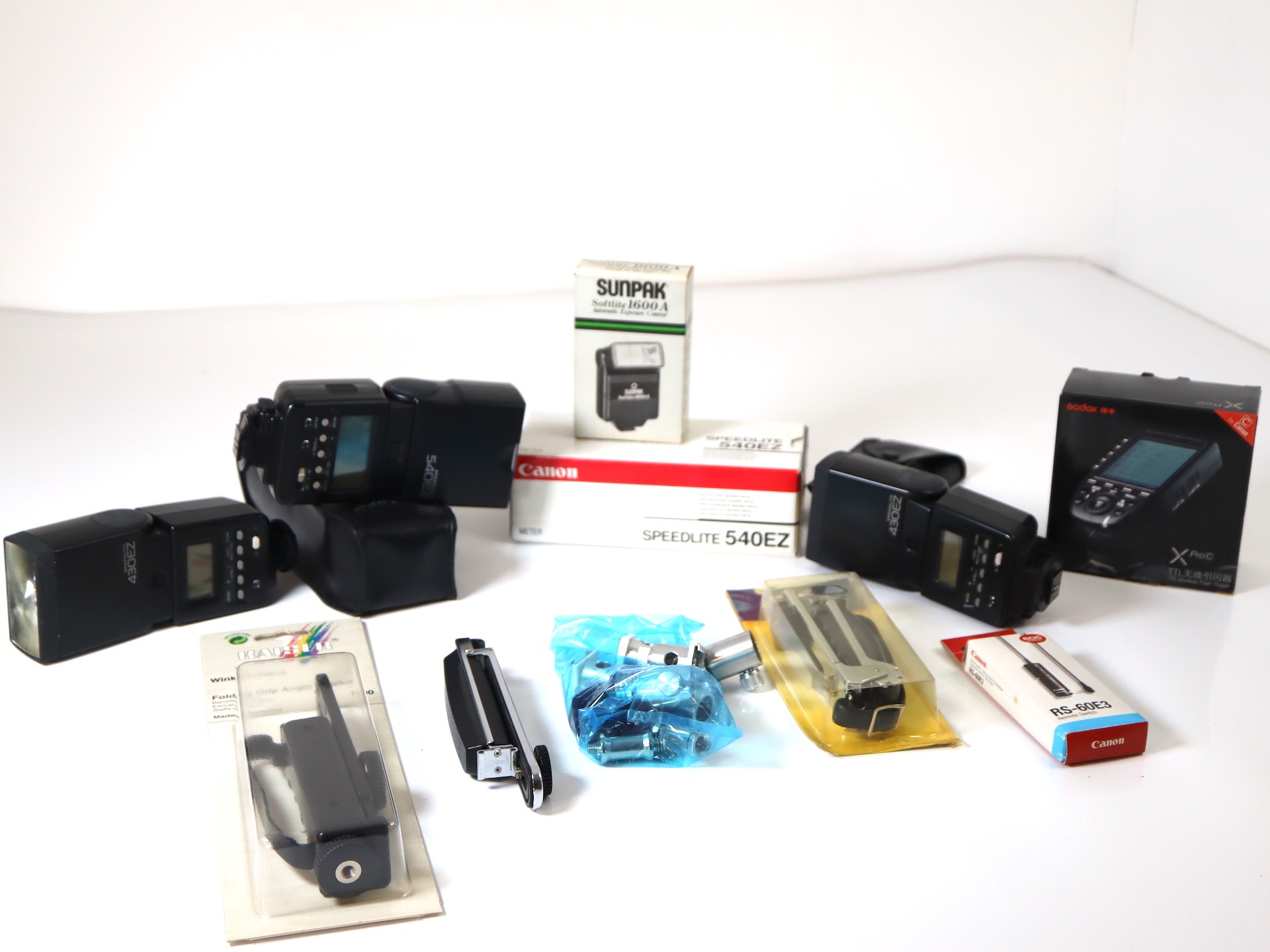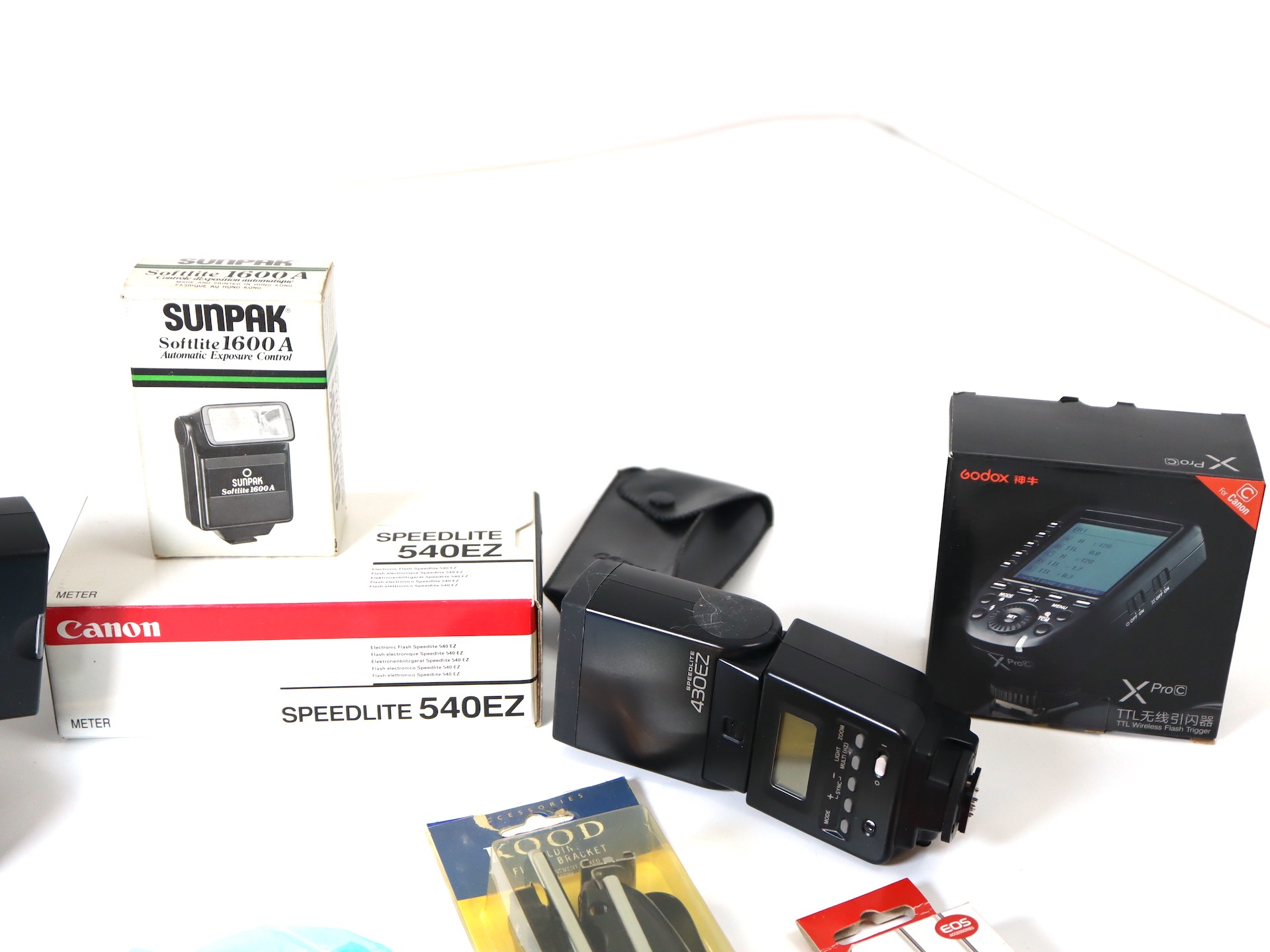 A group of Canon Flashes including Speedlight 540ez x 2, Speedlight 430ez x2 Godox X Pro c TTL Wireless Flash Trigger + other flashes and holding equipment
