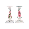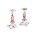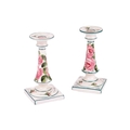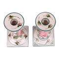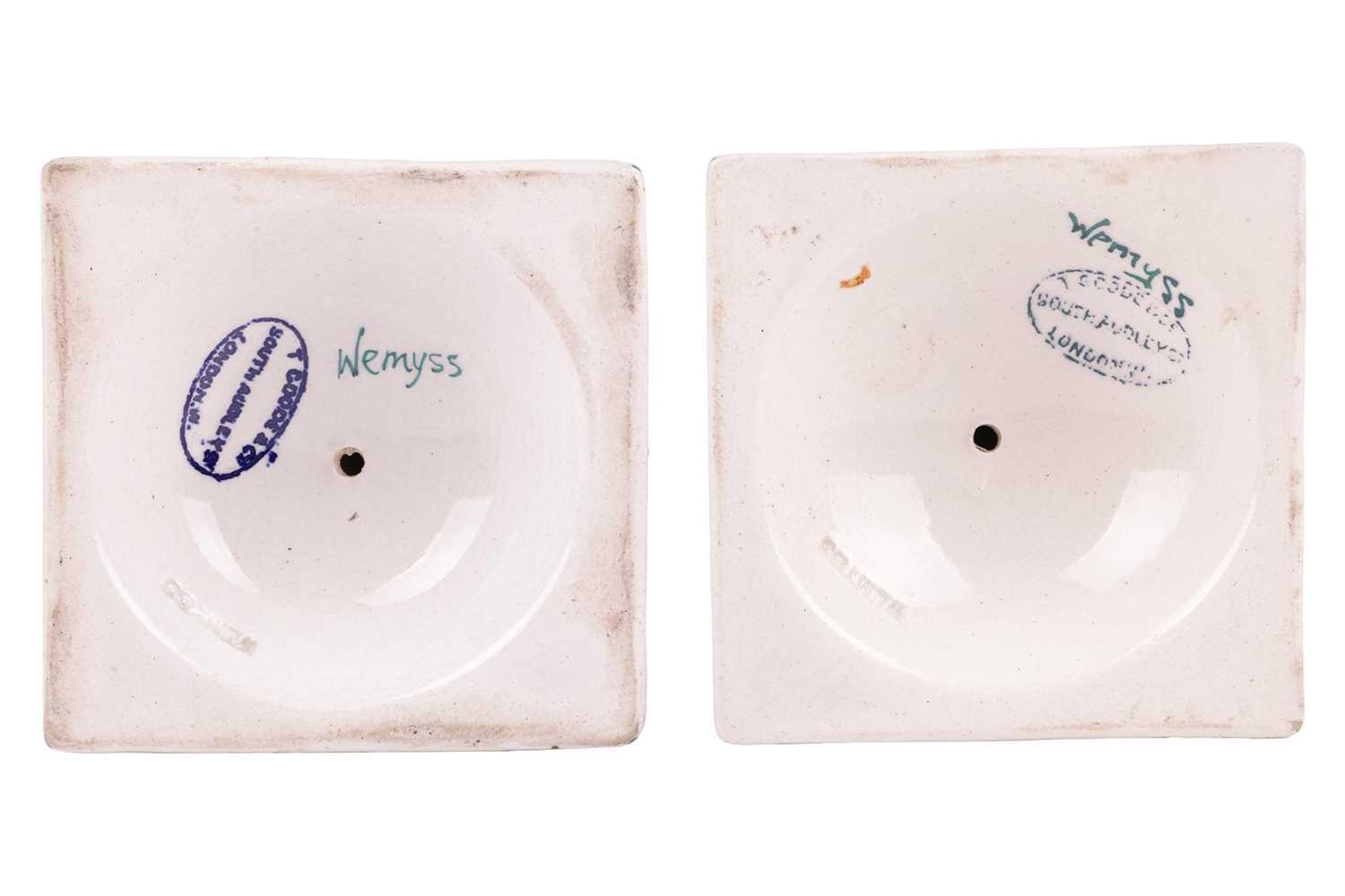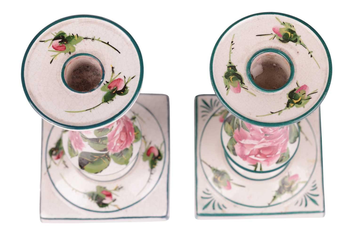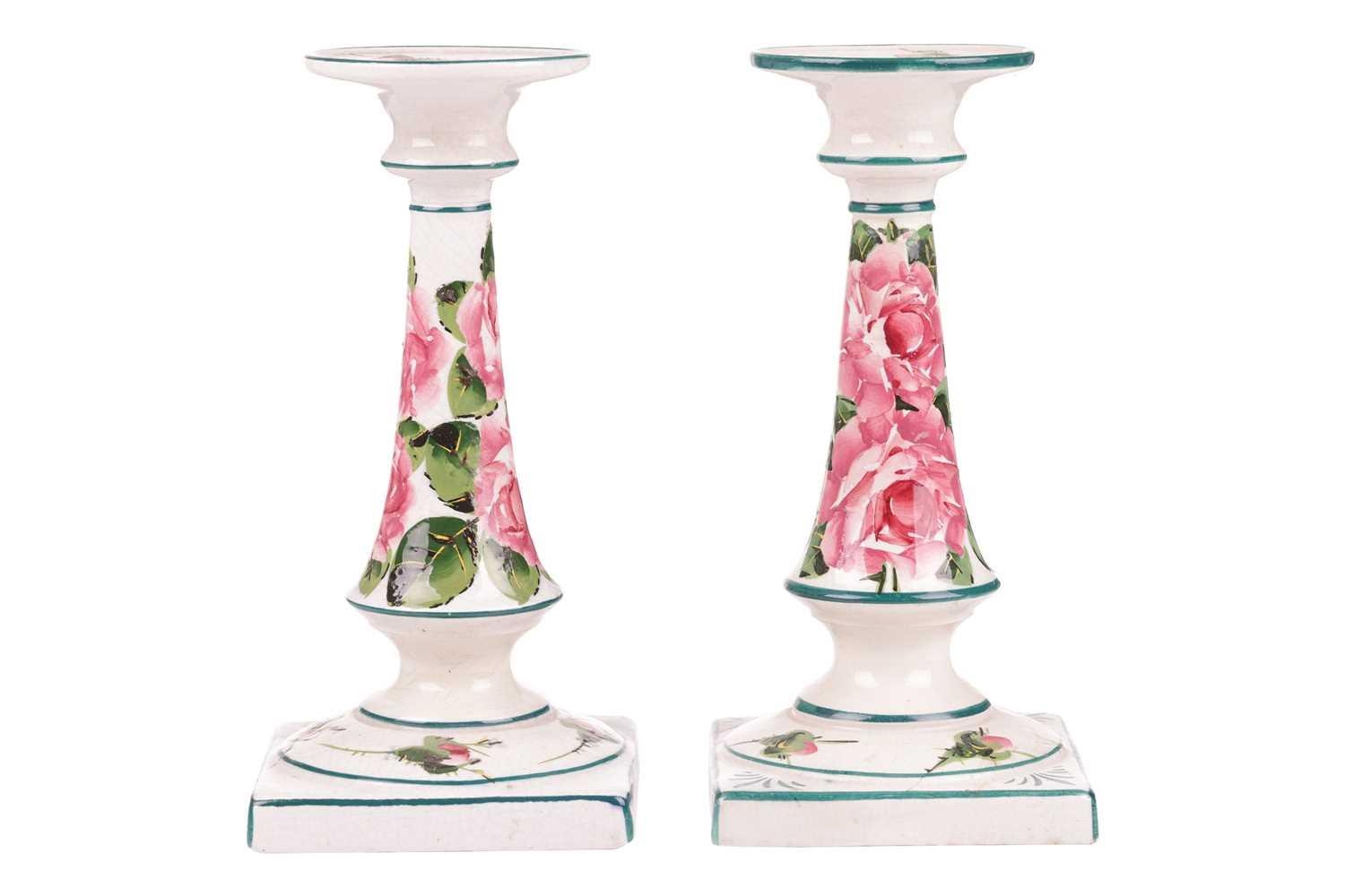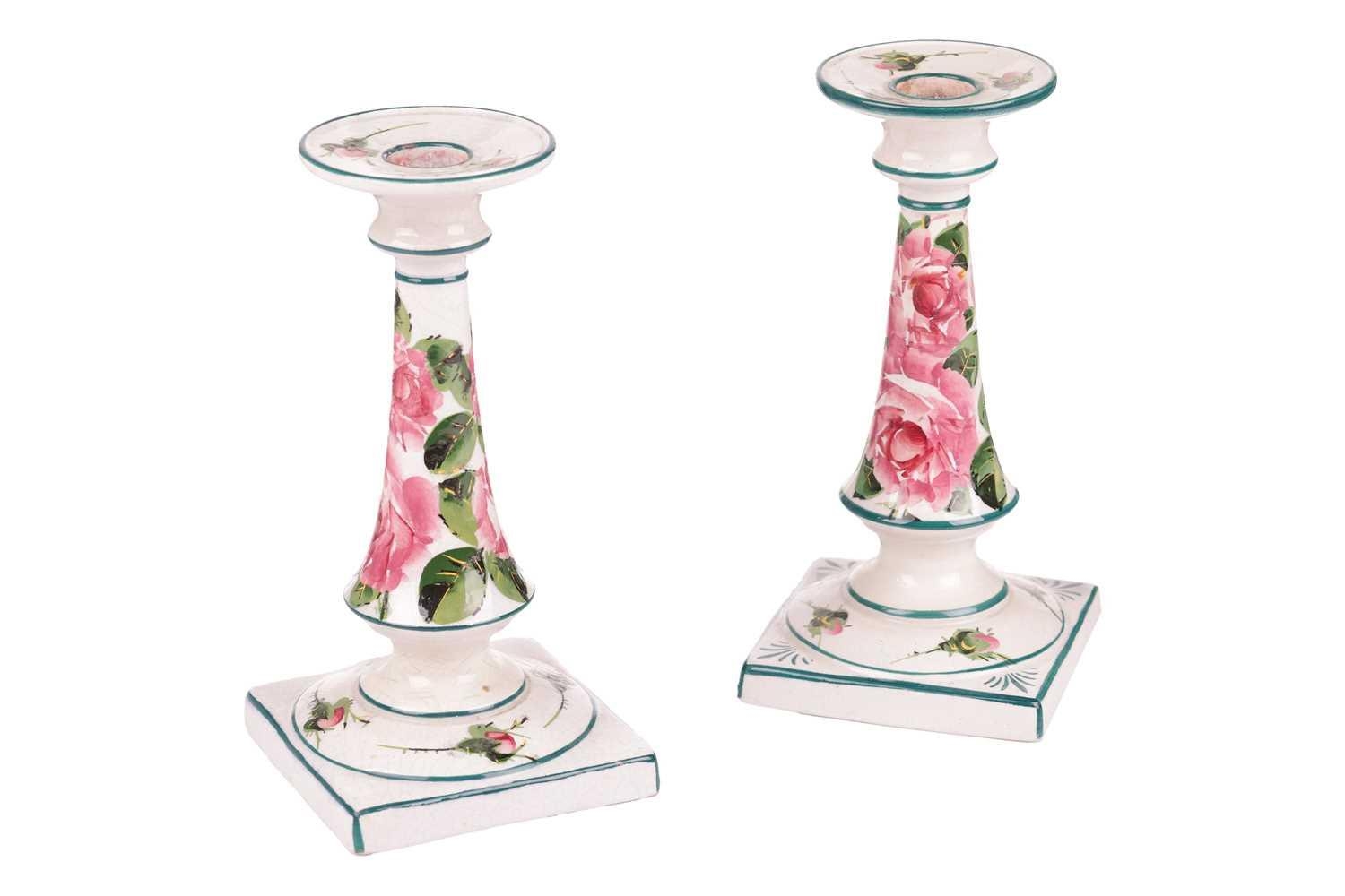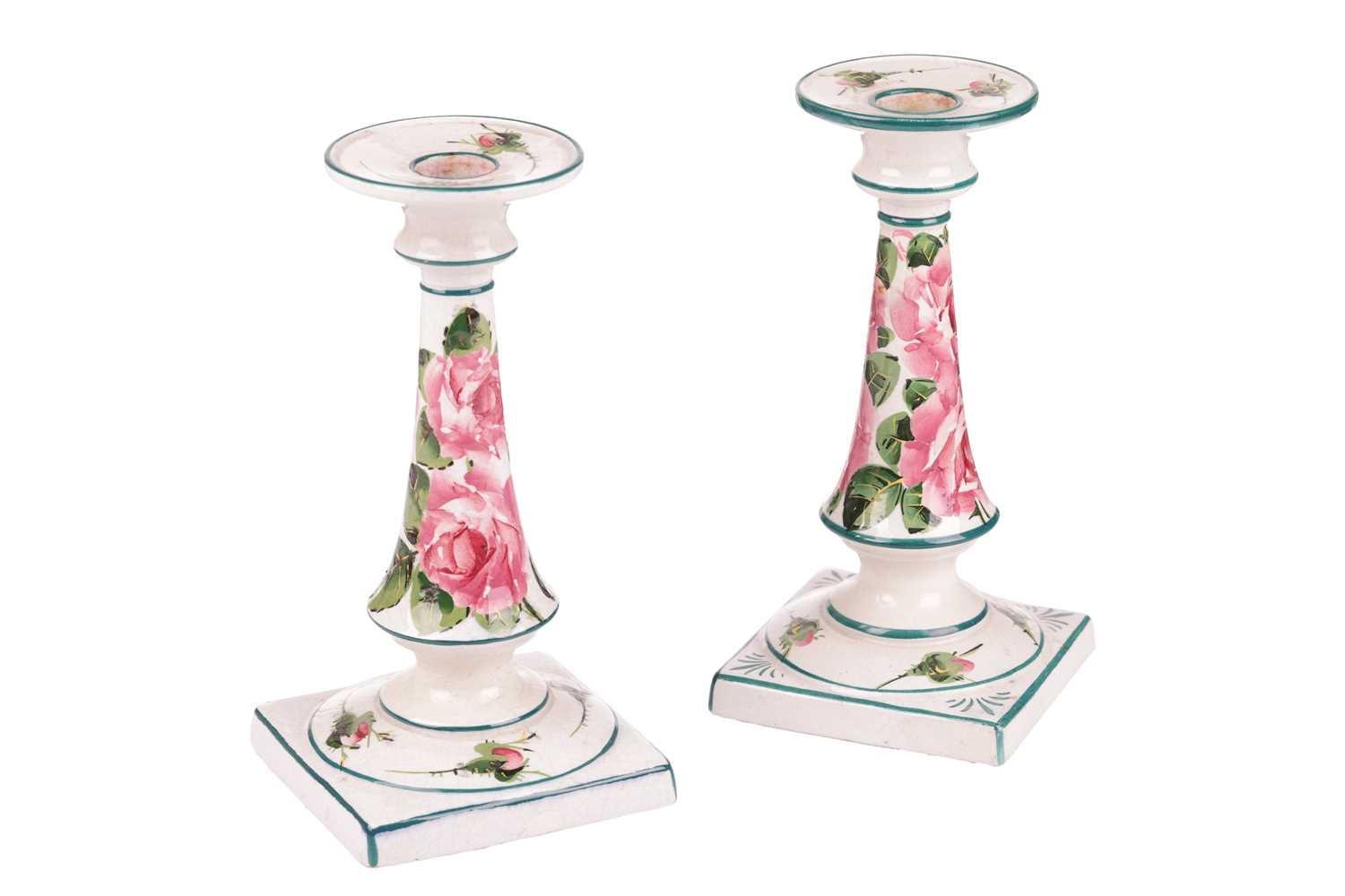 A pair of Wemyss pottery candlesticks, early 20th century, of inverted tapering cylindrical form on square bases, painted with rose sprays, impressed and painted marks, retailer`s mark for T Goode and Sons, 18 cm high. Qty: (2) Crazing visible throughout. Possible professional restoration to the corner of one of the bases, with a glaze fault to the same base. No further apparent issues.