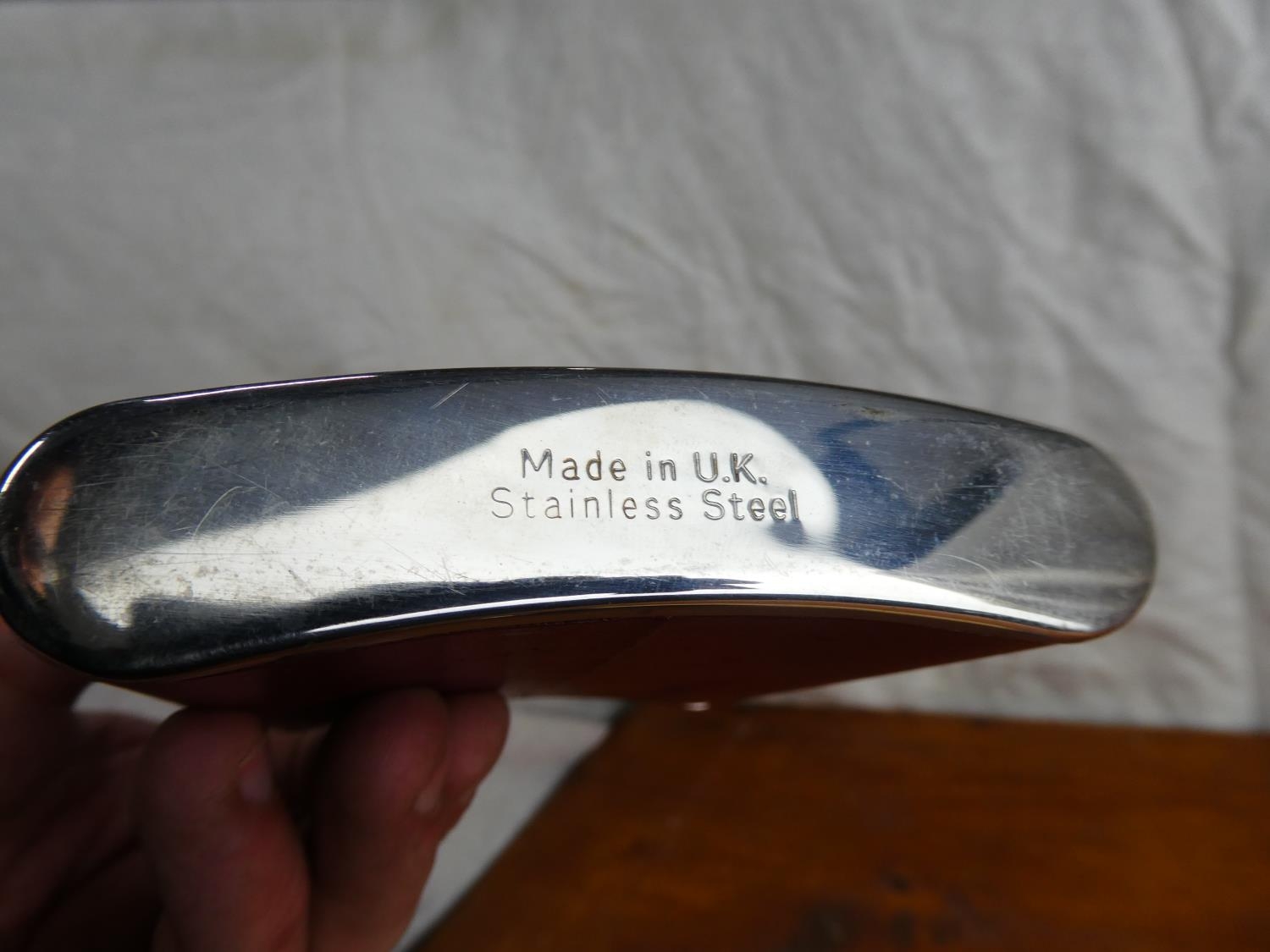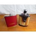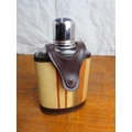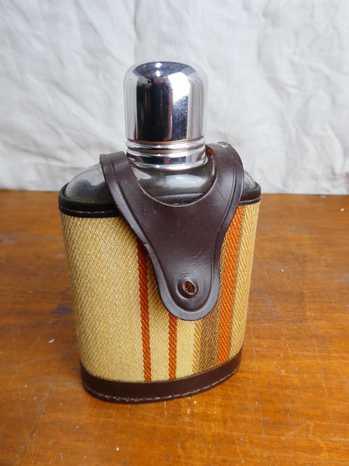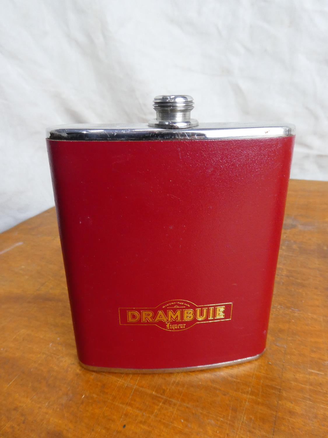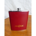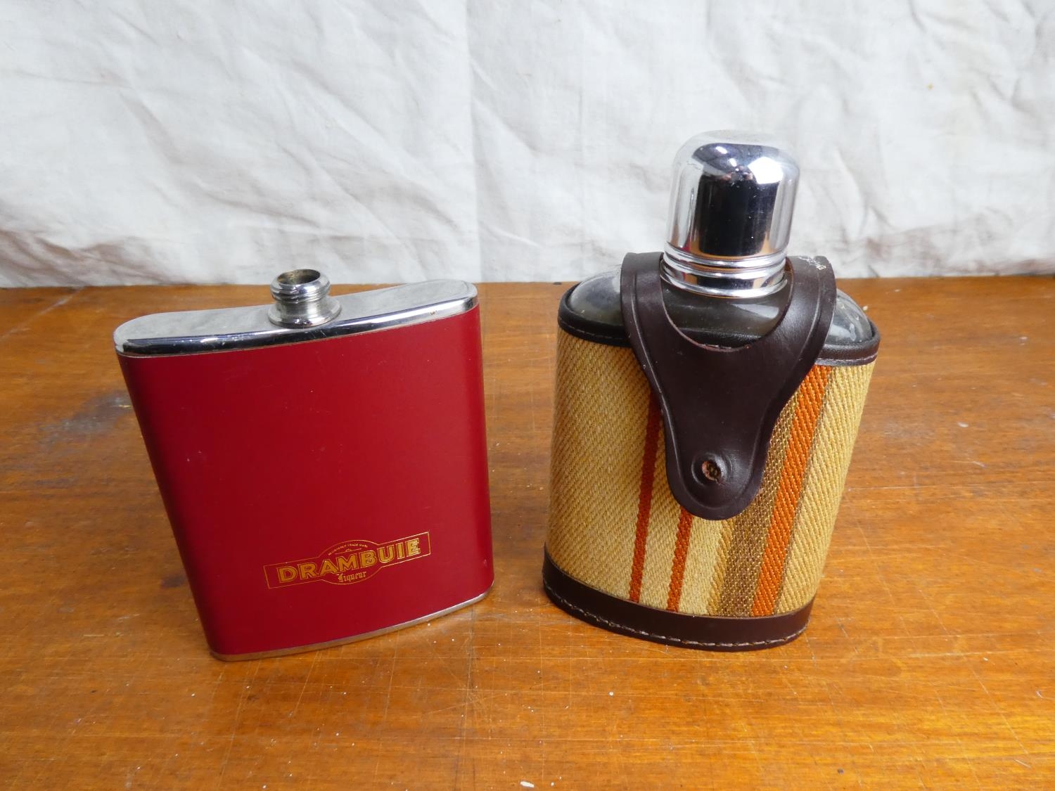A leather and fabric cased hip flask and a stainless steel 'Drambuie' hip flask (a/f).