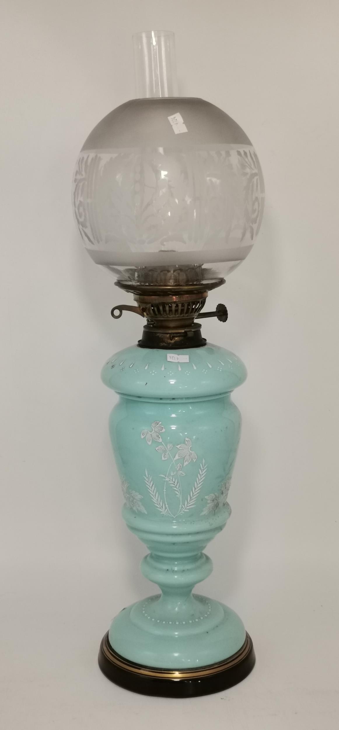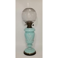 Vintage Hinks Victorian Oil Lamp with blue opaline glass and hand painted floral decoration H67cm