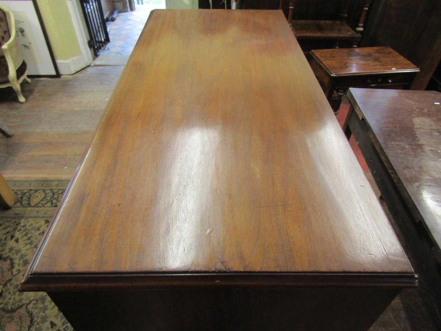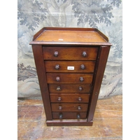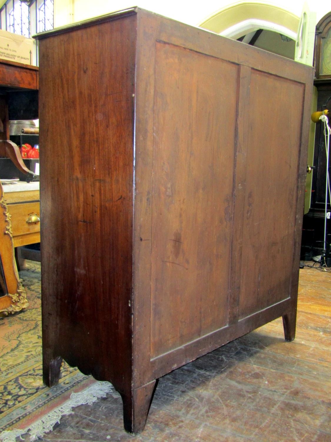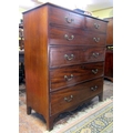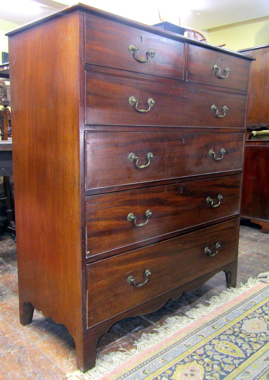 A Georgian mahogany bedroom chest of two short over four long graduated drawers with brass swan neck handles, shaped apron and bracket supports 115 cm wide x 131 cm high