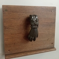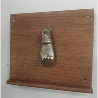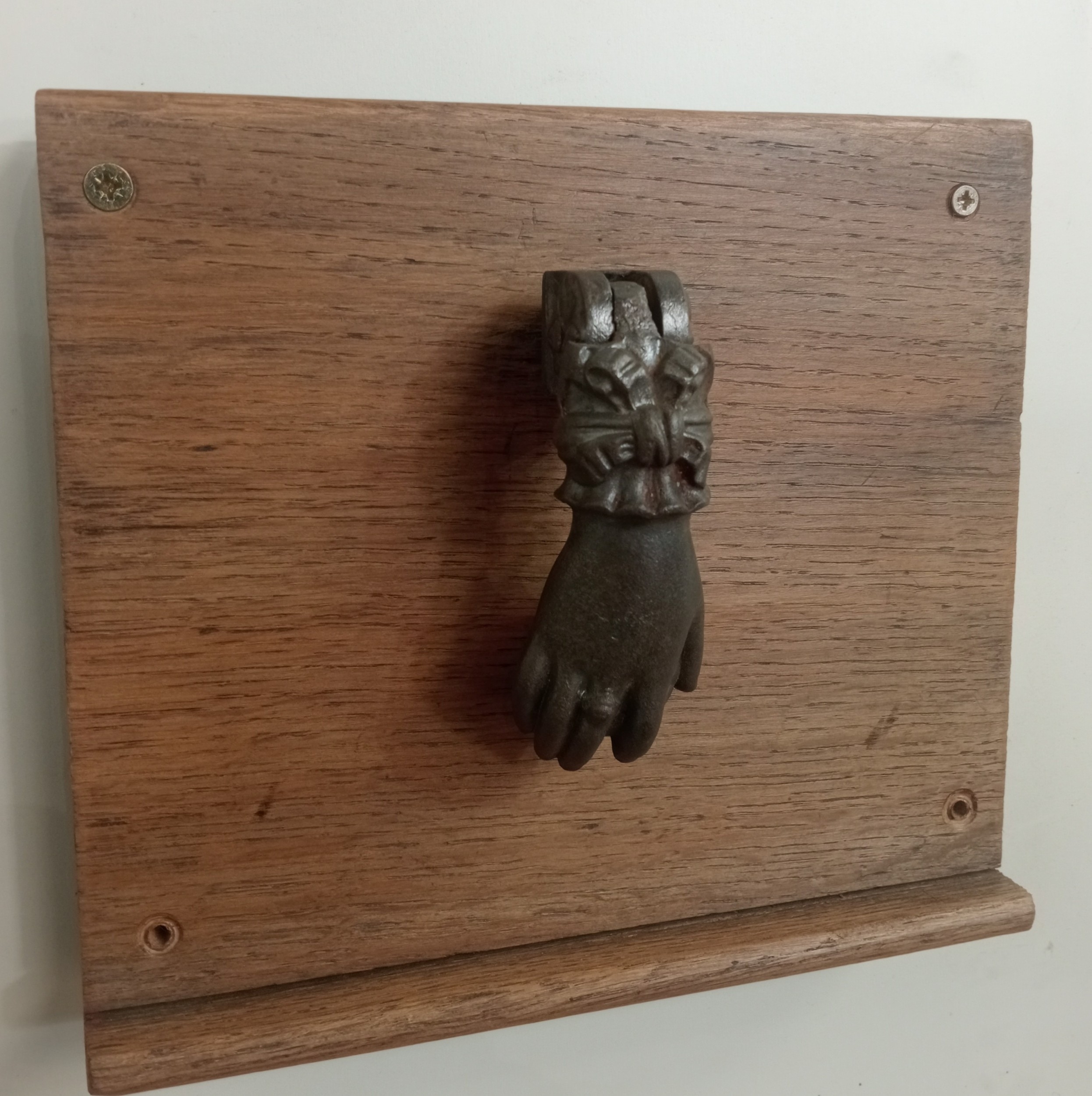 A CAST IRON DOOR KNOCKER in the form of a hand raised on a hardwood plaque 21cm (h) x 24cm (w)