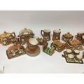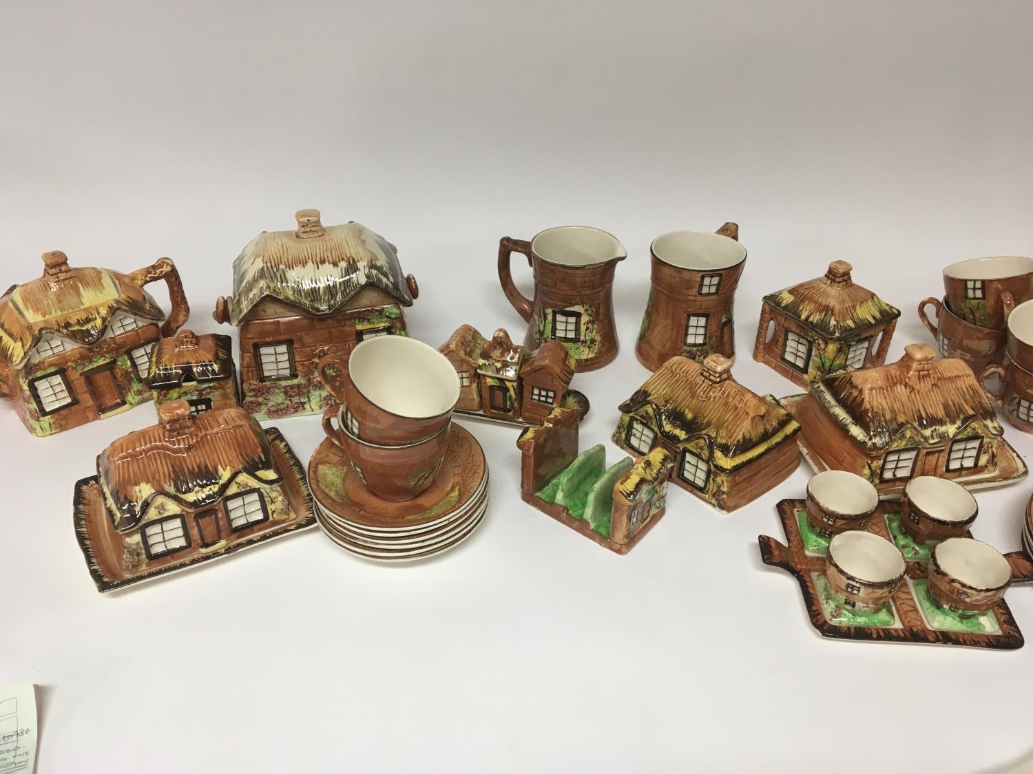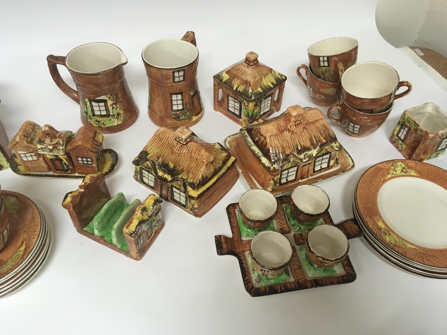 A collection of cottage ware ceramics including biscuit barrels tea pots butter dishes cups saucers and condiments. (a lot)