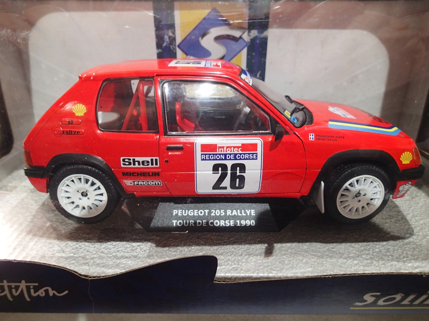 Solido 1/18 scale Peugeot 205 rally car, tour De Corse 1990, red, No 26, excellent condition, boxed. UK P&P Group 1 (£18+VAT for the first lot and £2+VAT for subsequent lots)