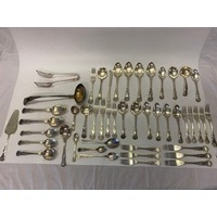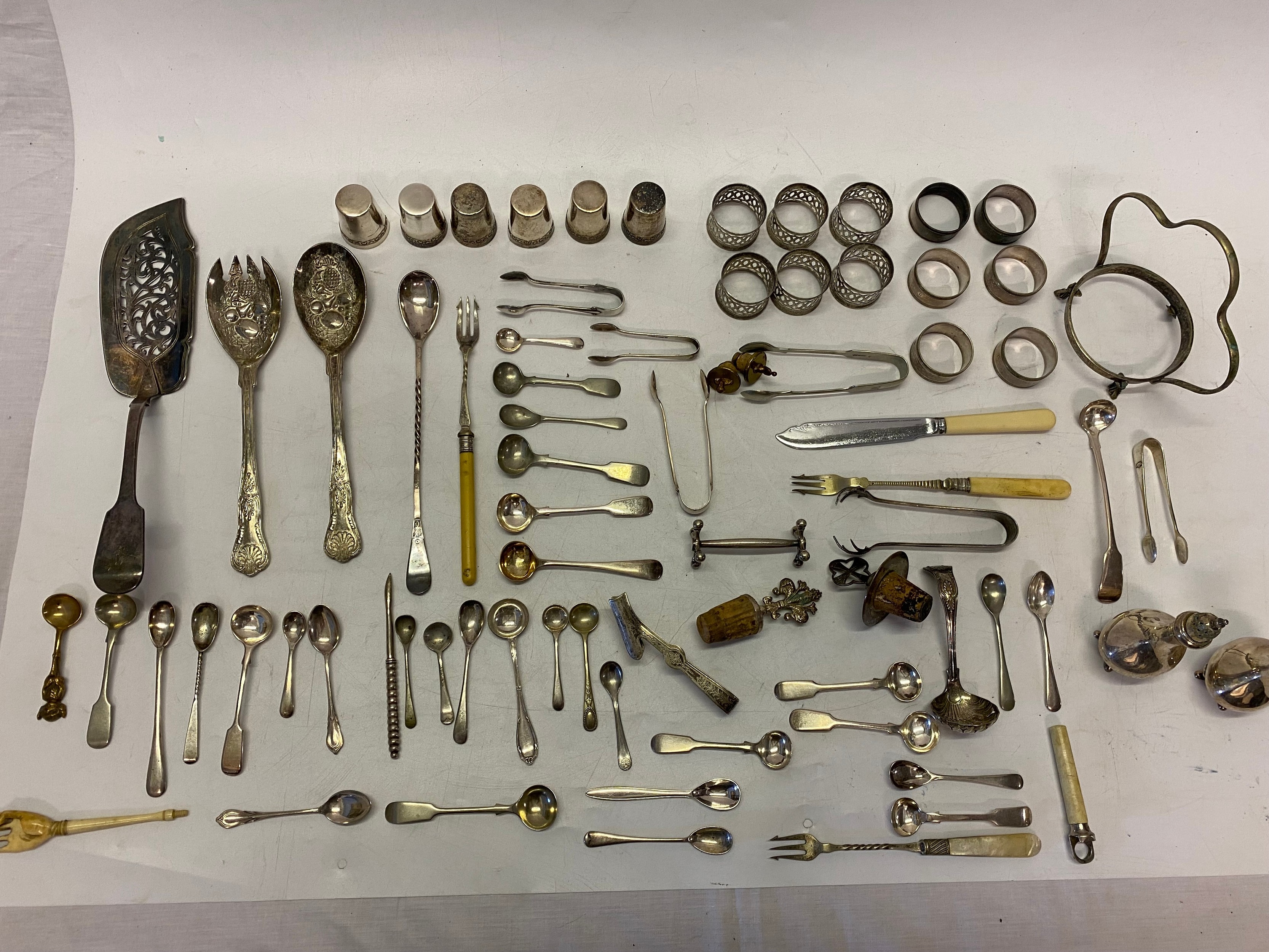A selection of silver plated flatware, napkin rings, bottle stopper etc..