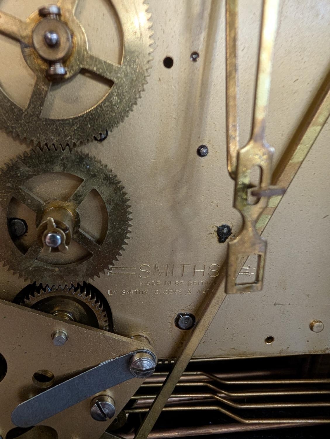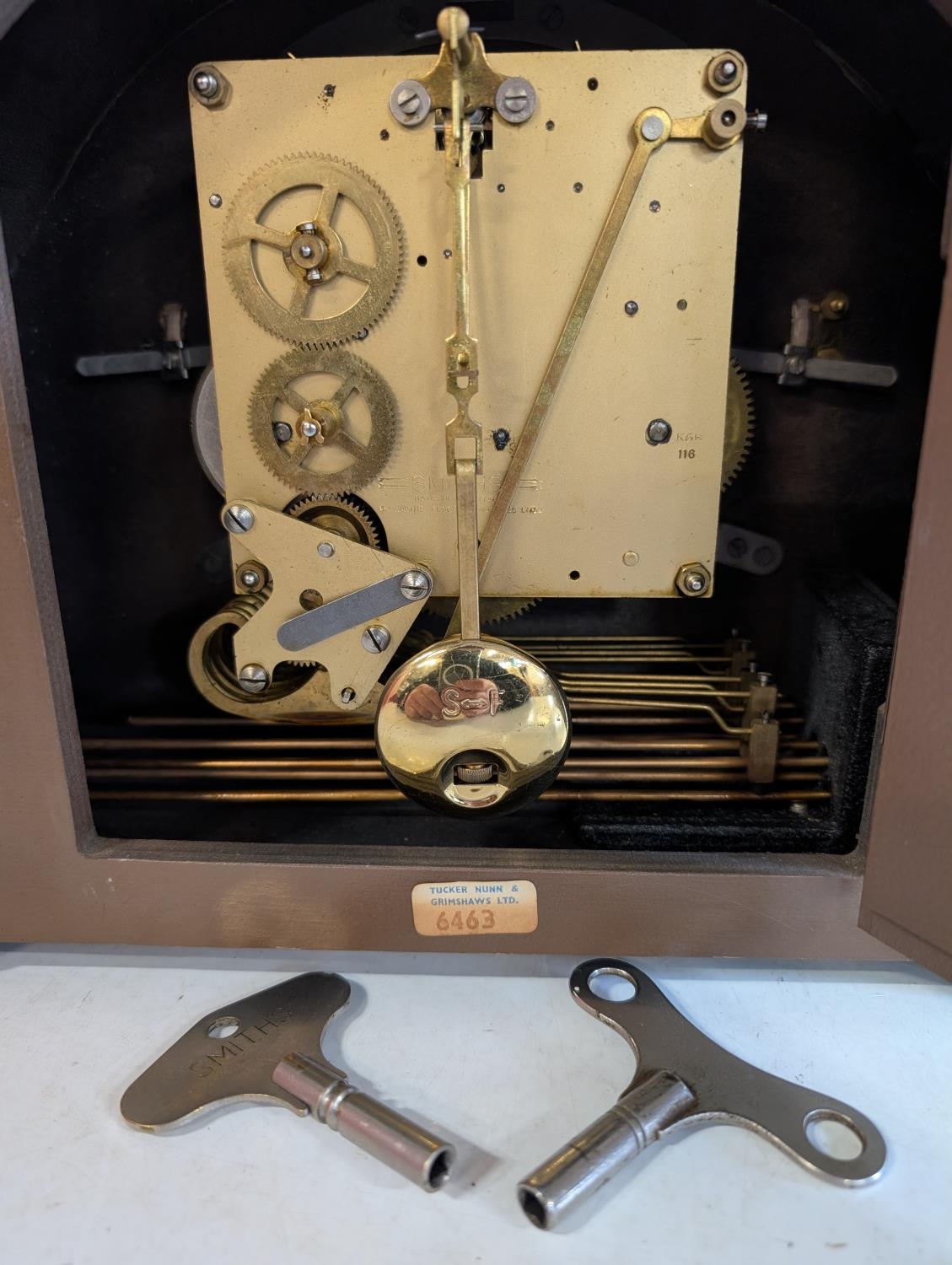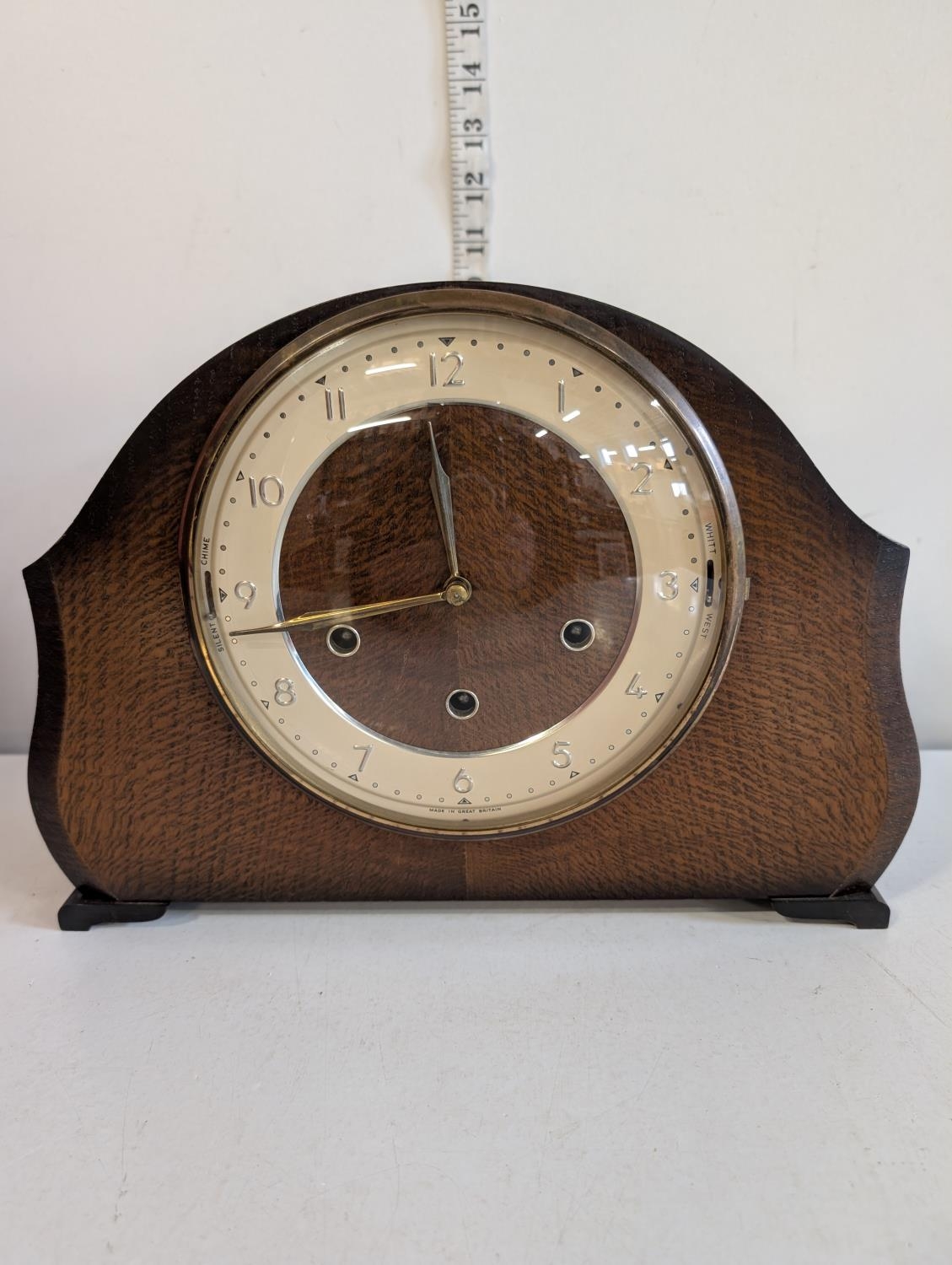 A vintage 1930's Smith's wooden cased mantle clock with key and pendulum, shipping unavailable