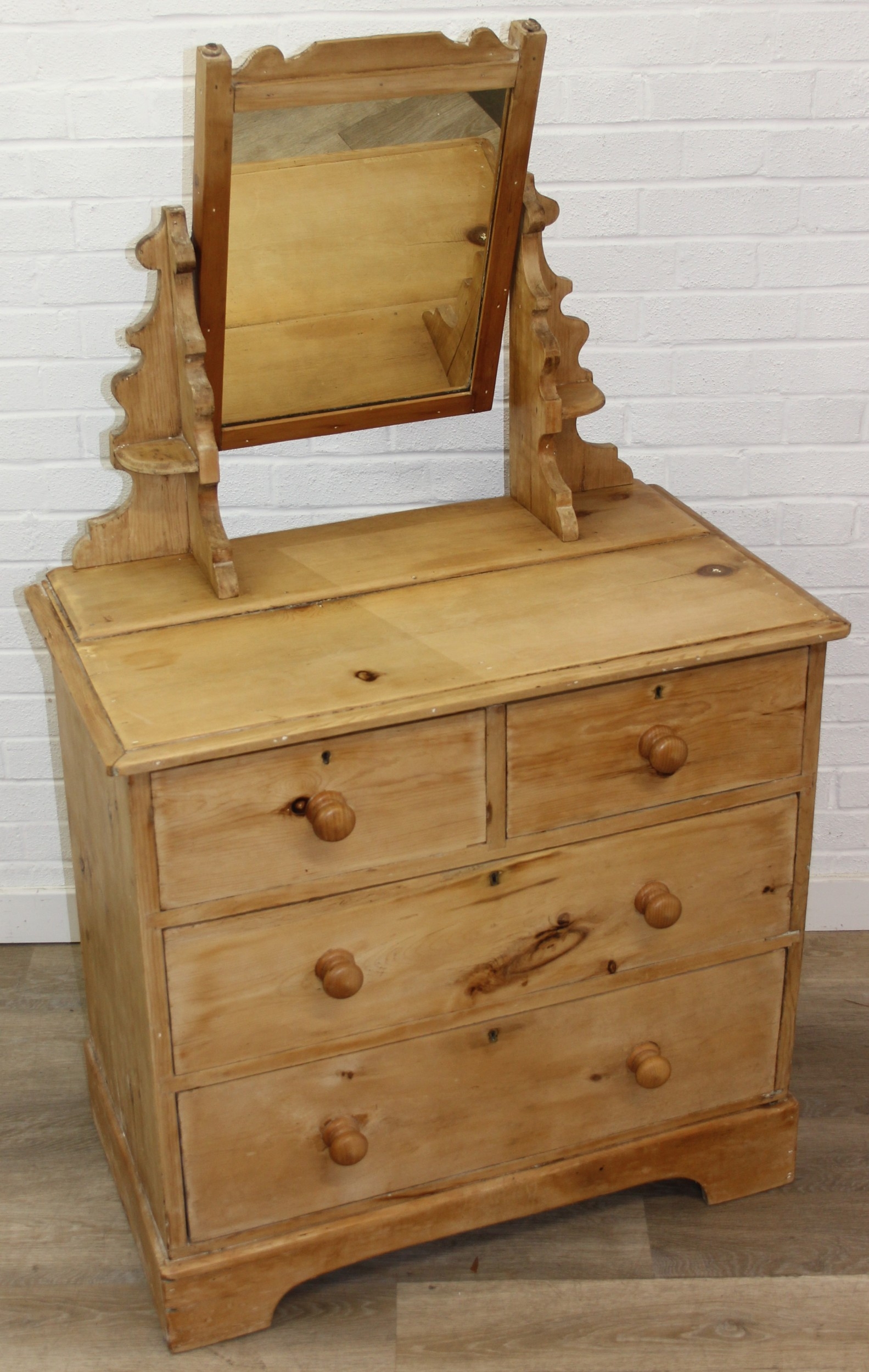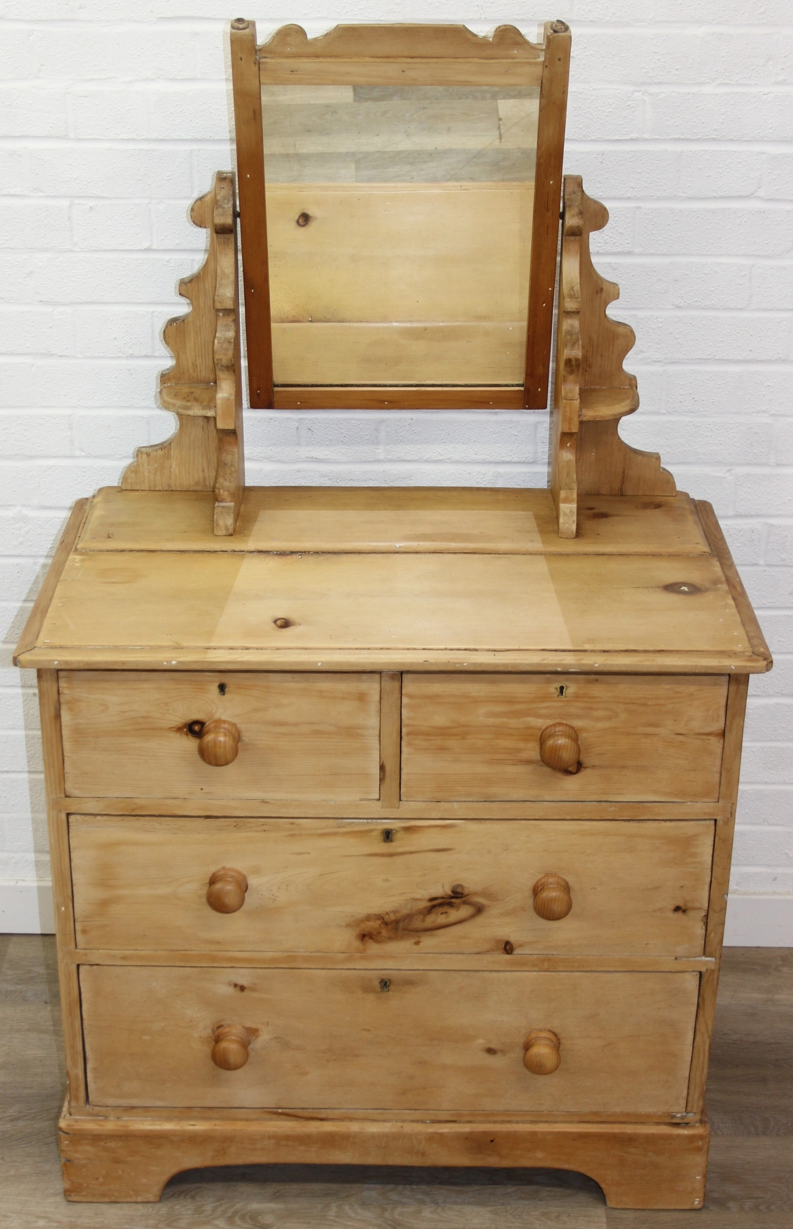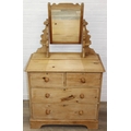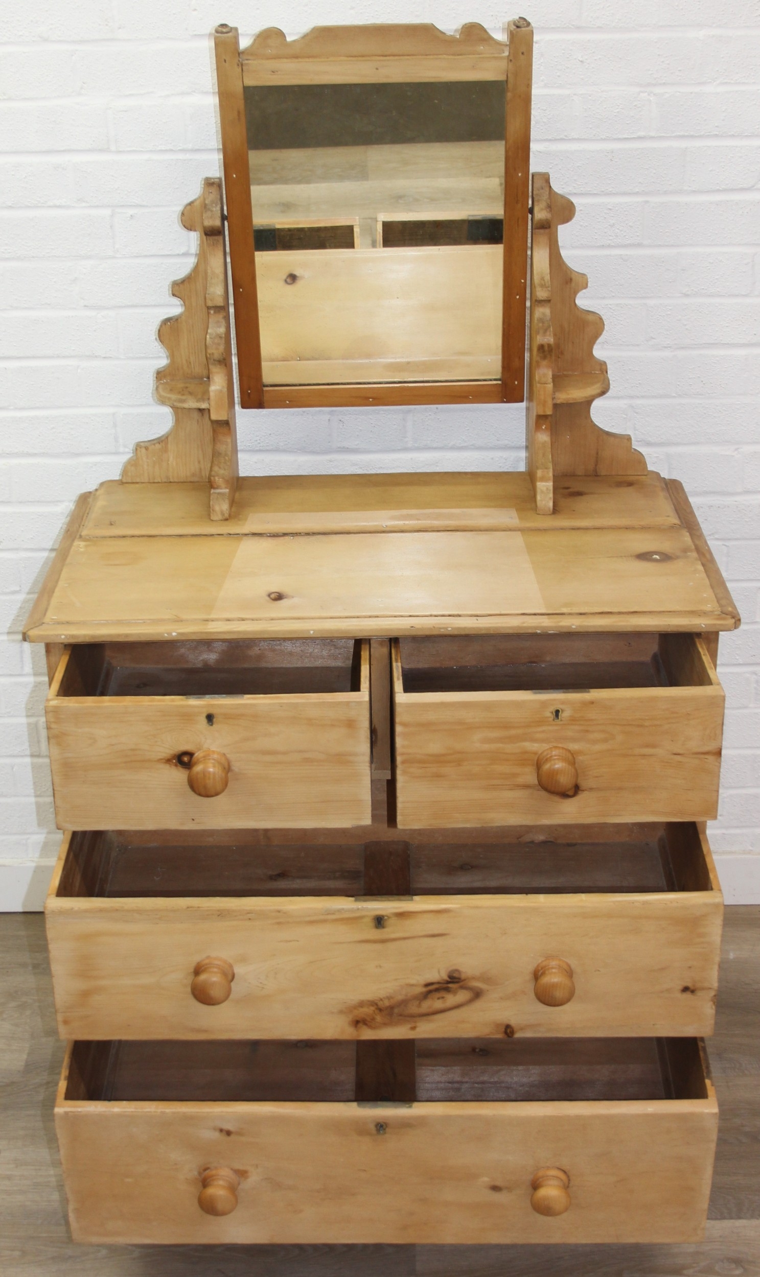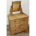 A Victorian pine dressing chest with mirror top and two over two drawers to base, 88cm x 51cm x 152cm