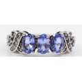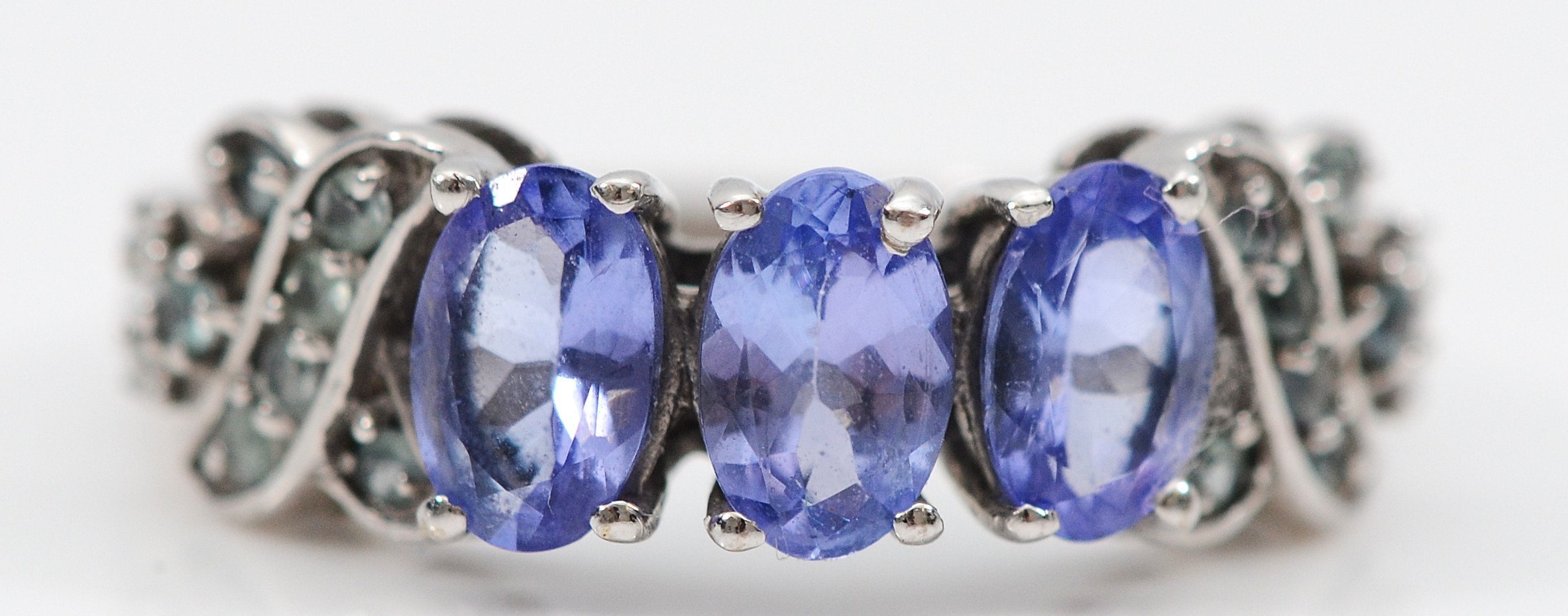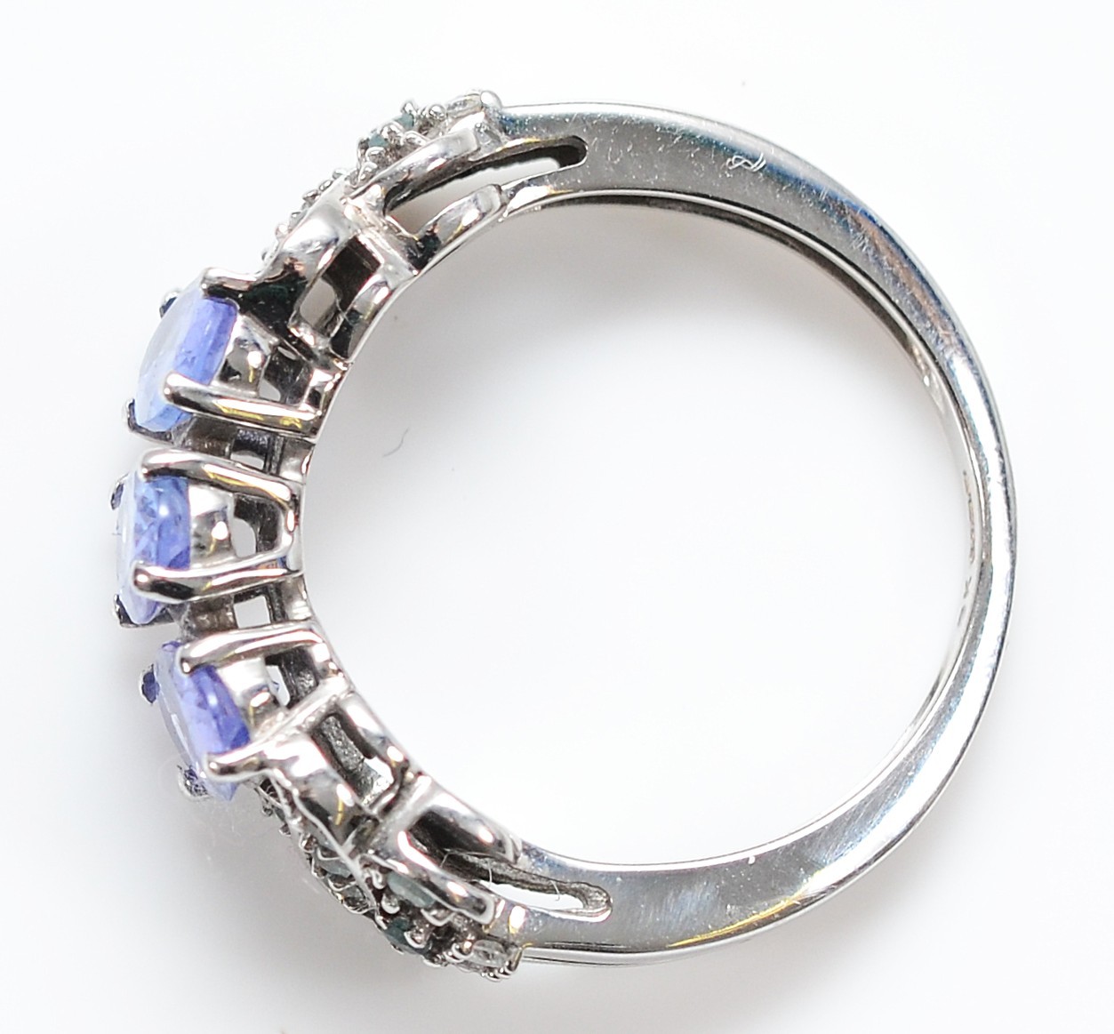 A 9ct white gold tanzanite and green chrysoberyl dress ring, J, 2.7g