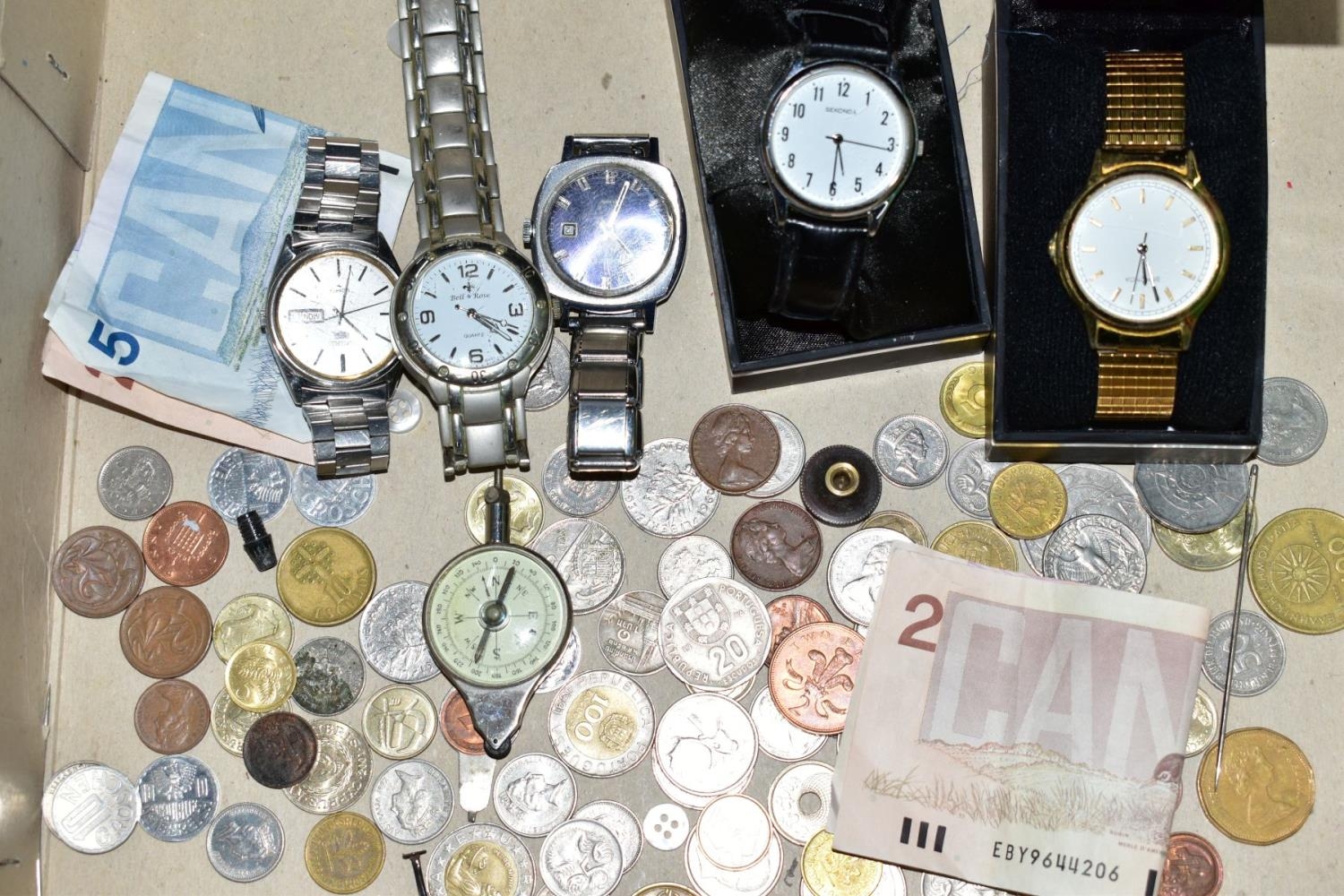 A SELECTION OF COINS AND WATCHES, the watches include three Sekonda, two with maker's boxes, one Seiko and one Bell & Rose wristwatch, three Canadian cash notes, a compass and a selection of coins of various currencies