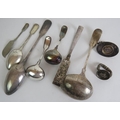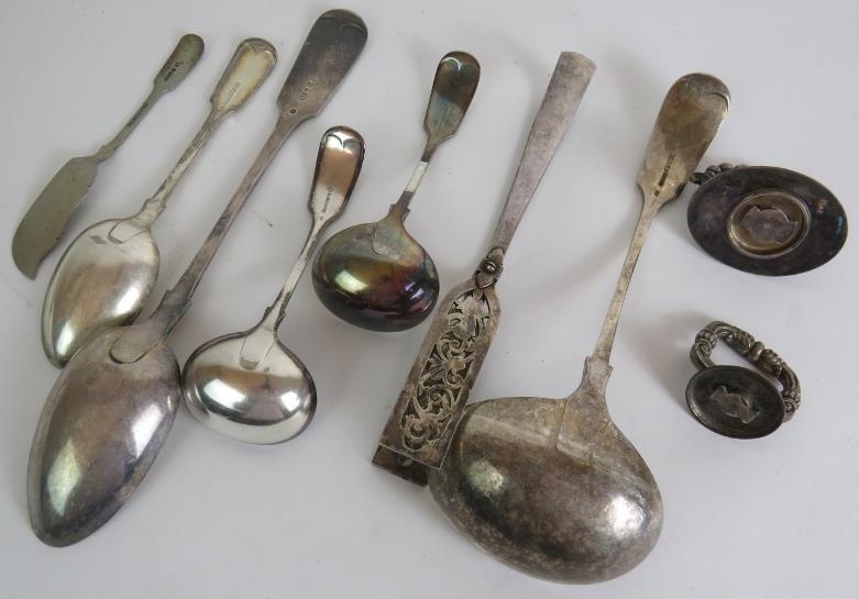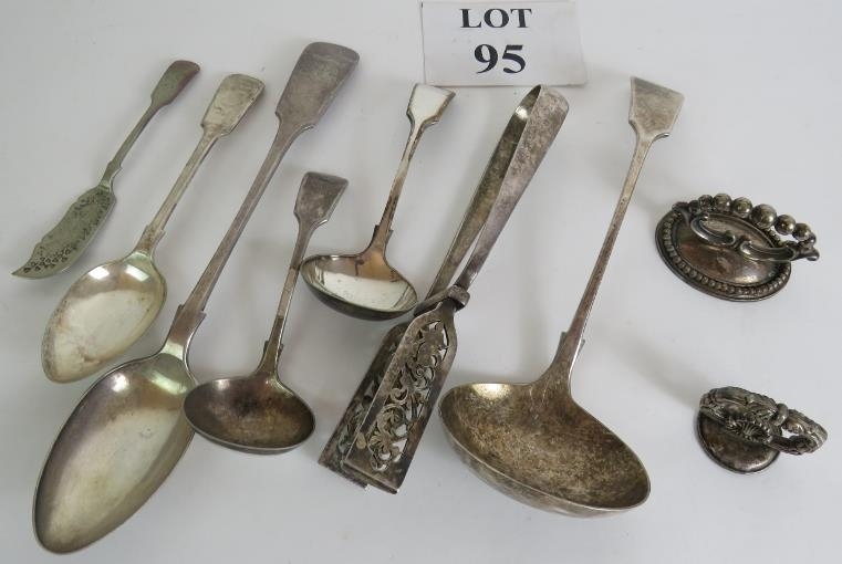 A quantity of good quality antique silver plated flat ware including a pair of asparagus tongs and a large basting spoon. (9).