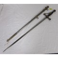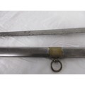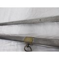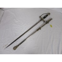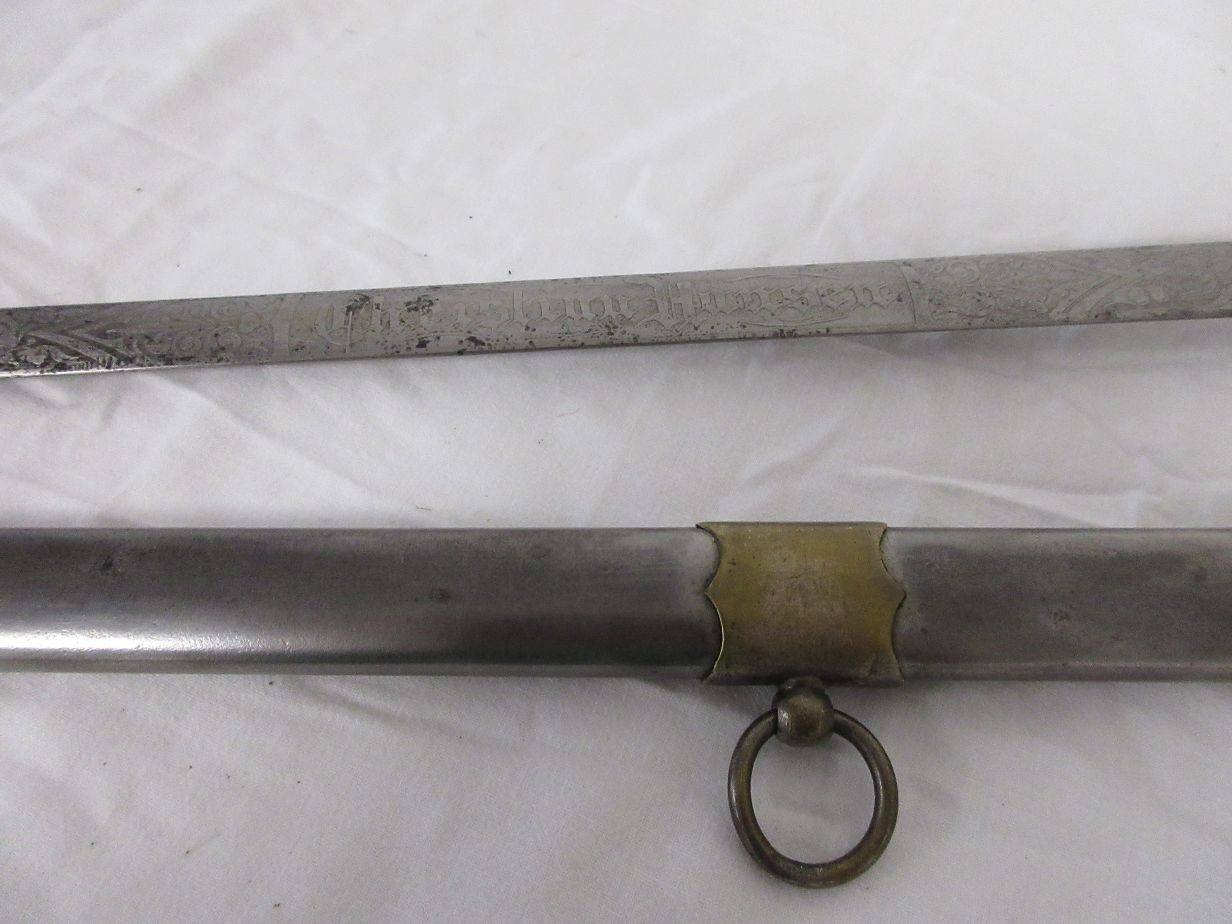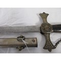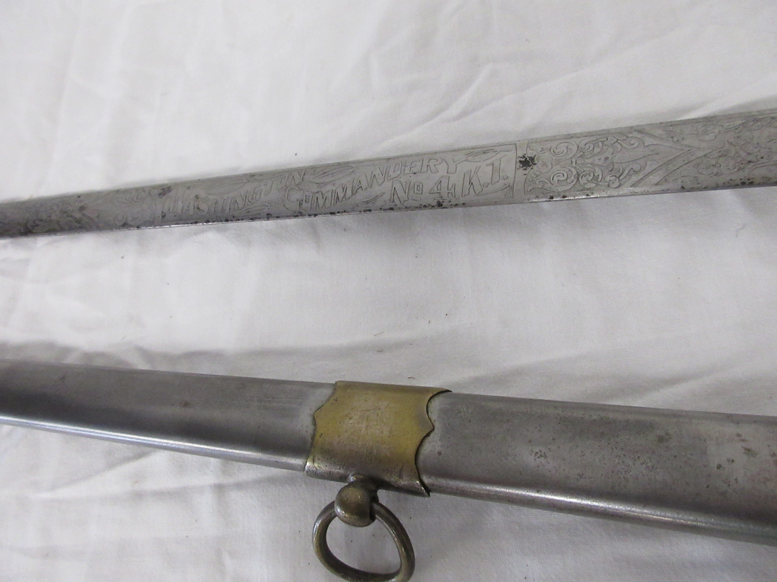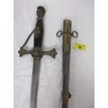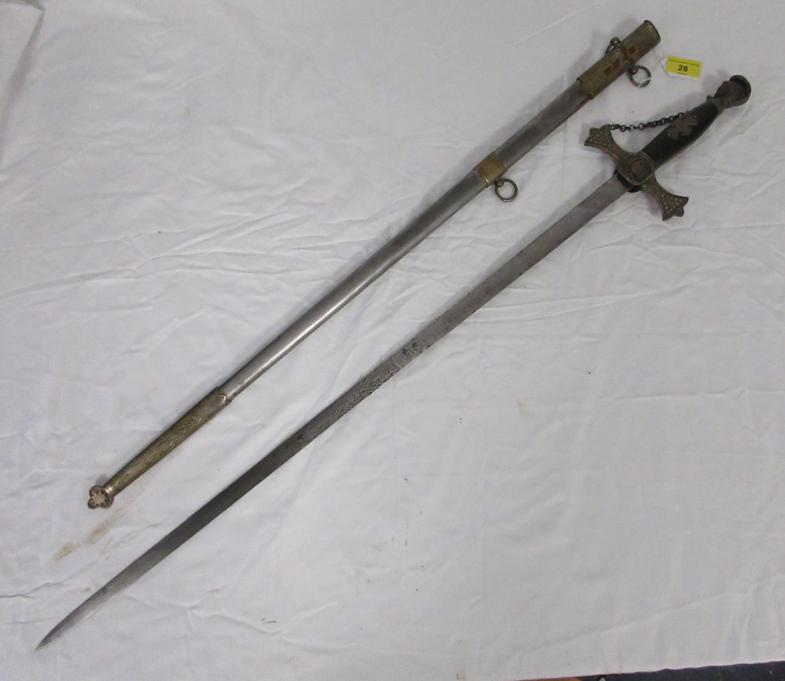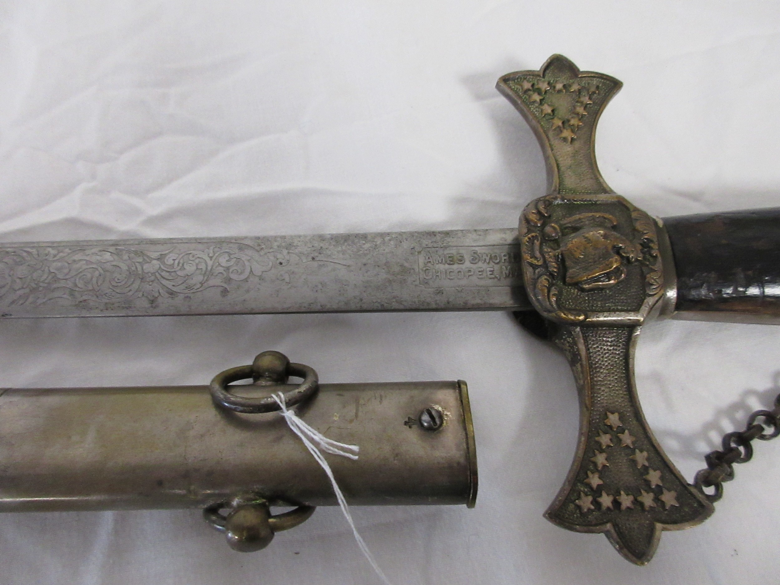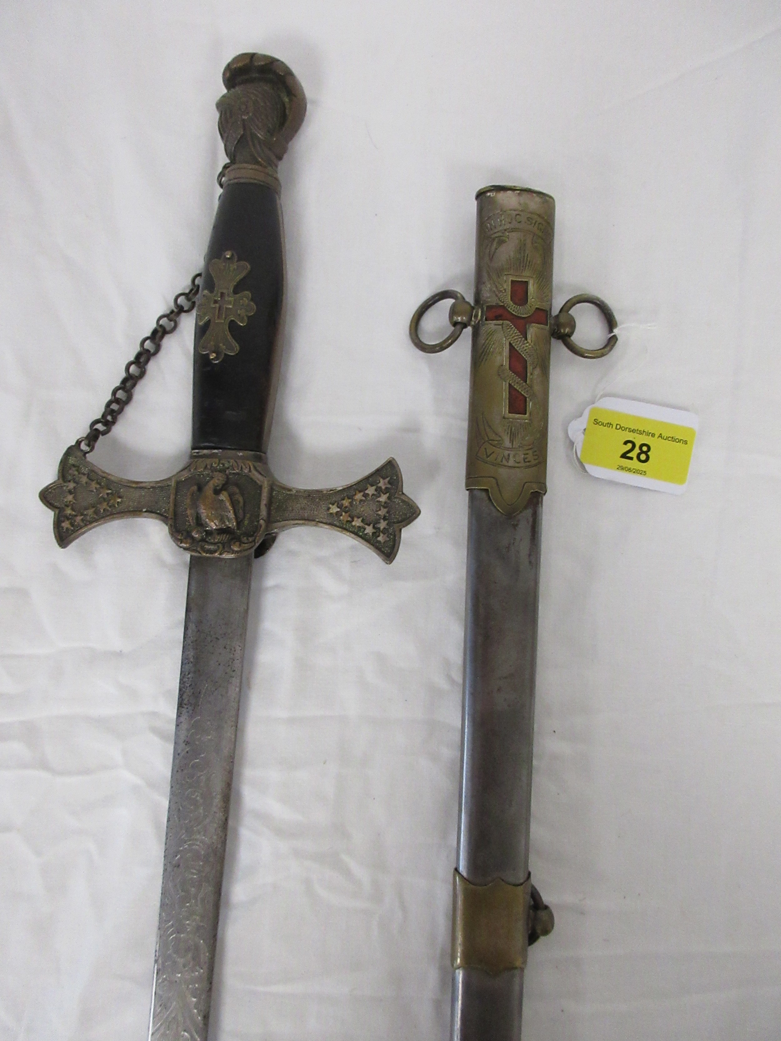 A 19th century American Masonic Knights Templar ceremonial fraternity sword by Ames in its metal scabbard. Having a knights helmet pommel, a wooden handle and metal crosspiece connected by a chain. The scabbard having a red enamel cross with IN HOC SIGNO & VINCES. The double edged blade etched with the owners name Christian Hansen. and adorned with Masonic symbols including WASHINGTON COMMANDERY No.4 K.T.and the makers name: Ames Sword Co. Chicopee, Mass.. Blade length 71cms.