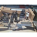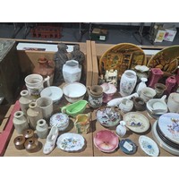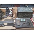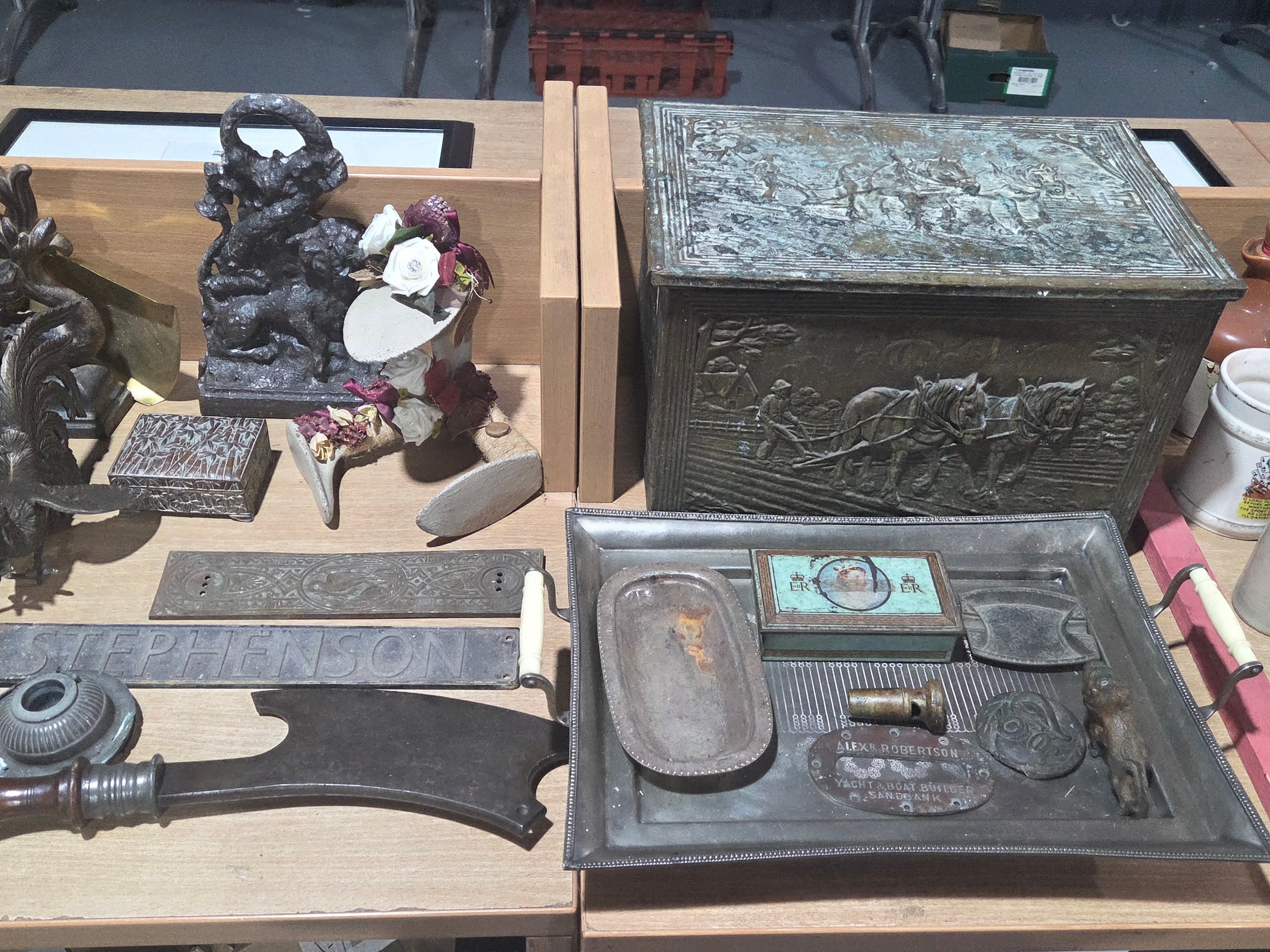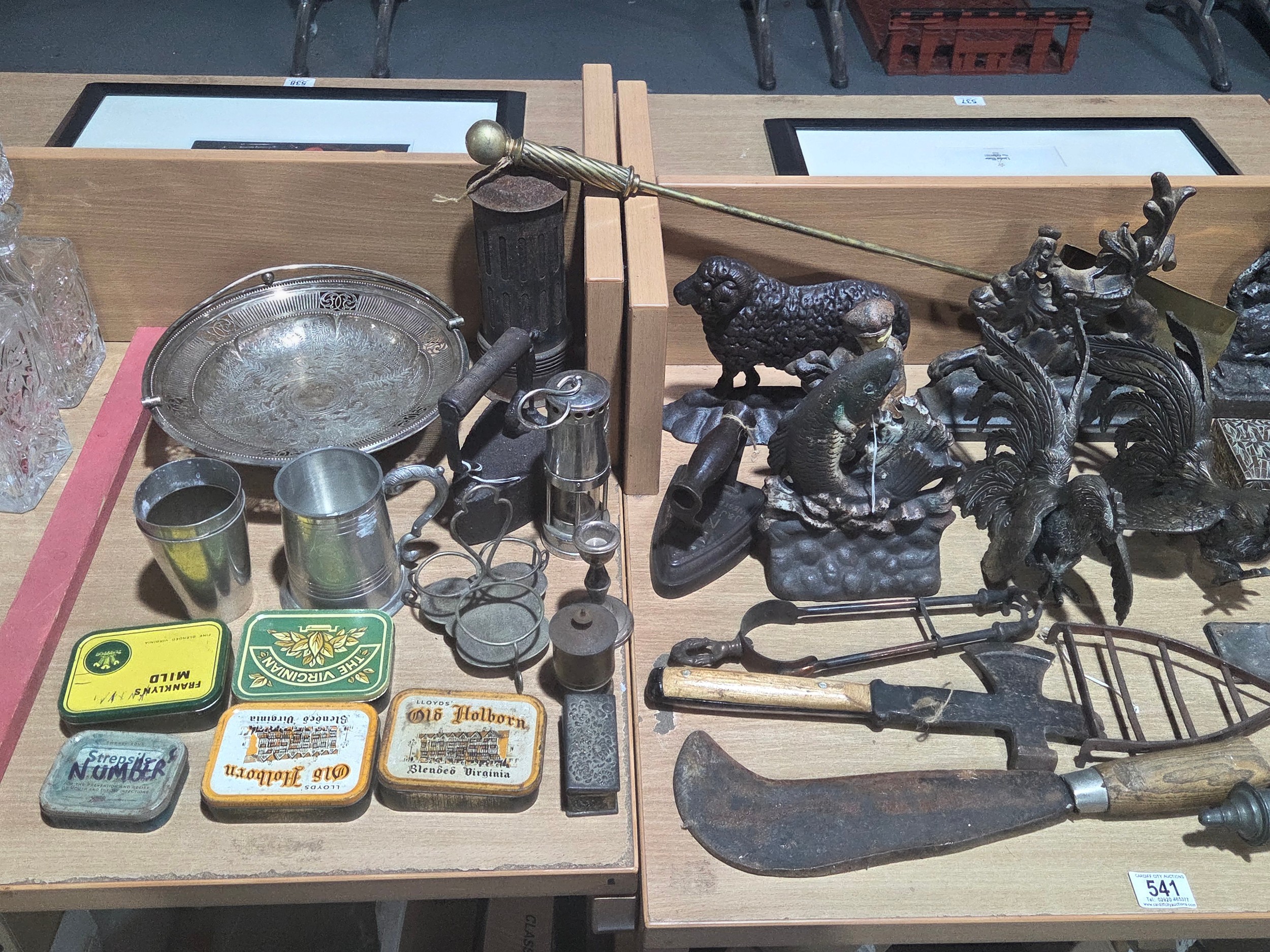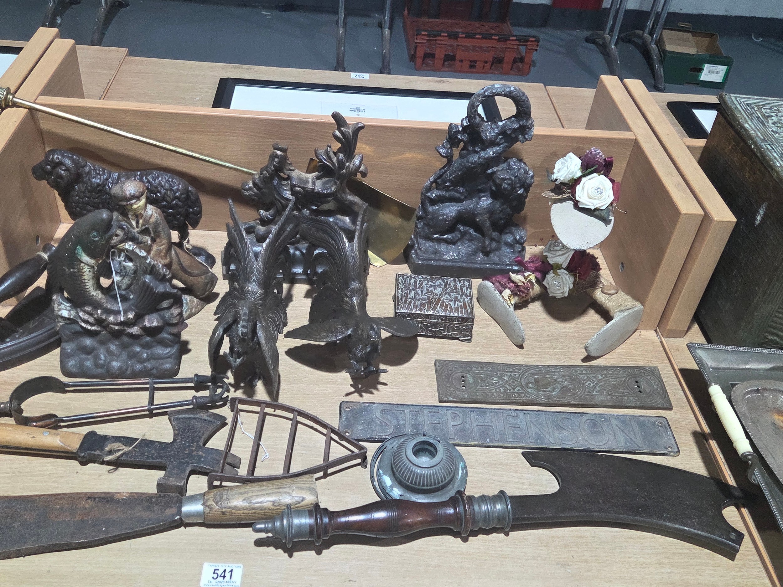 A brass coal box, cast iron doorstops, brass fighting cockerels and other metalware