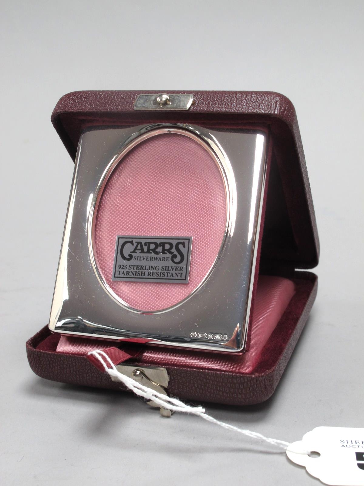 A Modern Hallmarked Silver Mounted Travelling Photograph Frame, RC (Carrs), Sheffield 2000, the rectangular frame with oval aperture within plush lined folding case, boxed.
