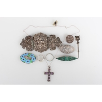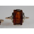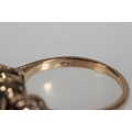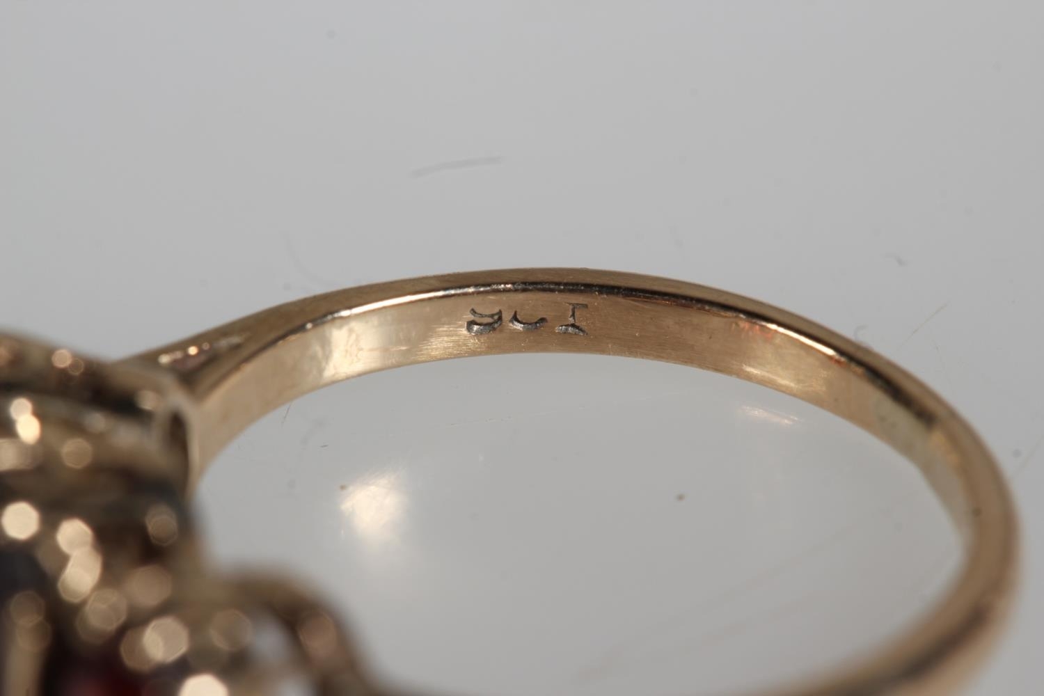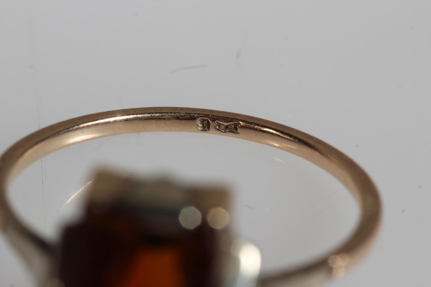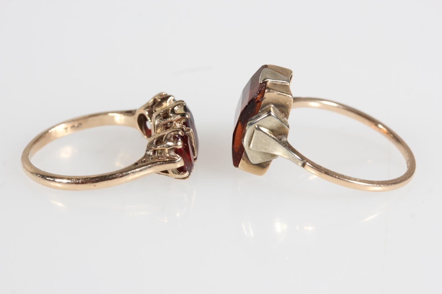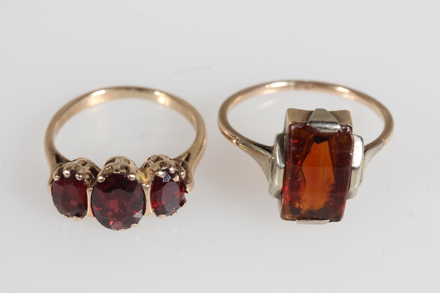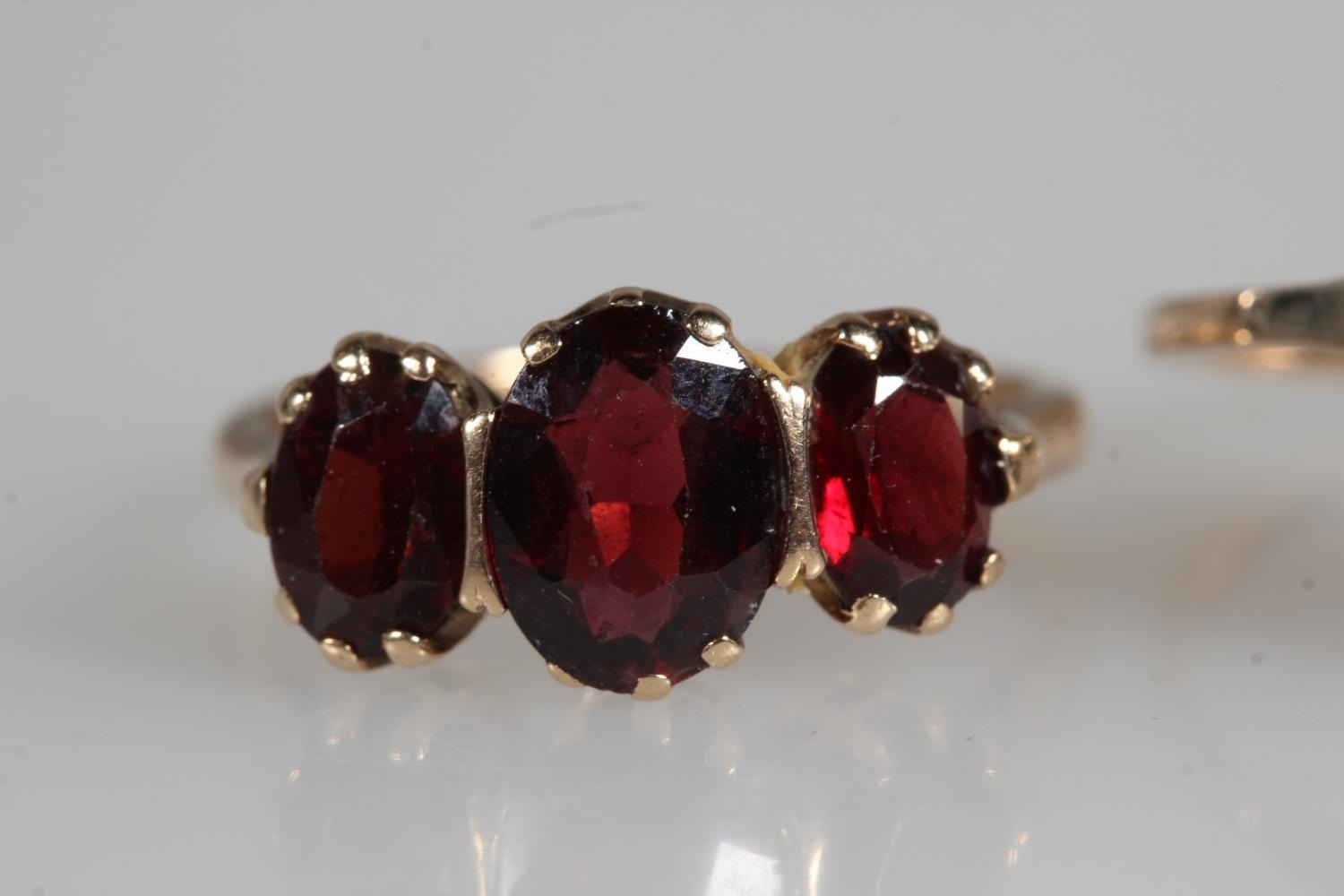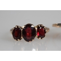 9ct yellow gold garnet three stone set ring and another, 4.7g.