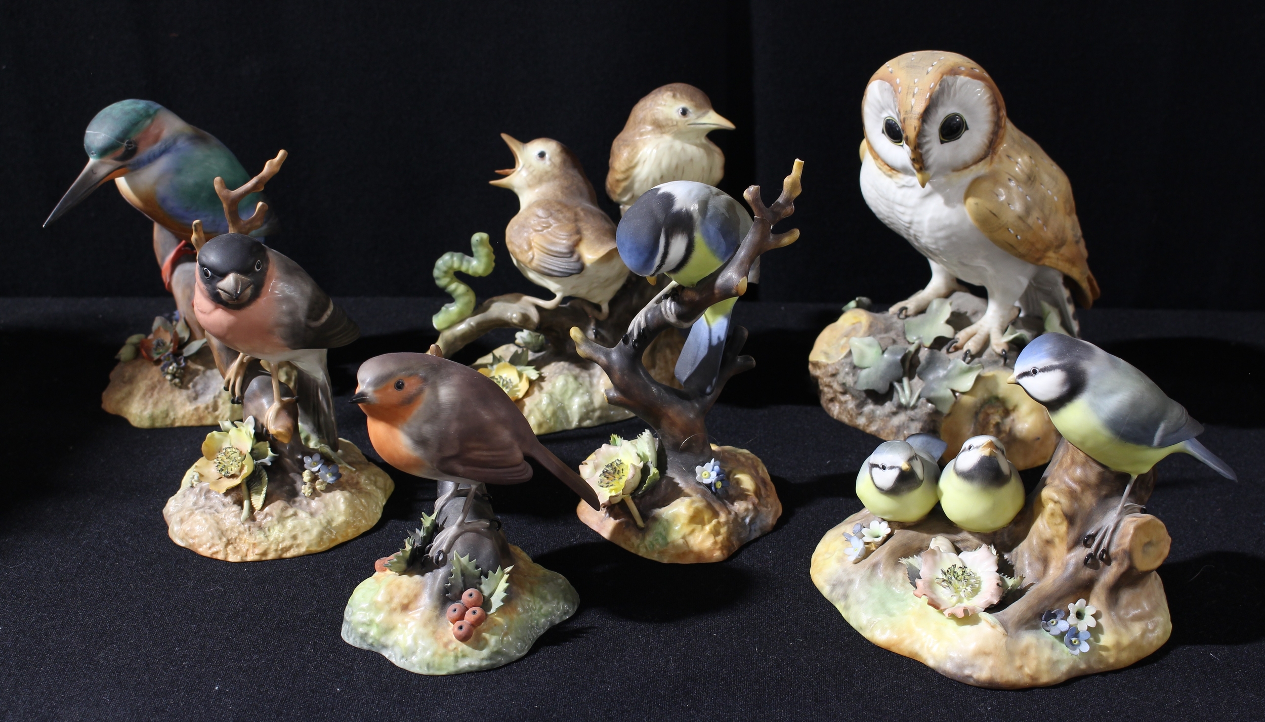 Royal Crown Derby Bird Models - Barn Owl, Thrush Chicks, Blue Tit and Chicks, Robin, Bull Finch, Kingfisher and Blue Tit (7)