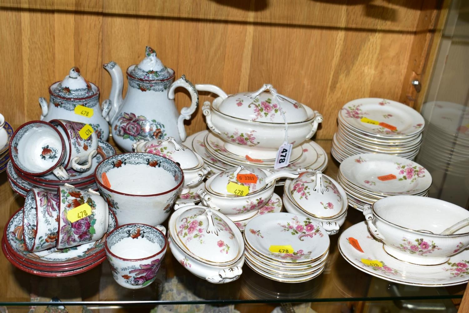 A VICTORIAN PART DOLLS DINNER SERVICE, comprising tureens, meat platters, various size plates, florally decorated (E.M.W.?) (over 30 pieces), together with another Victorian part teaset (chipped and rubbed) (15)