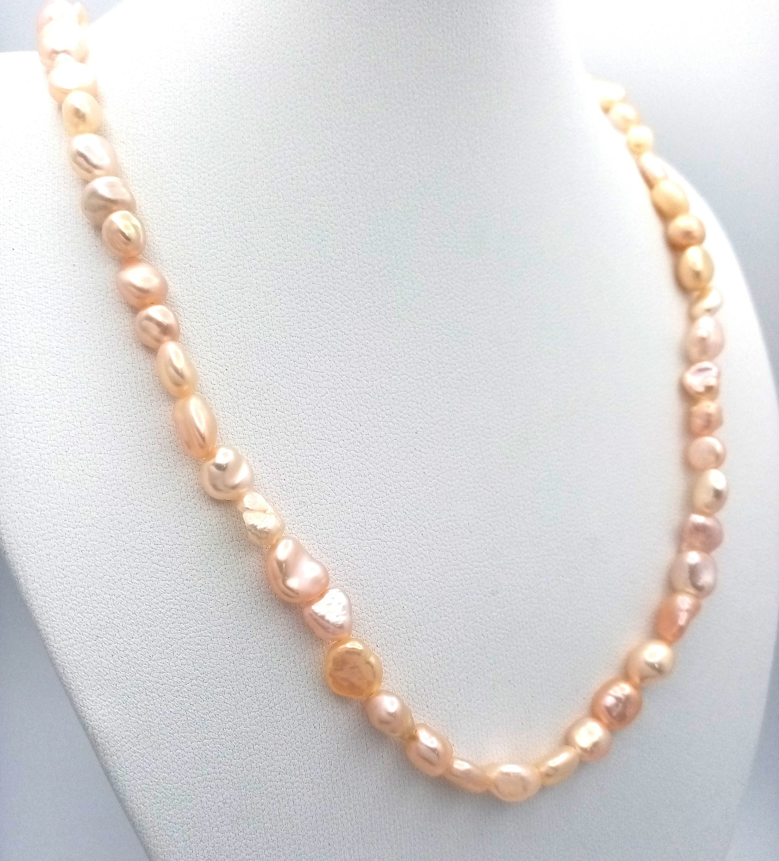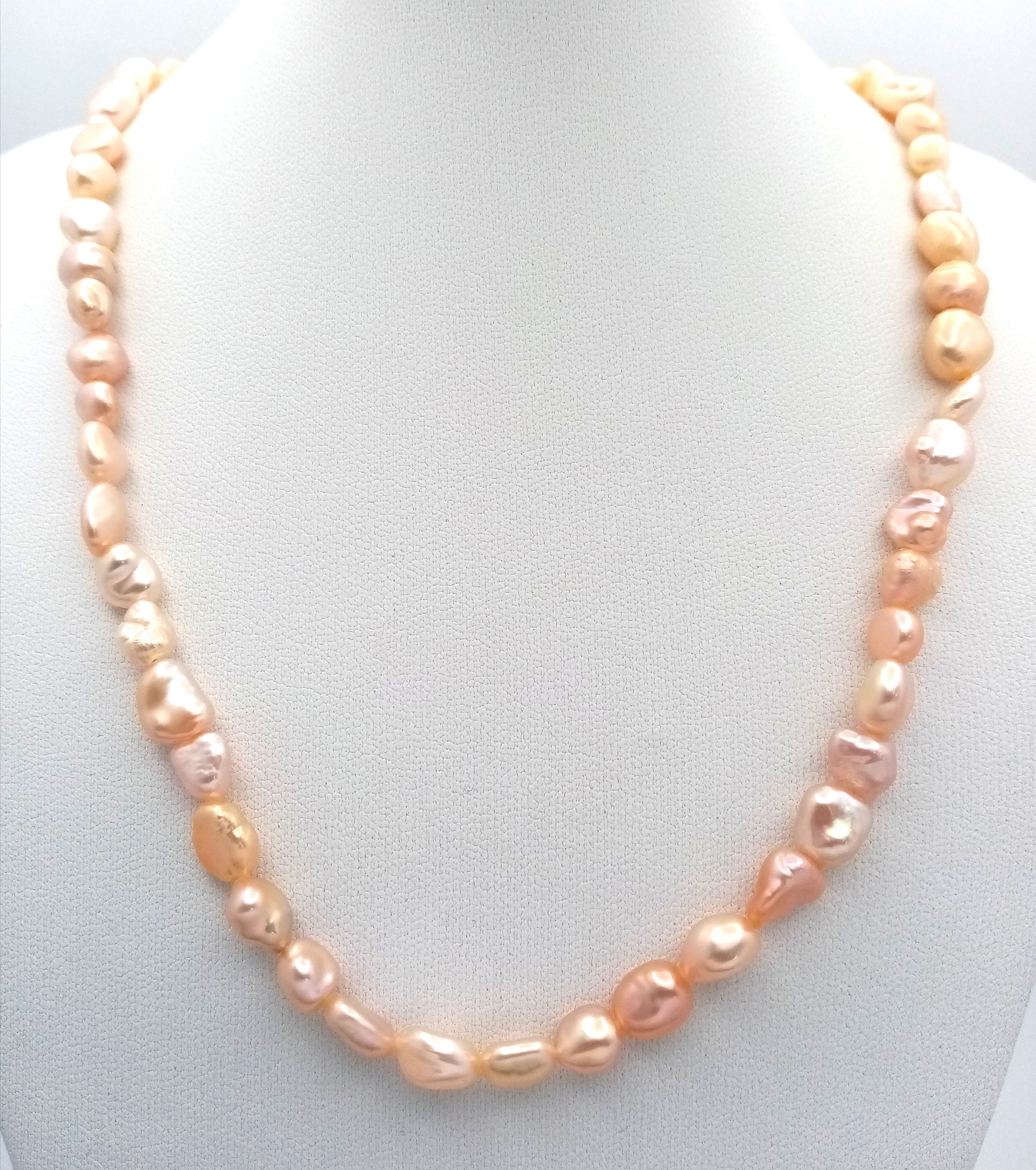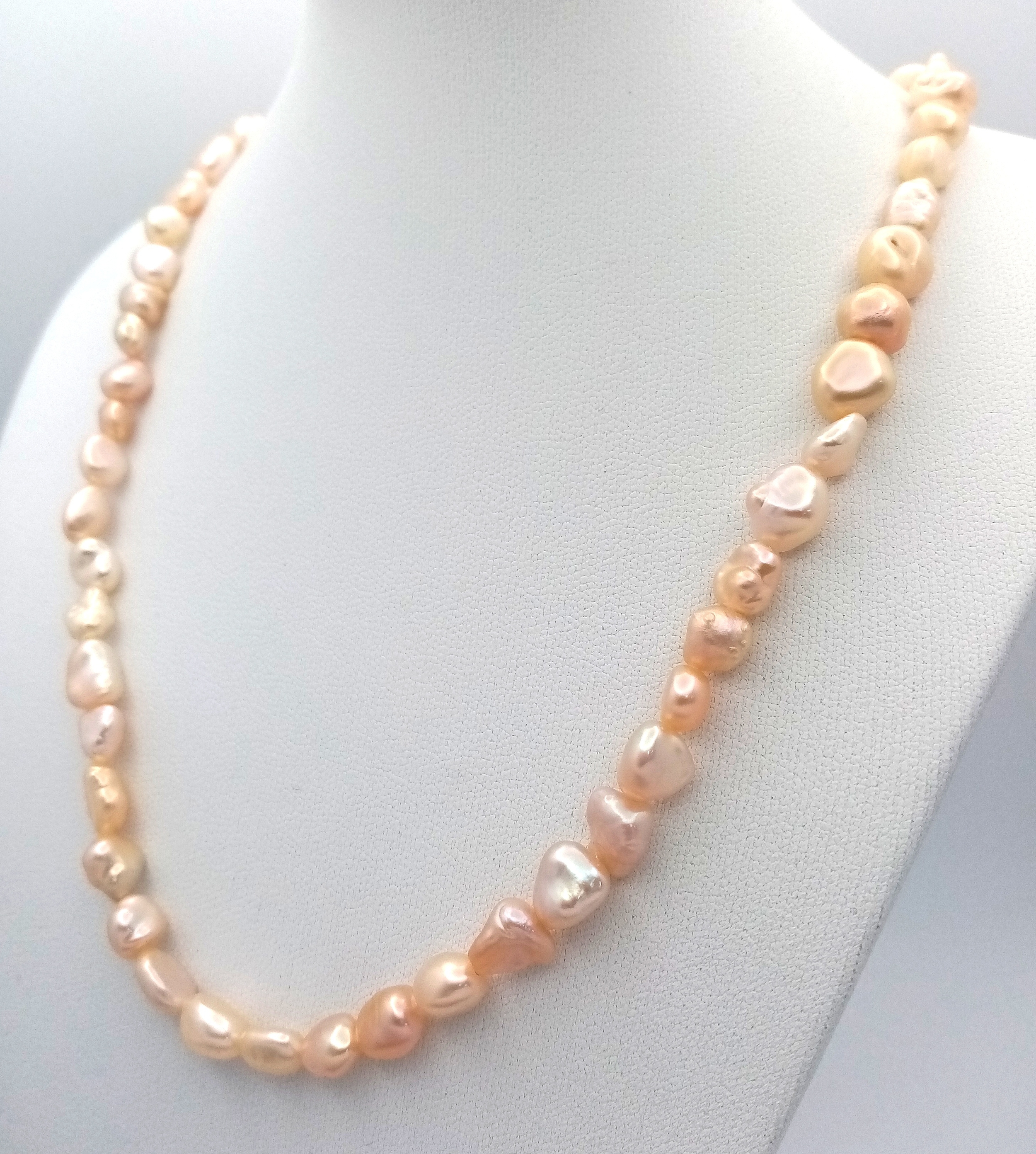 A vintage baroque pearl necklace featuring organically shaped pearls with attractive lustre in pale pink and cream hues.