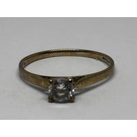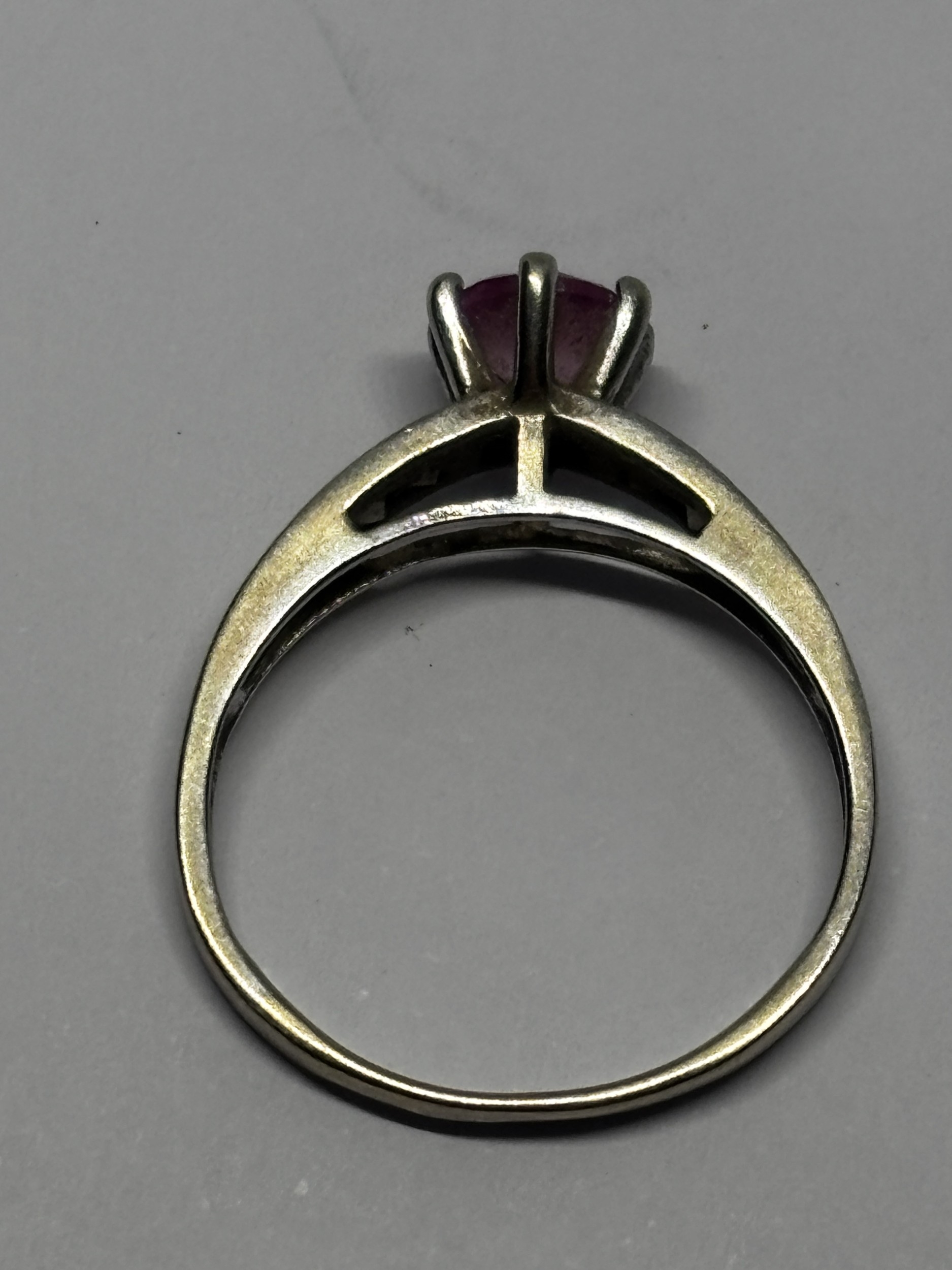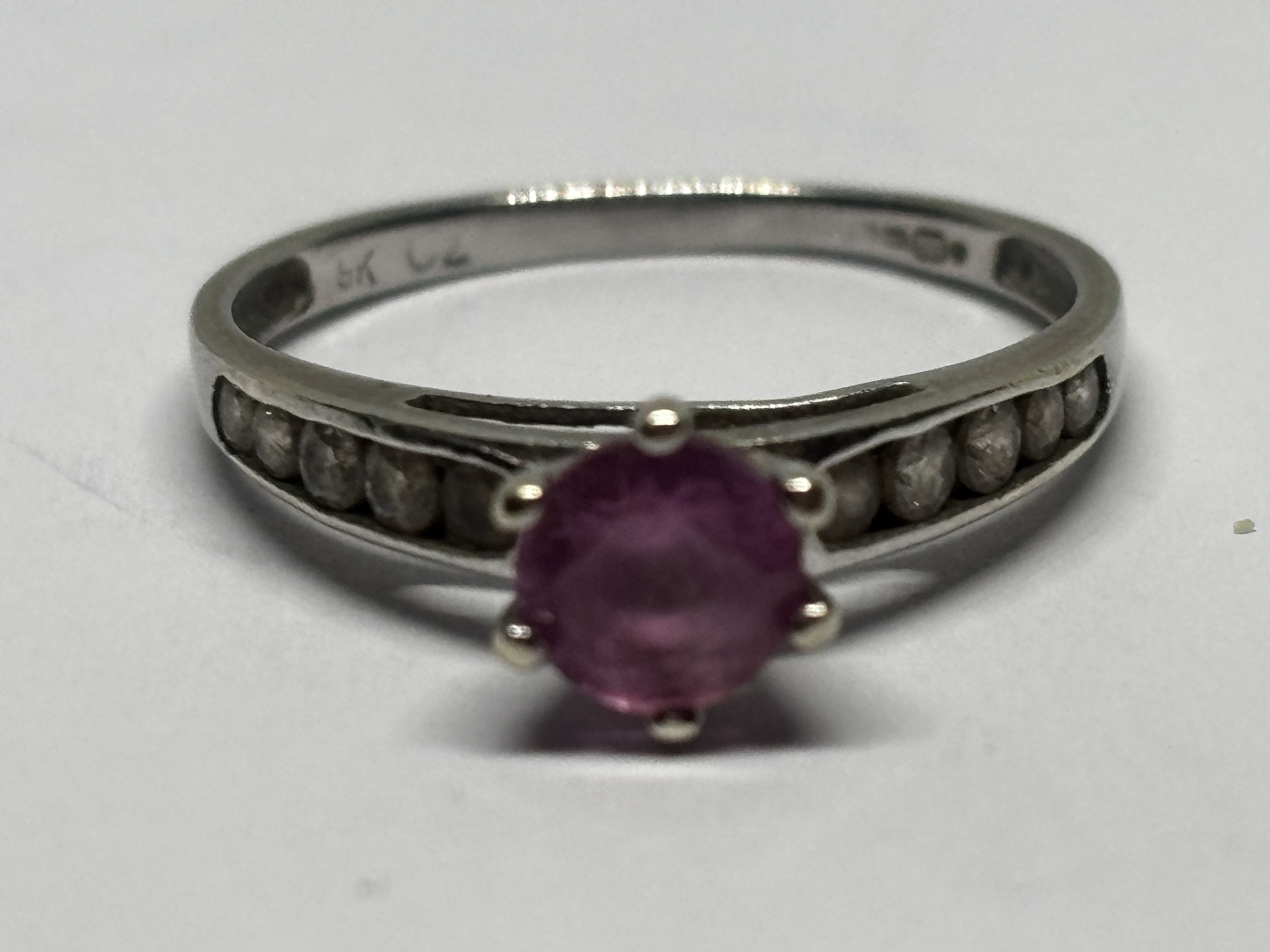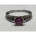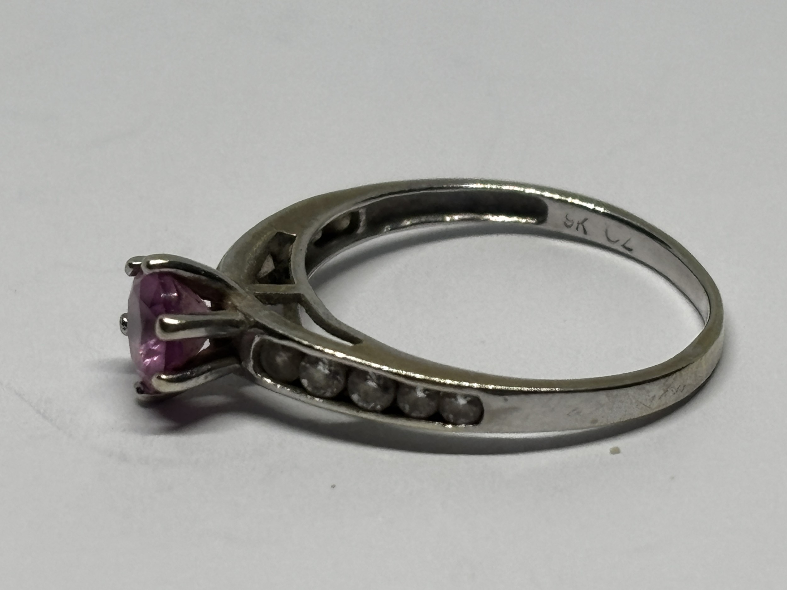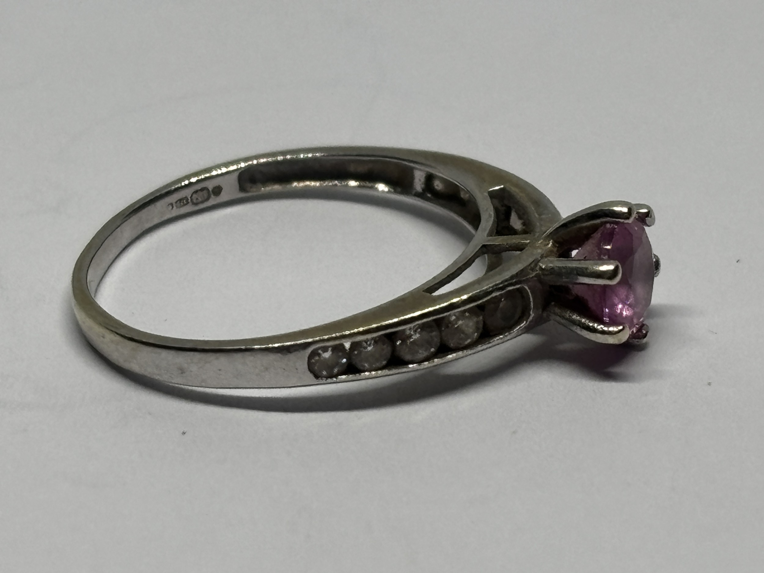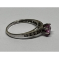 A MARKED 9 CARAT WHITE GOLD RING WITH PINK STONE AND CUBIC ZIRCONIAS TO THE SHOULDERS SIZE I/J GROSS WEIGHT 1.31 GRAMS
