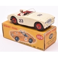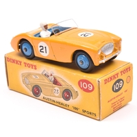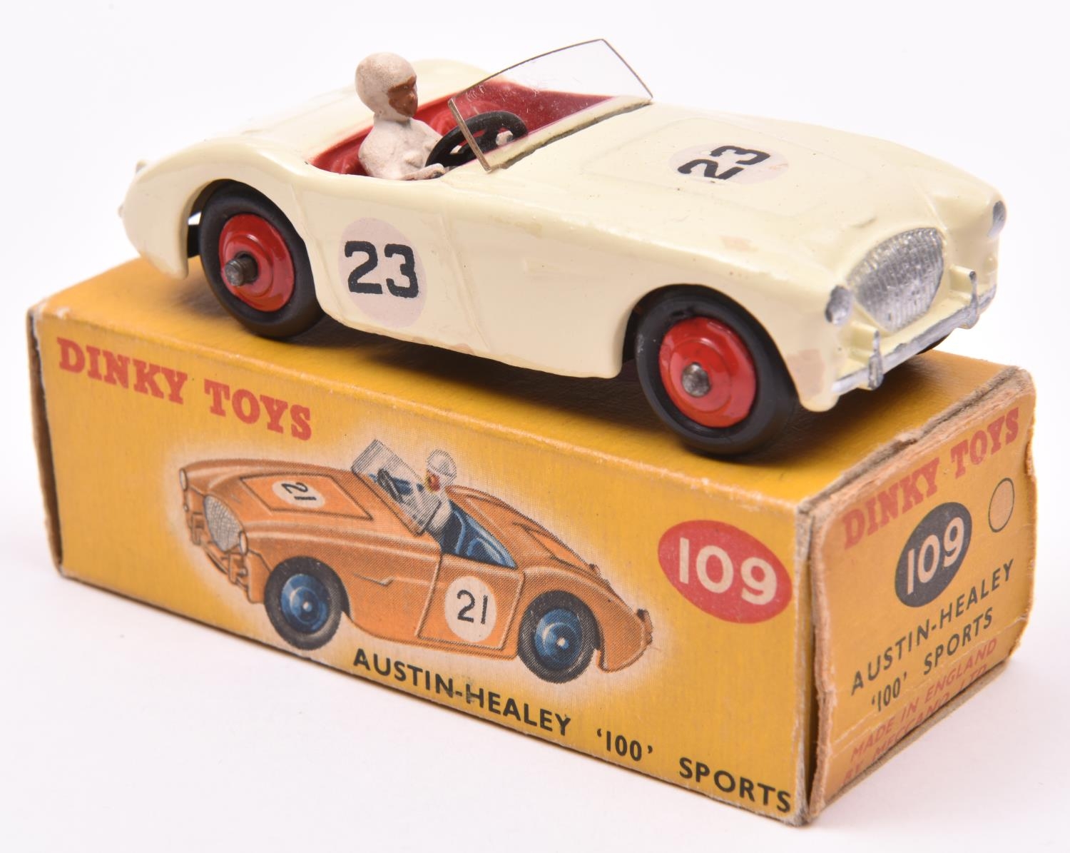 Dinky Toys Austin-Healey '100' Sports (109). An example in cream with red interior and wheels. RN23, complete with driver and black tyres. Boxed, some wear/damage, one outer end flap has been reattached. Vehicle VGC-Mint £70-100