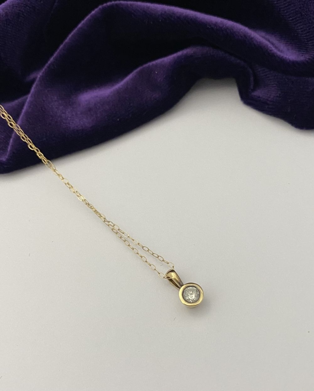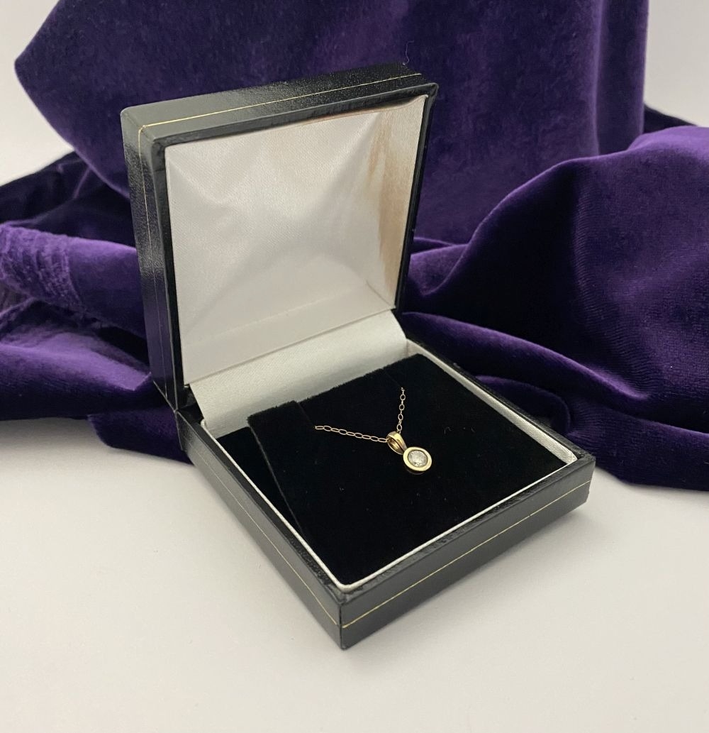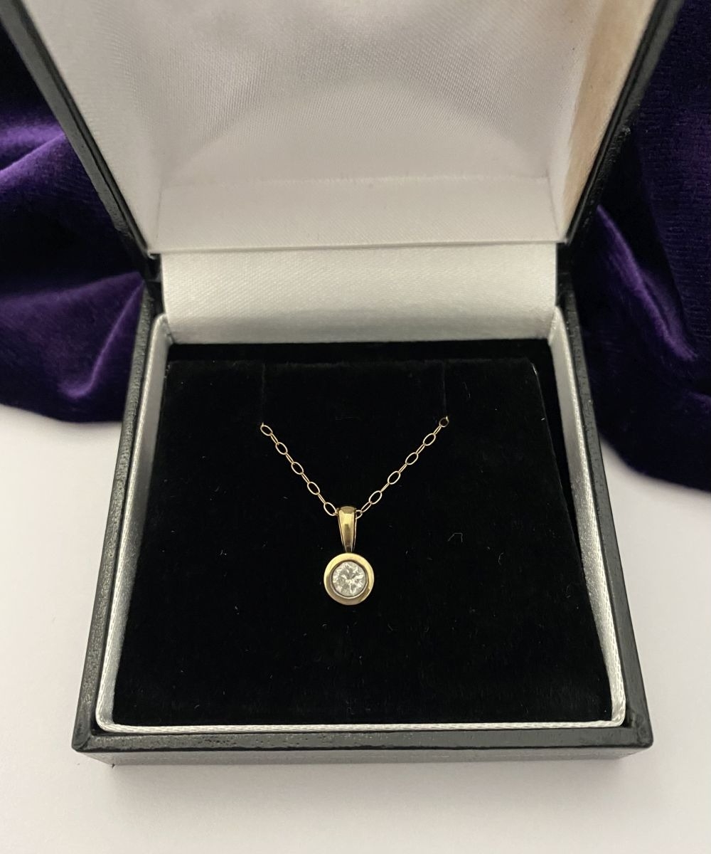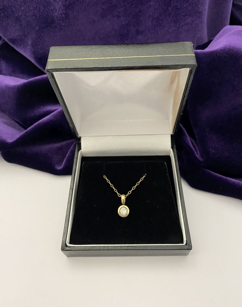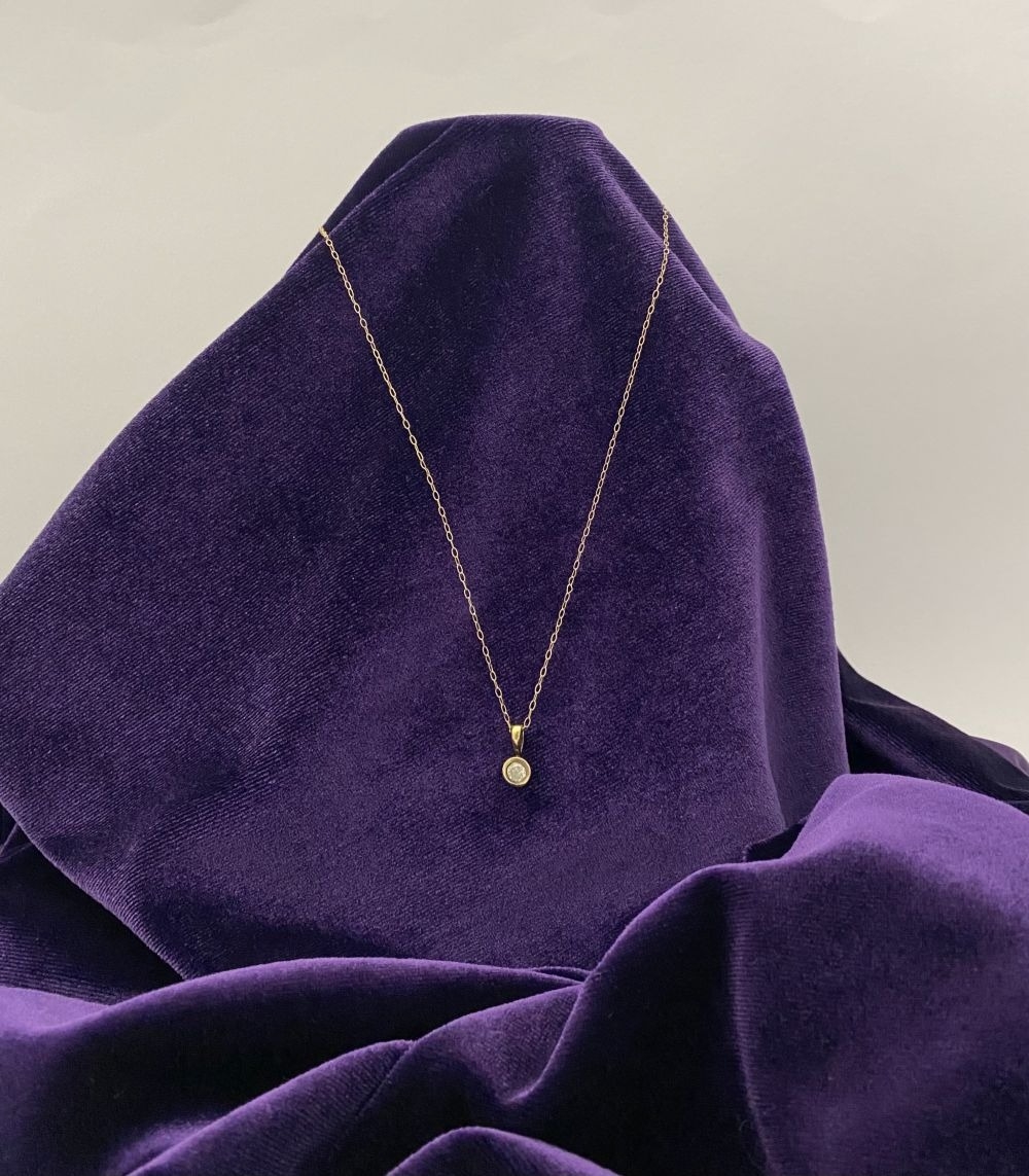 AN ELEGANT 9CT YELLOW GOLD DIAMOND SOLITAIRE PENDANT NECKLACE, featuring beautiful round cut diamond in bezel setting, diamond weight: .35ct, colour: K. Diamond pendant on delicate chain link necklace, hallmarked 9k to clasp. Dimensions: 40cm long approx.
