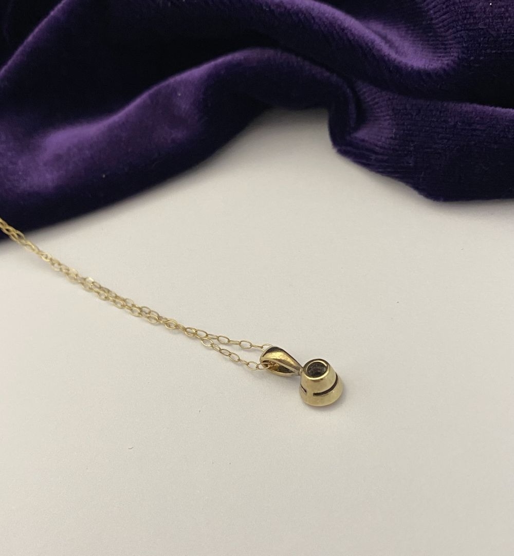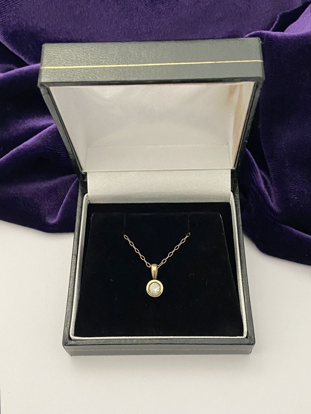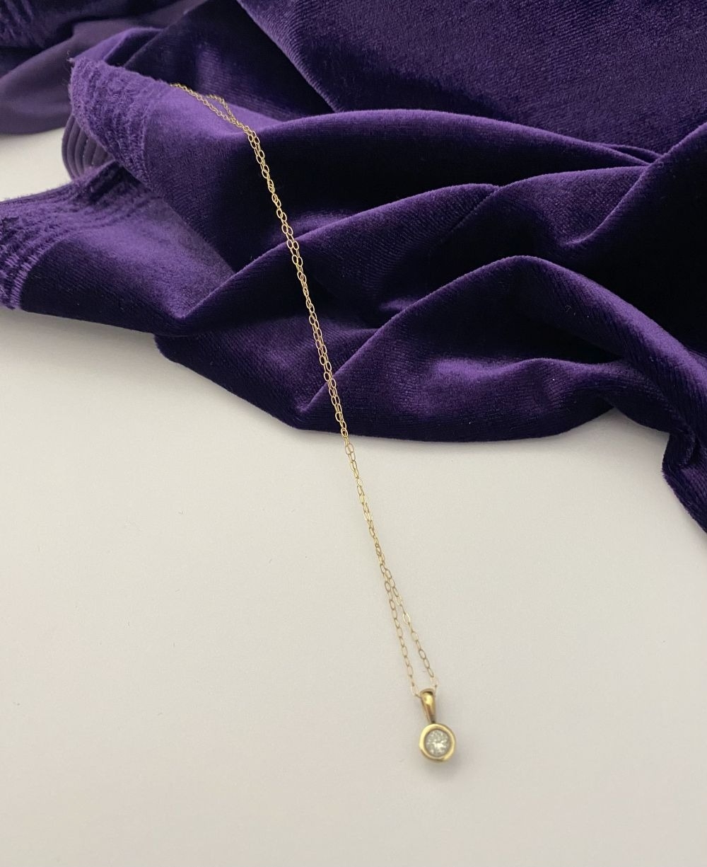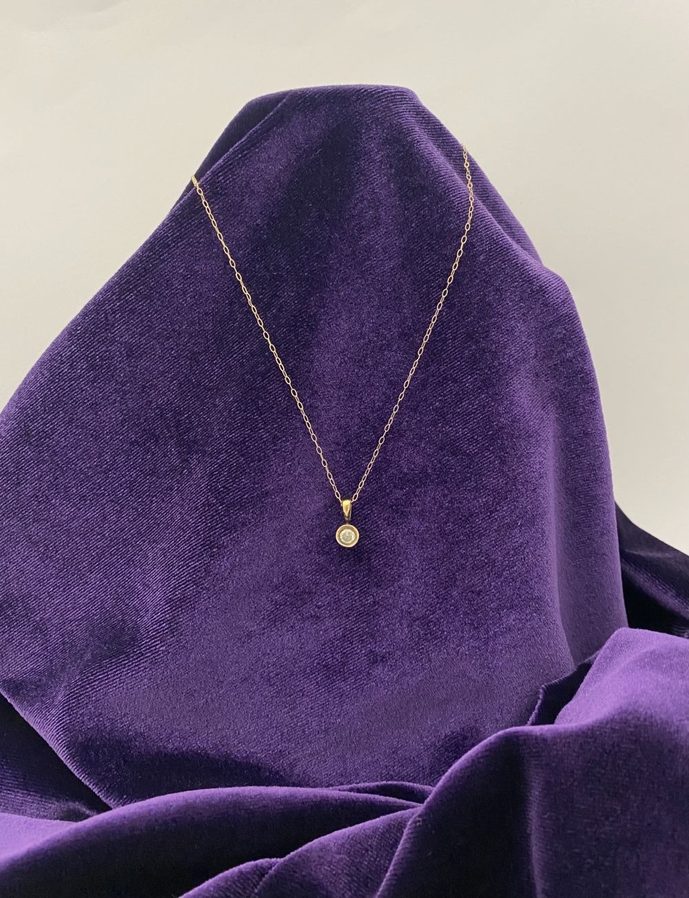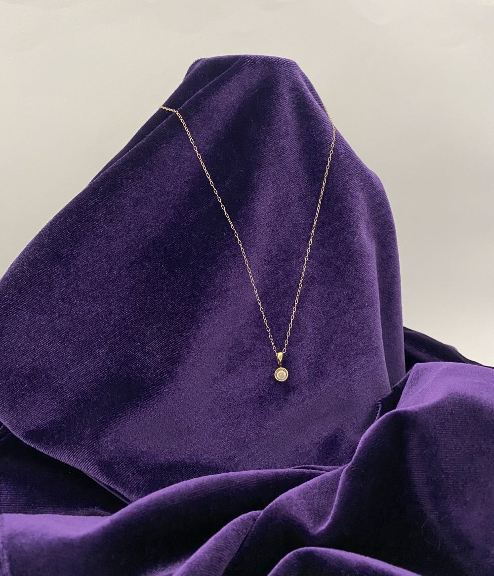 AN ELEGANT 9CT YELLOW GOLD DIAMOND SOLITAIRE PENDANT NECKLACE, featuring beautiful round cut diamond in bezel setting, diamond weight: .35ct, colour: K. Diamond pendant on delicate chain link necklace, hallmarked 9k to clasp. Dimensions: 40cm long approx.