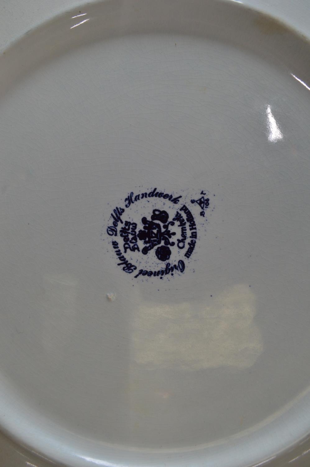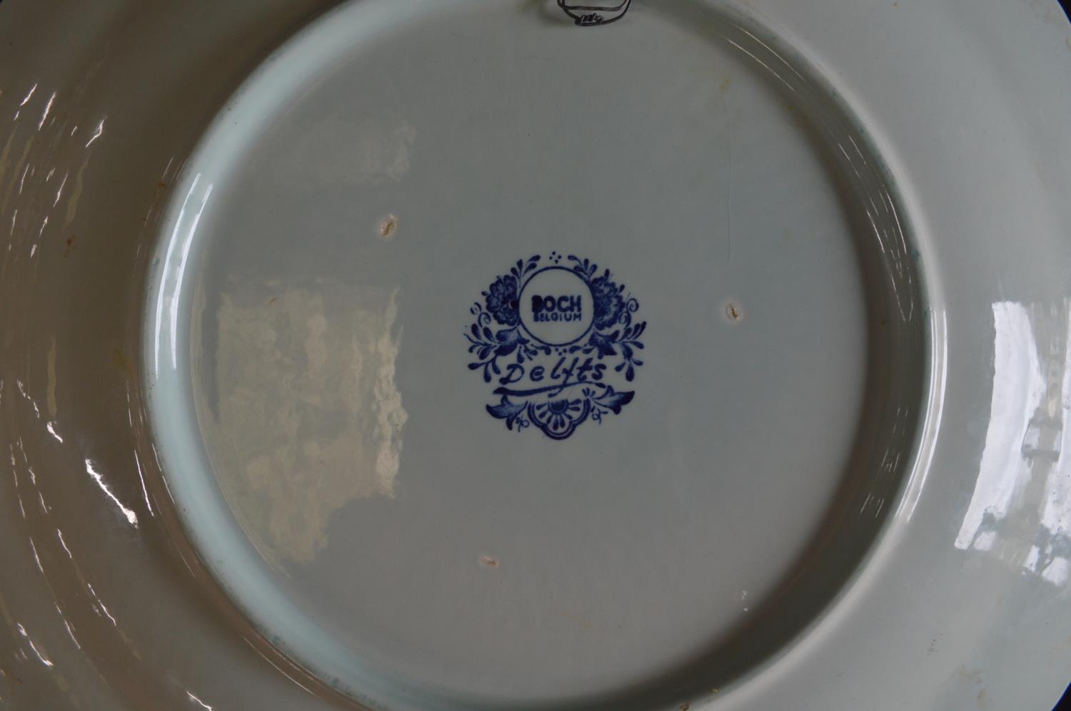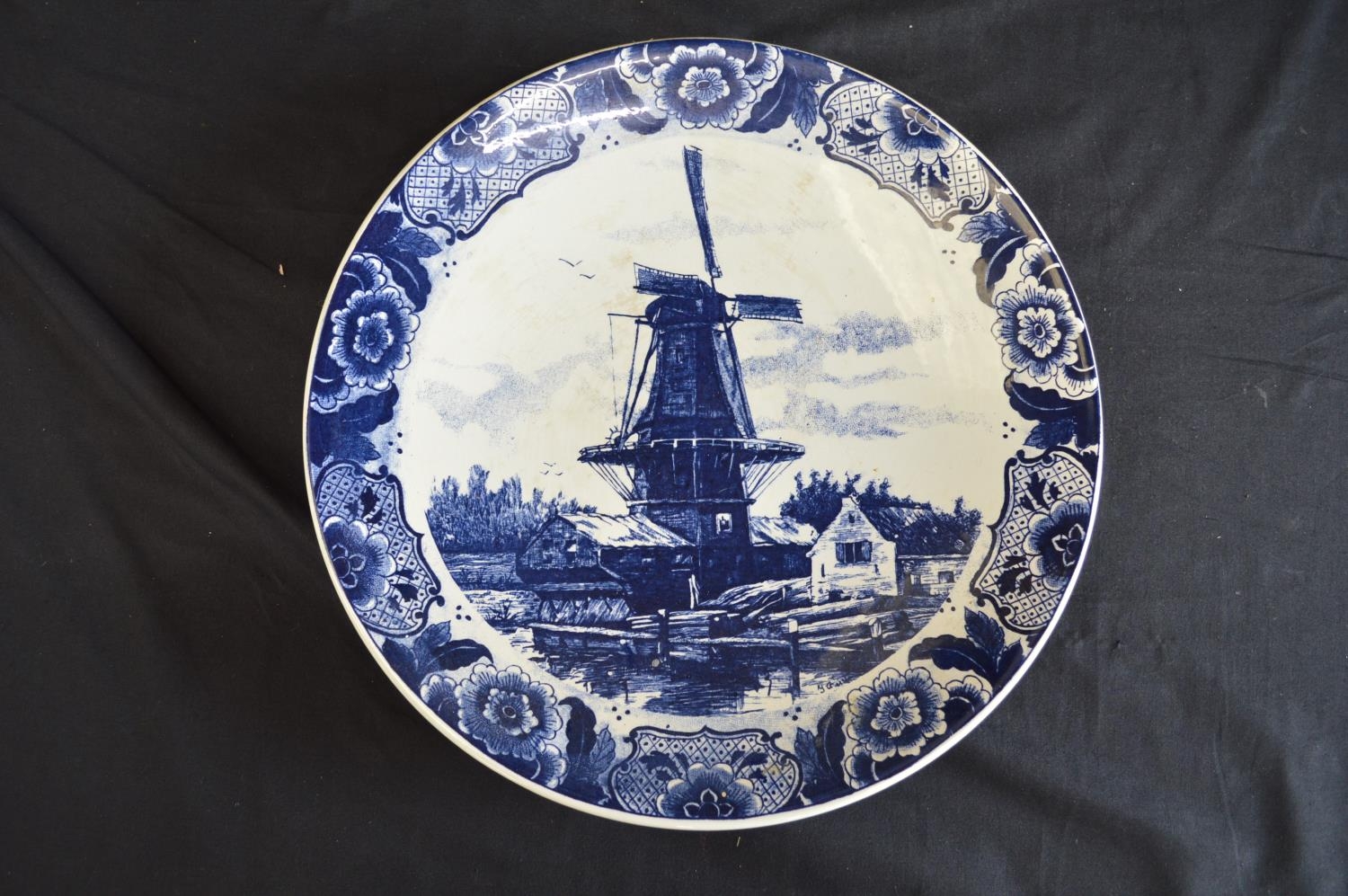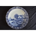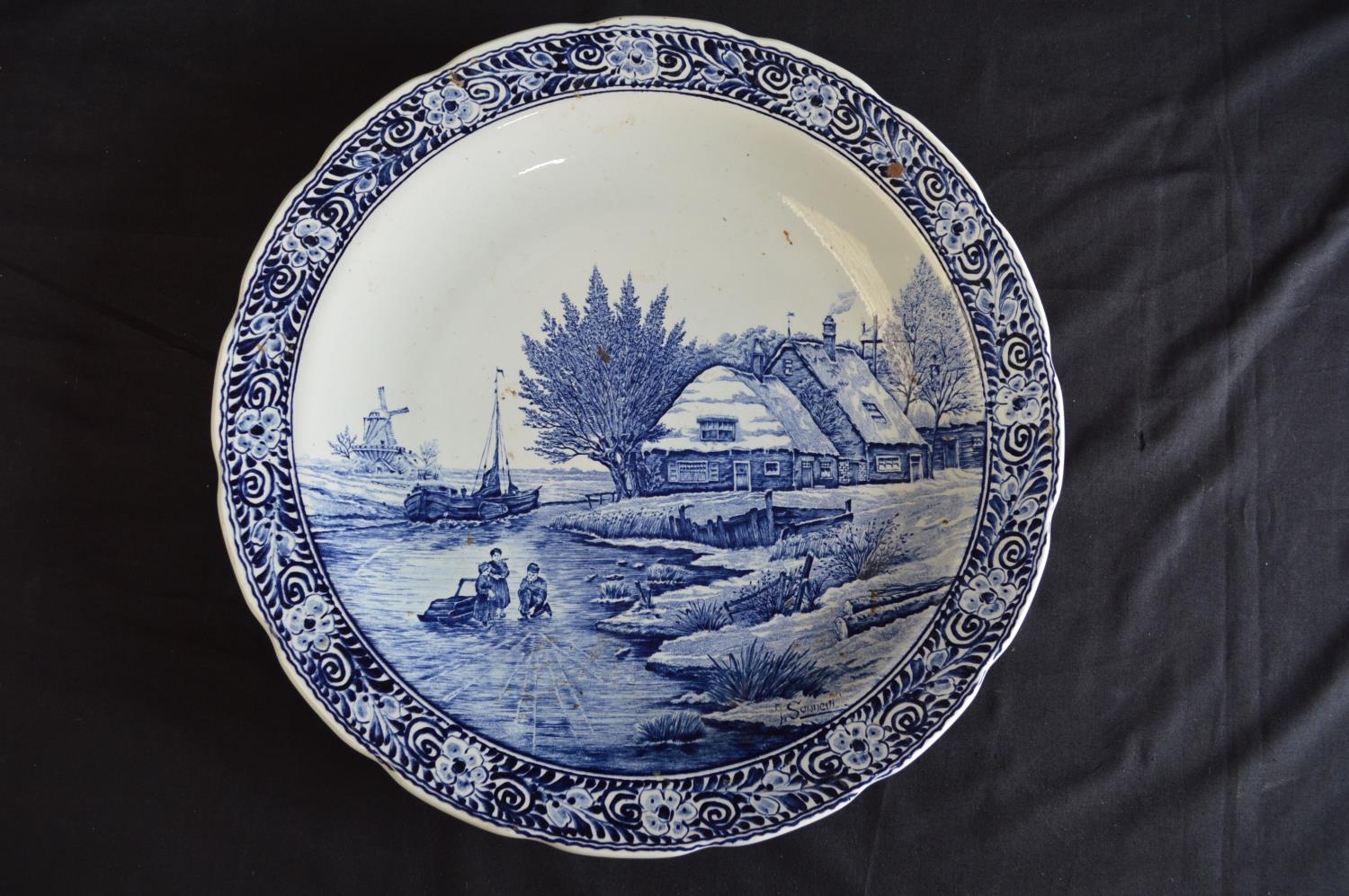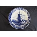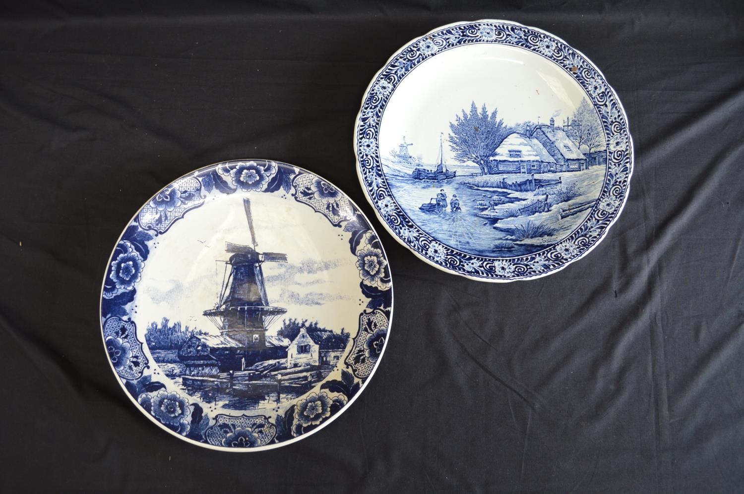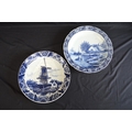 Two Delft blue and white wall hanging chargers decorated with scenes of children playing on a frozen river and windmill - 39.5cm and 39cm dia