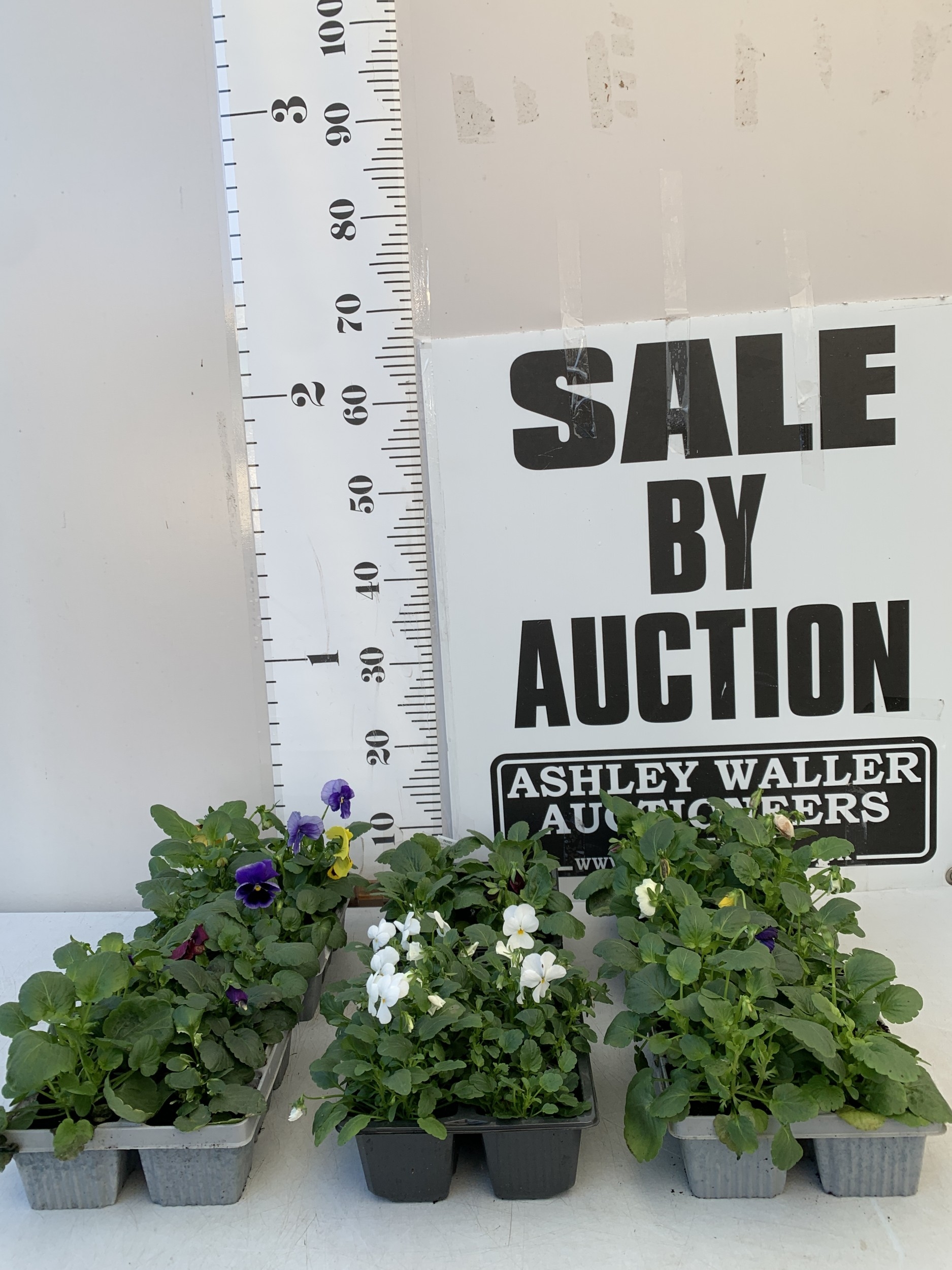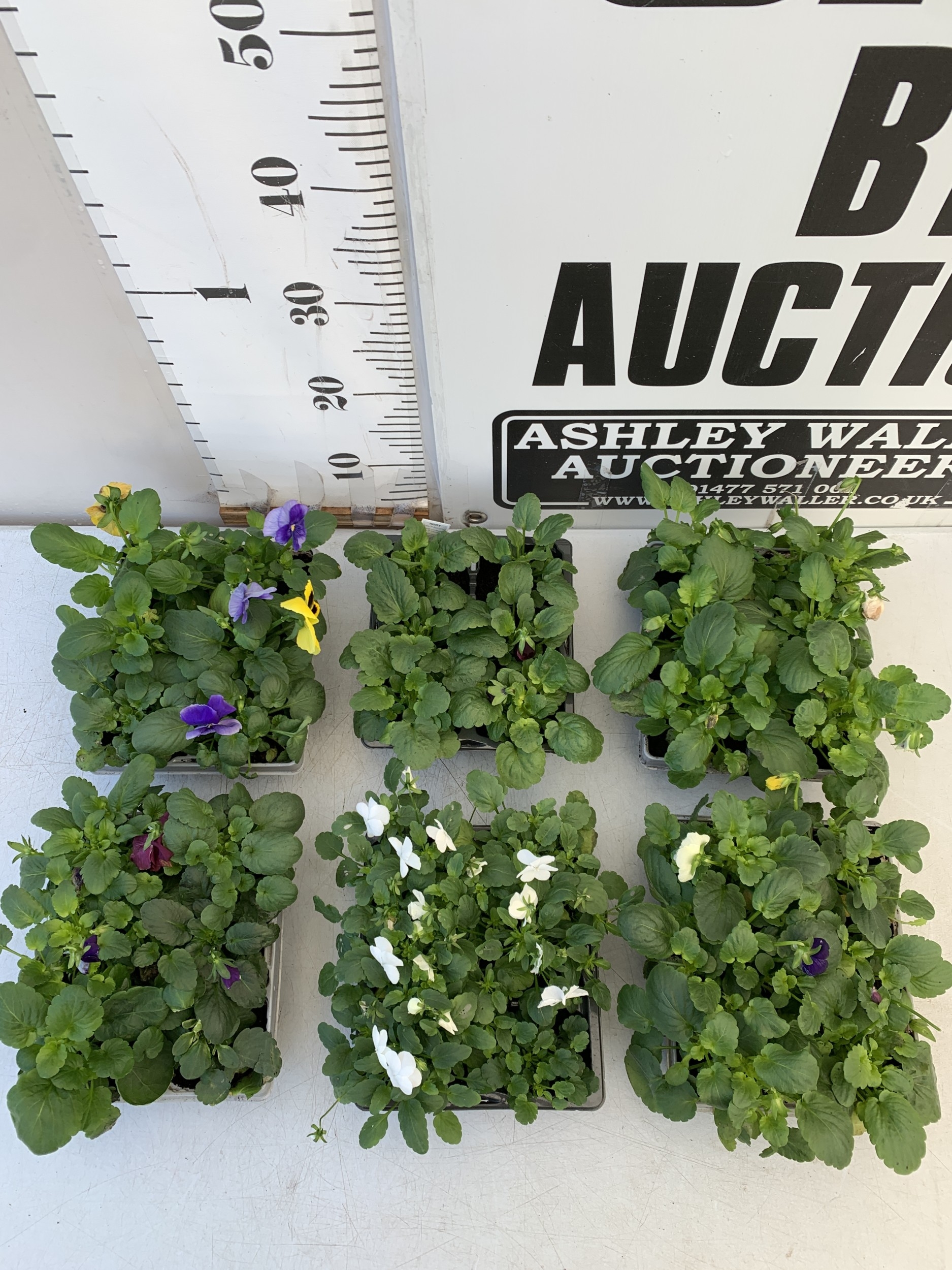 THIRTY-SIX MIXED COLOUR PANSIES ON SIX TRAYS. TO BE SOLD FOR...