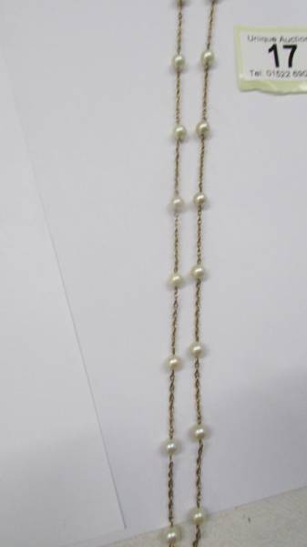 An opera length gold necklace with pearls.
