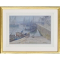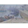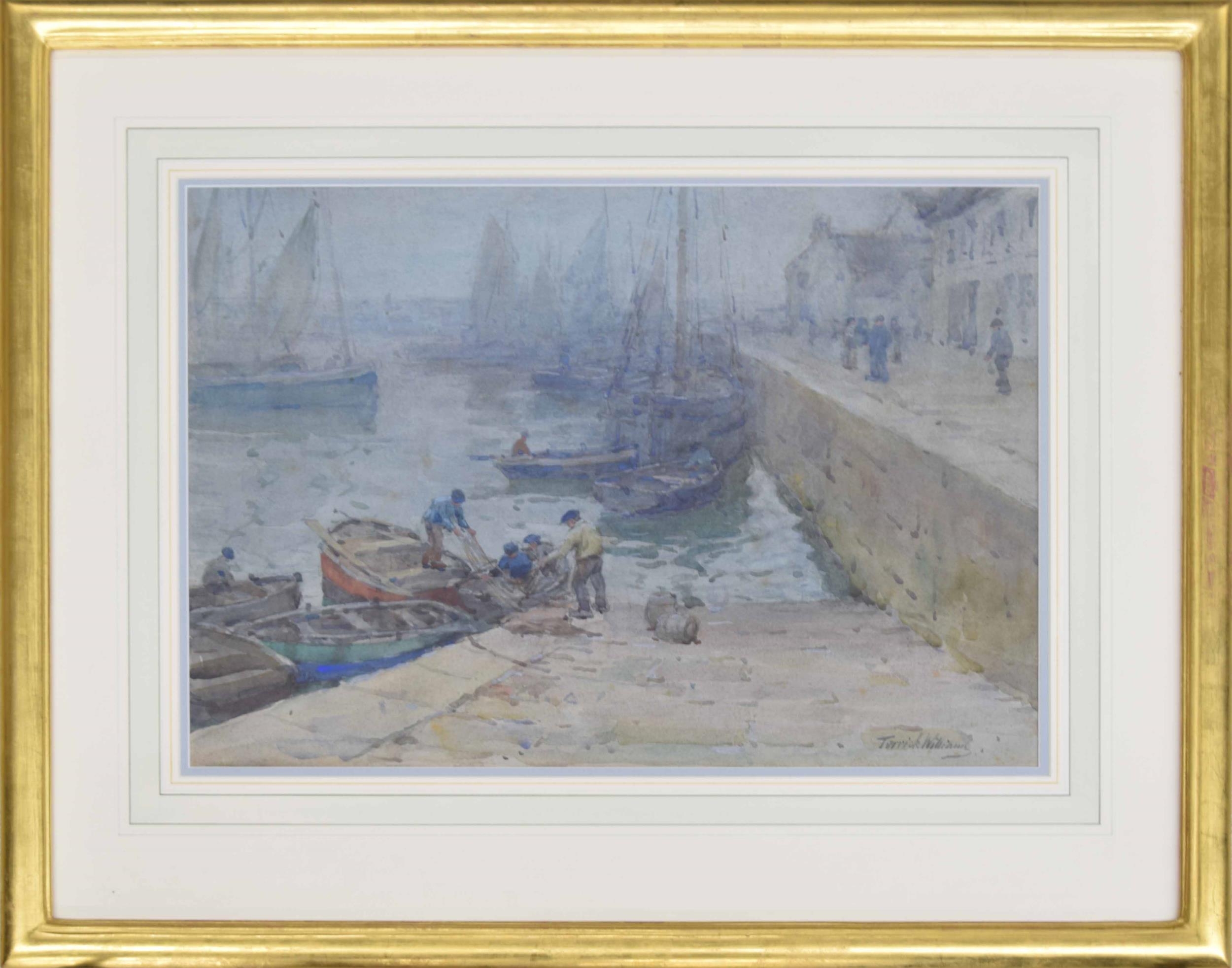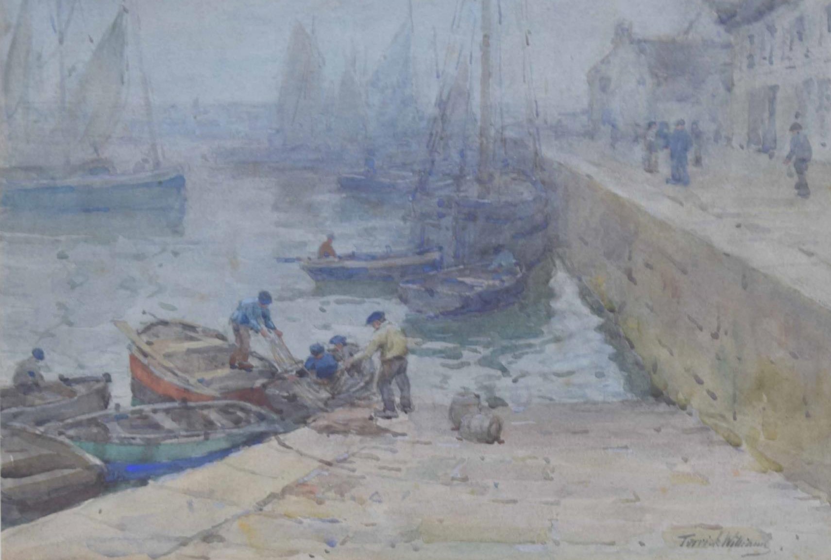 John Terrick Williams RA., RI., ROI., (1860-1936) - "Grey Morning", Audierne, Brittany, a harbour scene with figures and fishing boats, signed, pencil and watercolour, 13" x 18.5"